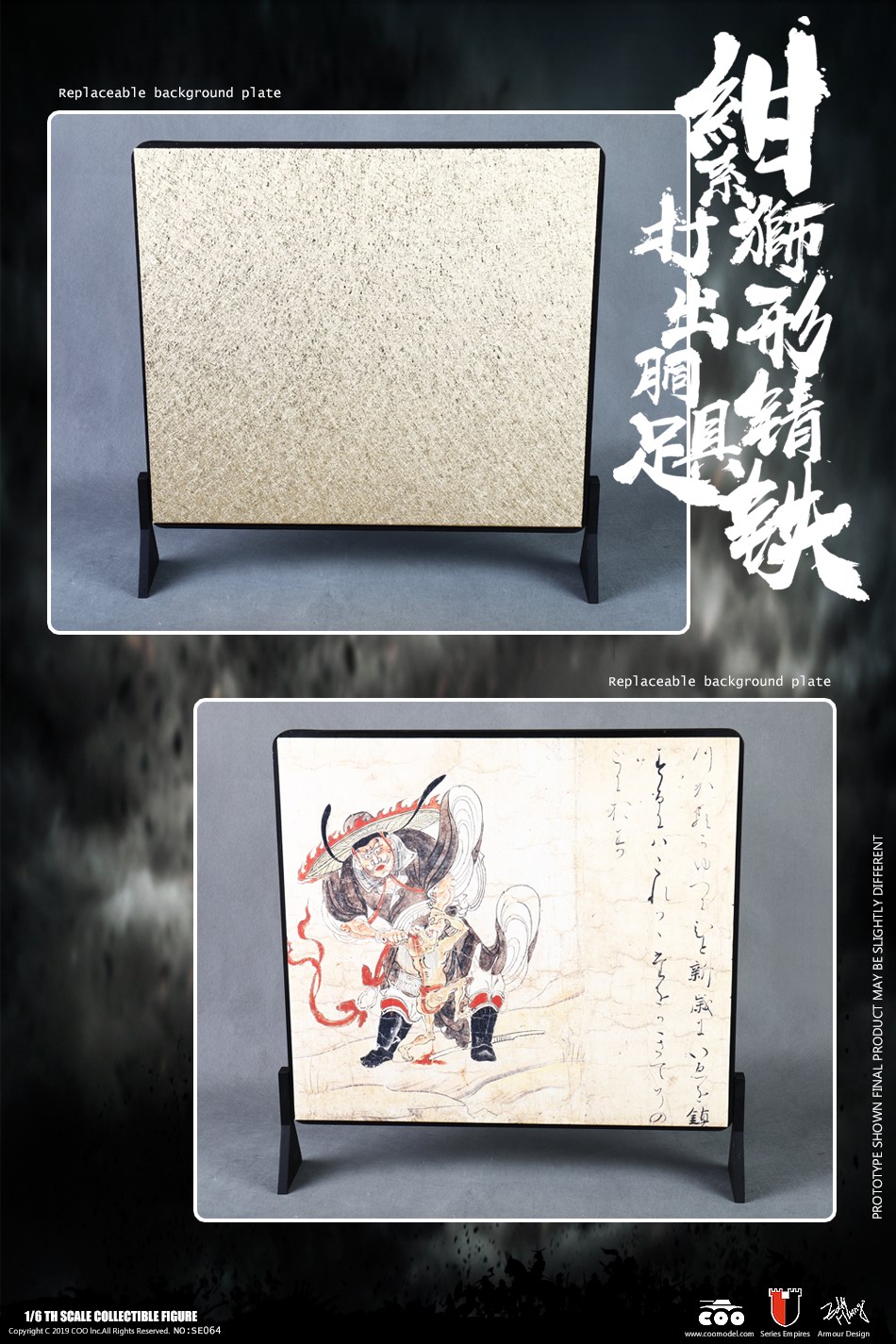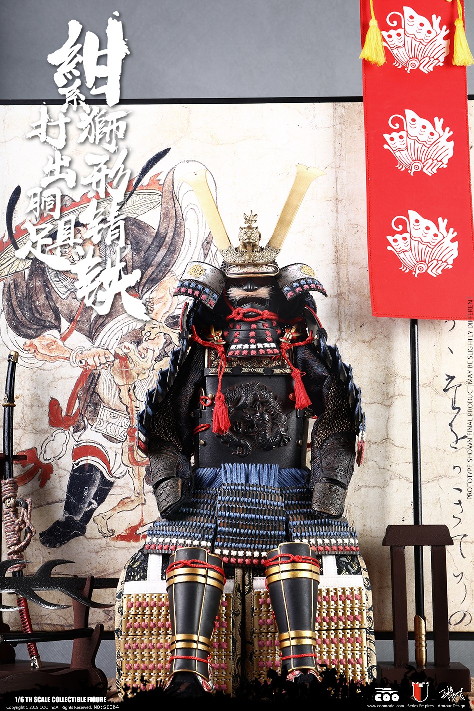 COOMODEL NO.SE064 1/6 SERIES OF EMPIRES (DIECAST ALLOY) - BLUE LION ARMOR (LEGENDARY VERSION)* The whole suit of armor is built of manually-attched clips, 100% alloy-made* Edges of swords are made of stainless steelThe 1/6th scale Blue Lion Armor Collectible Figure specially features:Armors:- One (1)black helmet with lion heraldry - One (1) black neck armor- One (1) suit of black armor- One (1) pair of blue-tied shoulder armors- One (1) pair of black vambraces- One (1) pair of blue-tied cuishes- One (1) pair of gold side-leg armors- One (1) pair of black jambeaus- One (1) gray-green armor tie- One (1) pair of black shoesWeapons:- One (1) katana (long sword)- One (1) black katana scabbard- One (1) wakizashi (short sword)- One (1) black wakizashi scabbard- One (1) fire-shaped sword- One (1) gold spear- One (1) red fanDisplay Parts:- One (1) tatami display base- One (1) interchangeable screen (ancient painting / goldleaf)- One (1) armor box- One (1) armor stand- One (1) red flag- One (1) flag stand- One (1) weapon stand- One (1) katana stands- One (1) armor sign