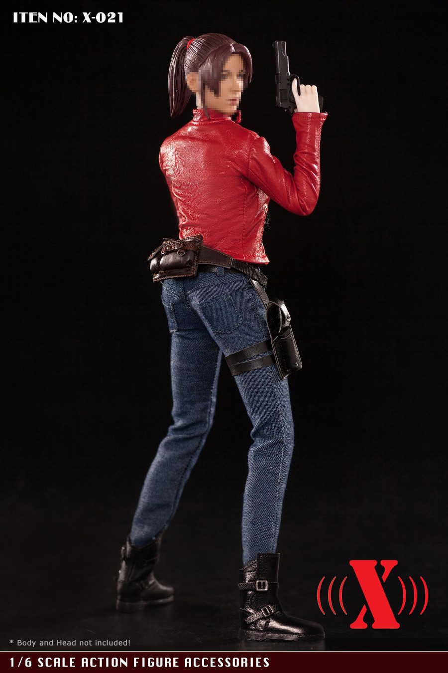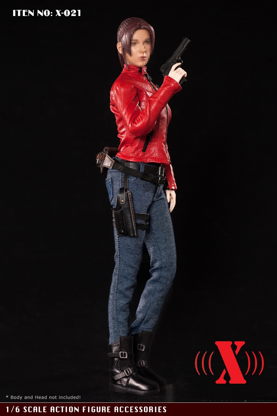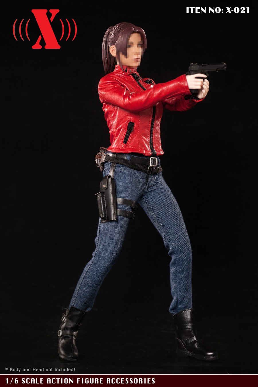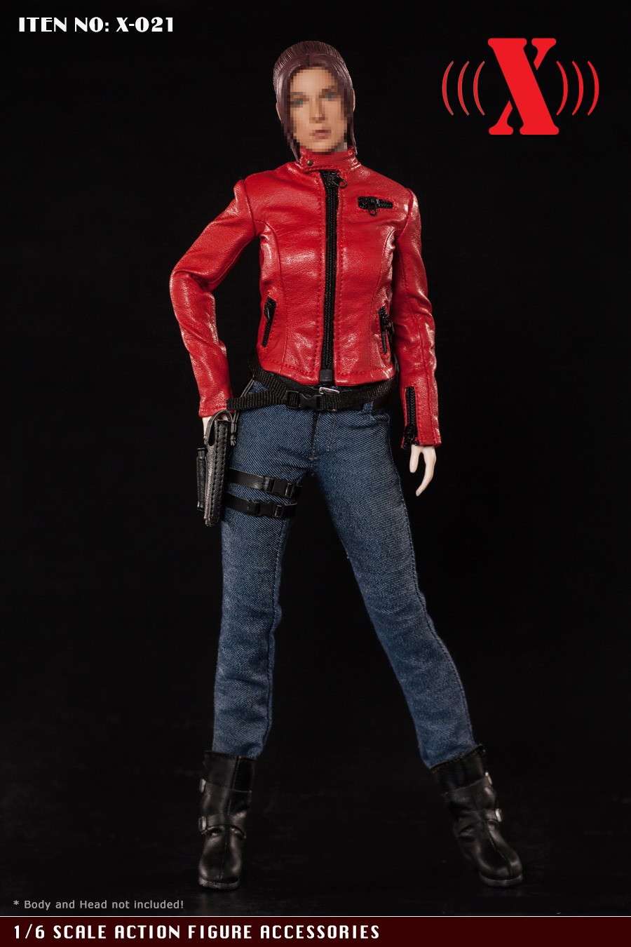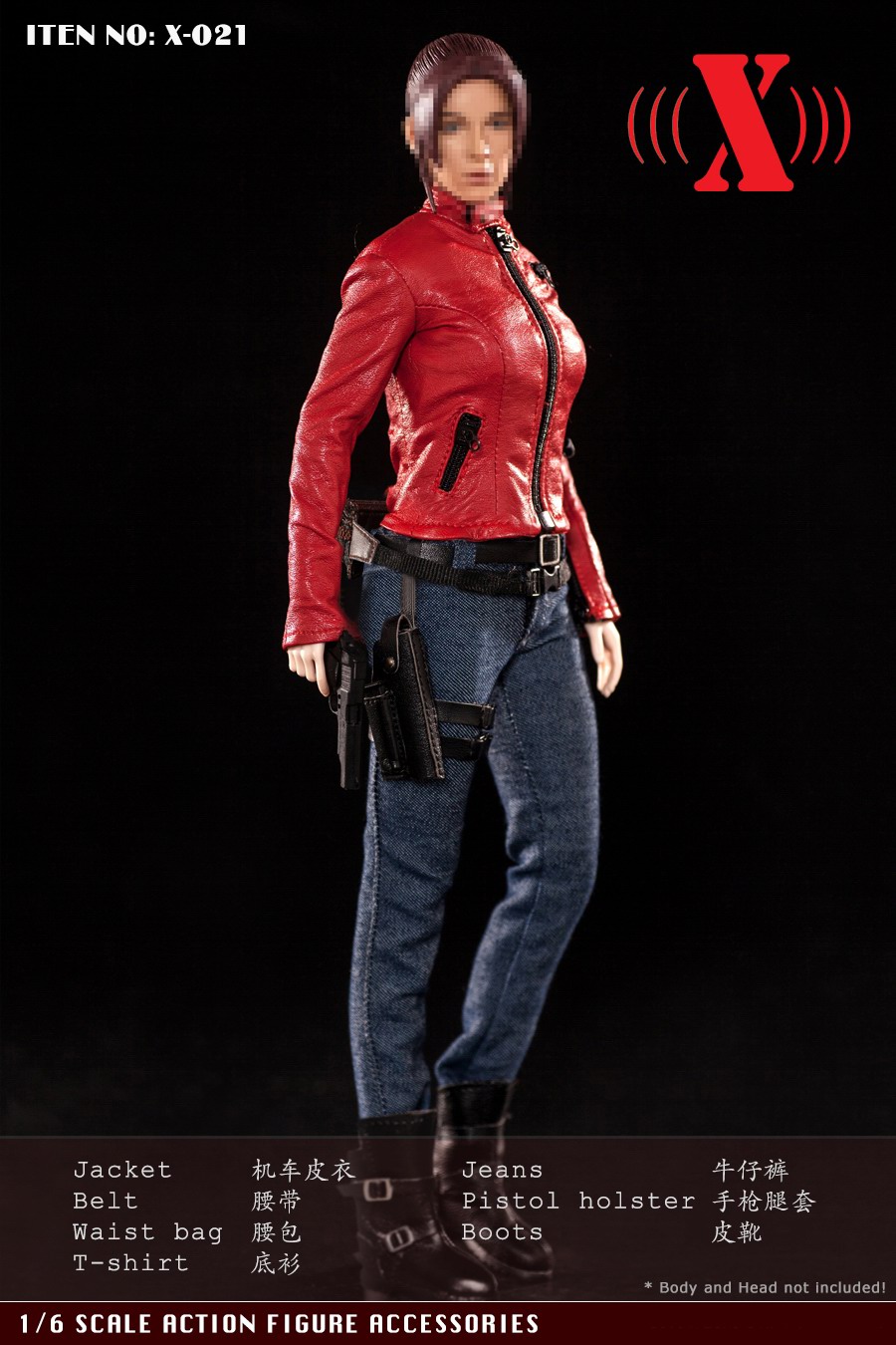 X-TOY (X-021) 1/6 red locomotive women's suit accessories list:1. A motorcycle leather jacket Highly detailed Jacket * 1pc2. Jeans * 1pc3. Belt Belt * 1pc4.Leg pistol holster * 1pc5. One back bag * 1pc6. A pair of shoes (without feet) Boots (designed for a bare flat foot) * 1pr7. T-shirt * 1pc* This product is suitable for thorax body in plastic, this product does not contain weapons, female body and female head carving.
