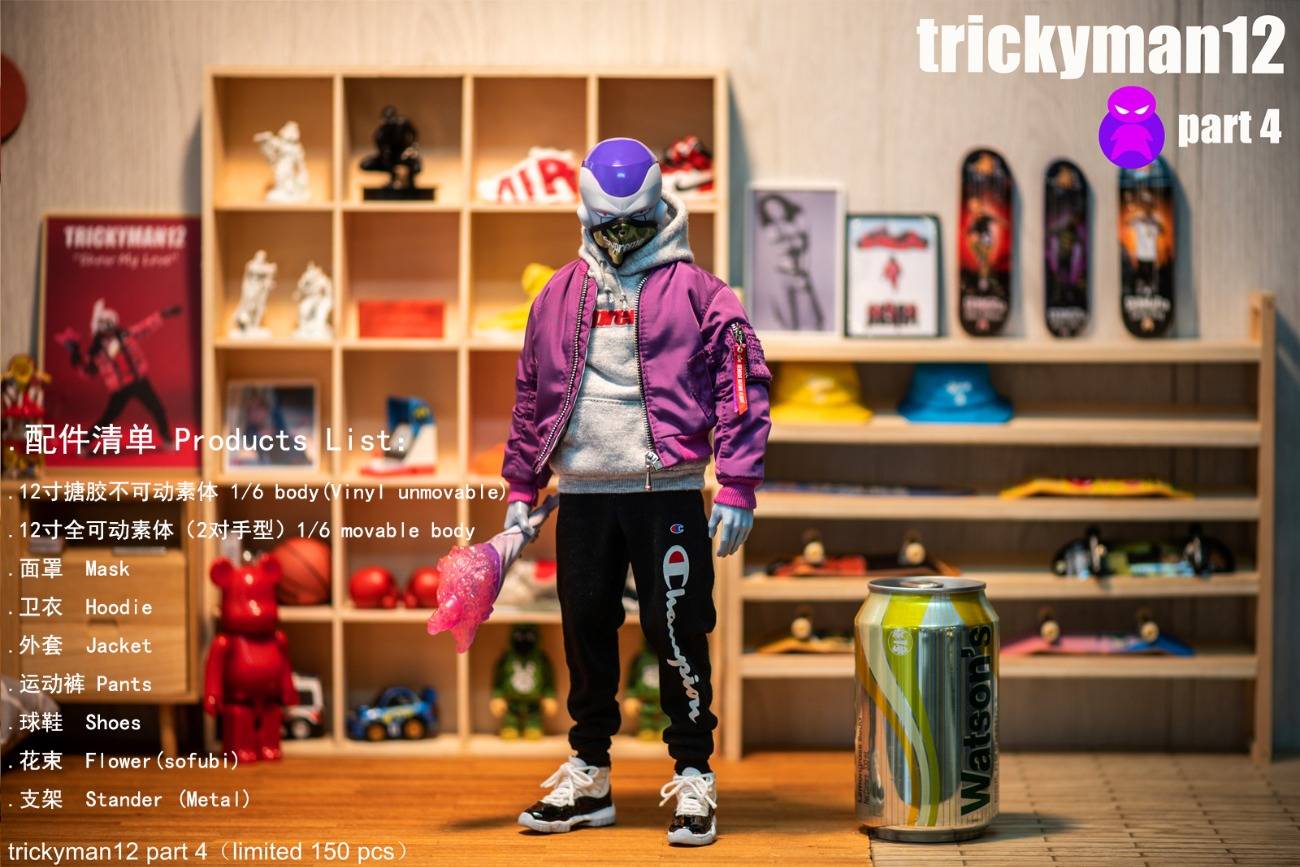 Trickyman12 part 4 is limited to 150 bodies.Ships in April 2020 and is now open for pre-order!Pre-order price: 1280 yuan / body Spot sale price: 1380 yuan / bodyList of accessories: 12-inch vinyl non-movable body.12-inch fully movable body (2 hand type) Mask, sweater, jacket, sports pants, sneakers, bouquets,bracket