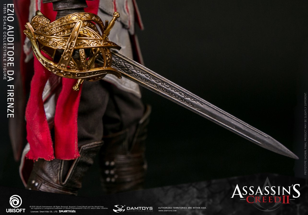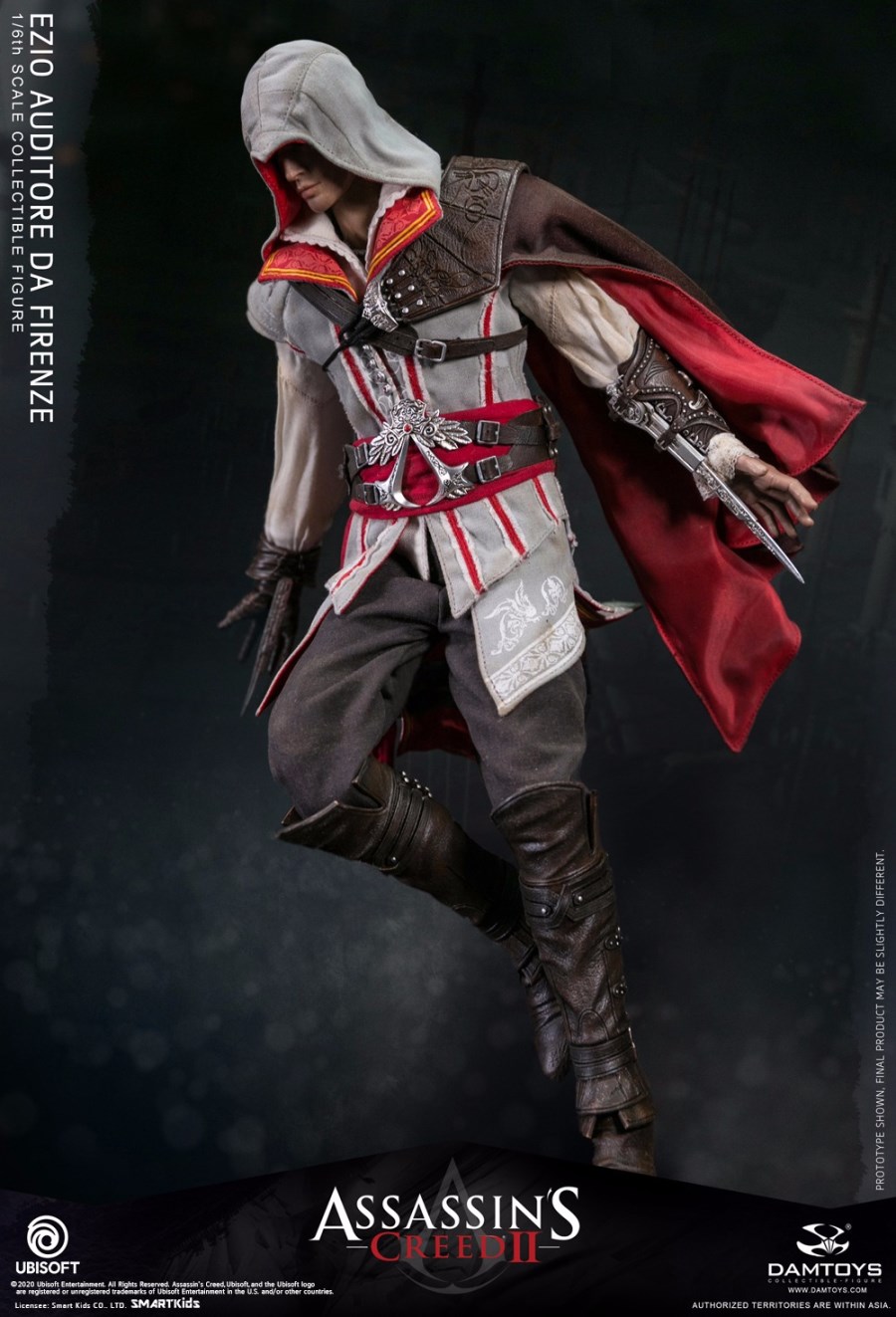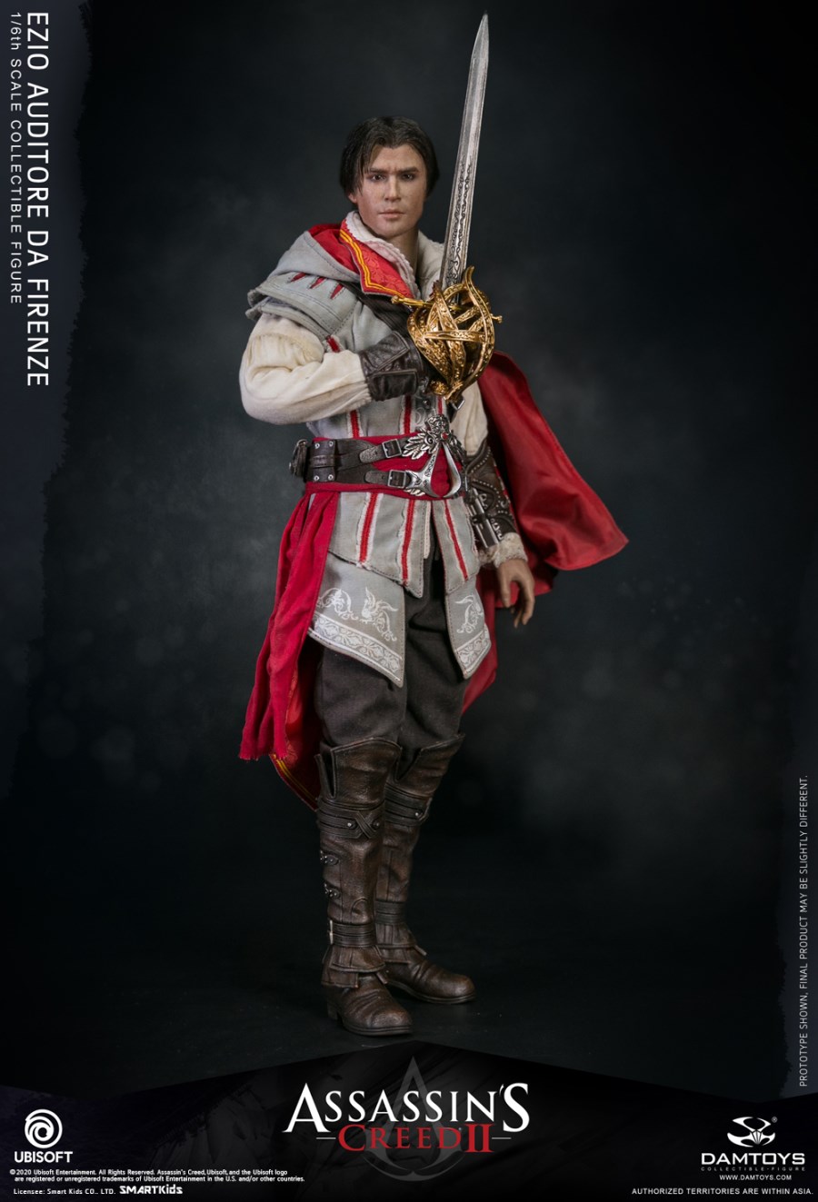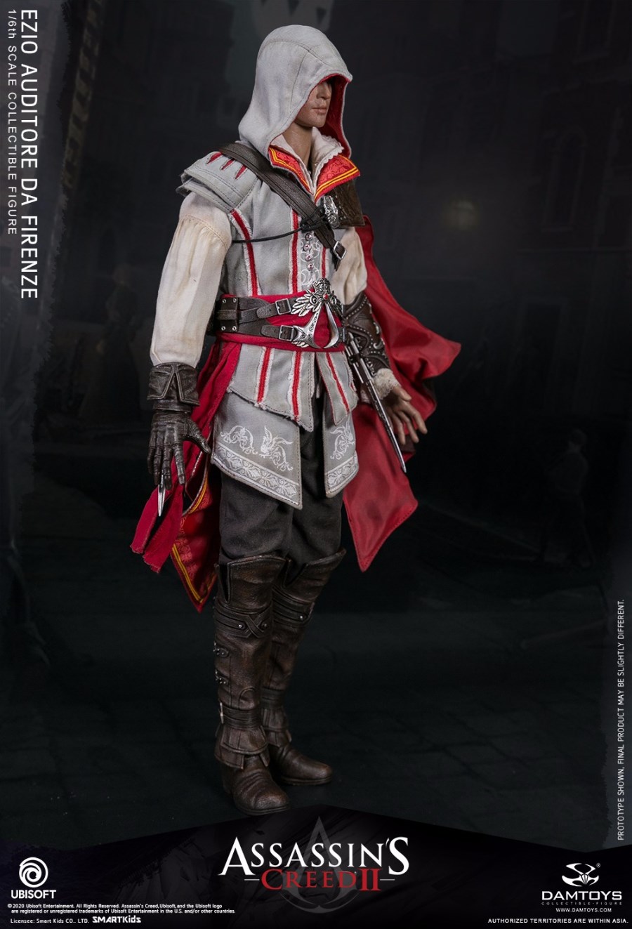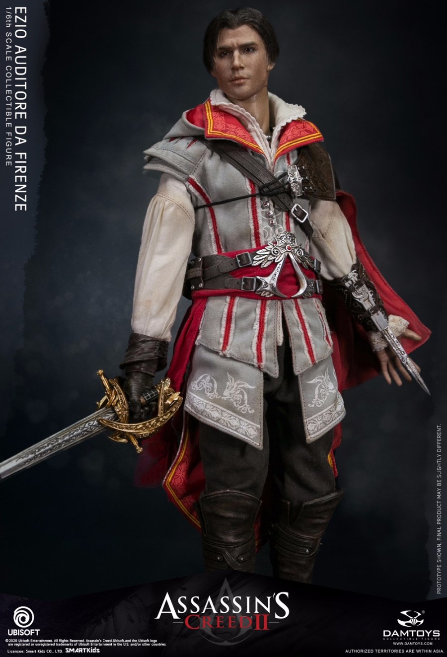 Damtoys 1/6th scale Assassin's Creed II– Ezio Collectible Figure SpecificationsNO.DMS012CODE:6970569621449Special features of the 1/6th scale Ezio Collectible Figure:-Highly detailed head sculpture-DAM muscle action body-Eight (8) pieces of interchangeable hands including:-One (1) right hand for holding sword(right hand with glove)-One (1) left hand for holding Apple of Eden-One (1) pair of open hands(right hand with glove)-One (1) pair of fists(right hand with glove)-One (1) pair of relaxed hands(right hand with glove)Costumes:-One (1) creamy white colored shirt-One (1) brown colored cape with leather-like pauldron-One (1) grey colored jackets with red colored stripe(hood included in a jacket)-One(1) brown colored belts with metal-like buckle-Three (3) brown colored leather-like pouches-One (1) red colored scarf put under belts-One (1) pair of brown colored pants-One (1) pair of brown colored forearm gauntlets where hidden blades can be put insde-One (1) pair of brown colored bootsWeapons:-One (1) metal-like Schiavona sword-Two (2) metal-like hidden bladesAccessories:-Apple of Eden-Specially designed figure stand with game logo