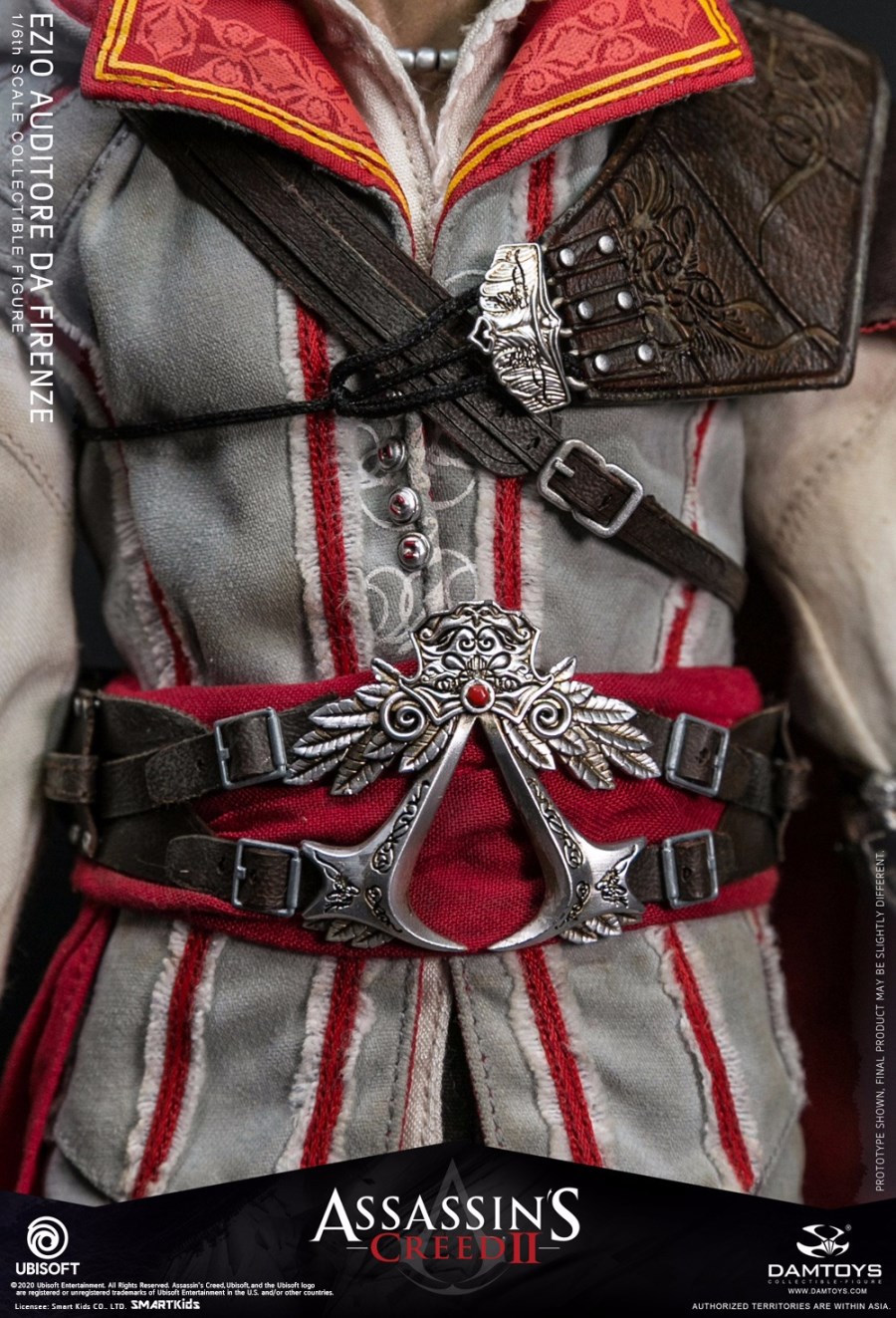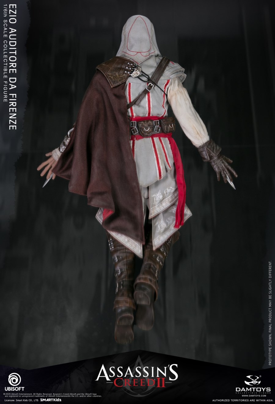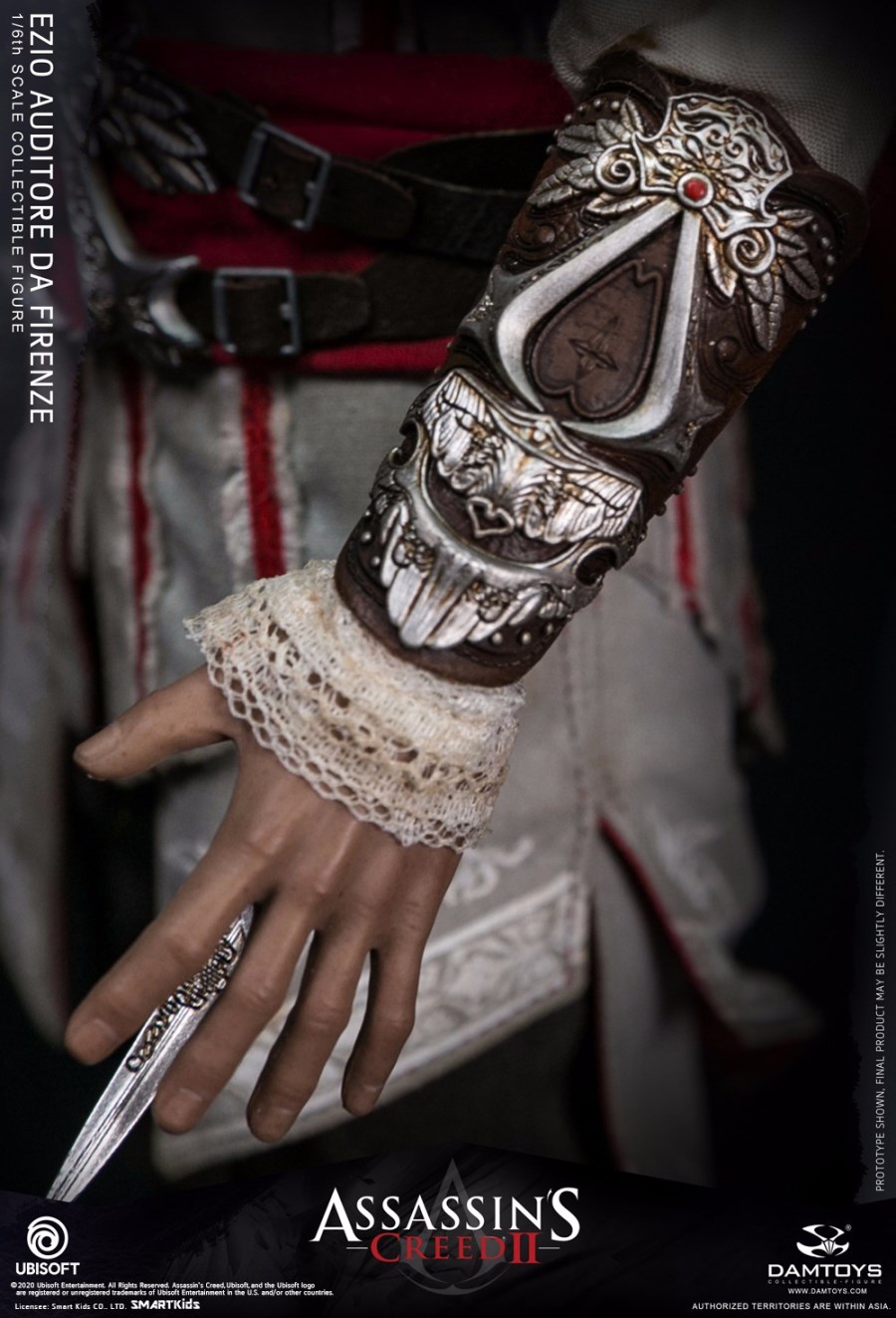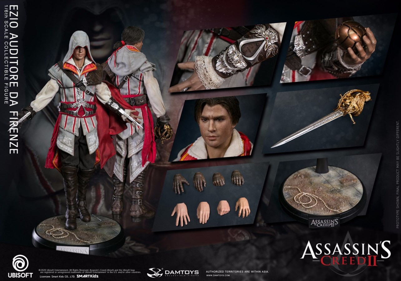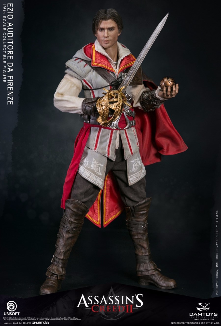 Damtoys 1/6th scale Assassin's Creed II– Ezio Collectible Figure SpecificationsNO.DMS012CODE:6970569621449Special features of the 1/6th scale Ezio Collectible Figure:-Highly detailed head sculpture-DAM muscle action body-Eight (8) pieces of interchangeable hands including:-One (1) right hand for holding sword(right hand with glove)-One (1) left hand for holding Apple of Eden-One (1) pair of open hands(right hand with glove)-One (1) pair of fists(right hand with glove)-One (1) pair of relaxed hands(right hand with glove)Costumes:-One (1) creamy white colored shirt-One (1) brown colored cape with leather-like pauldron-One (1) grey colored jackets with red colored stripe(hood included in a jacket)-One(1) brown colored belts with metal-like buckle-Three (3) brown colored leather-like pouches-One (1) red colored scarf put under belts-One (1) pair of brown colored pants-One (1) pair of brown colored forearm gauntlets where hidden blades can be put insde-One (1) pair of brown colored bootsWeapons:-One (1) metal-like Schiavona sword-Two (2) metal-like hidden bladesAccessories:-Apple of Eden-Specially designed figure stand with game logo