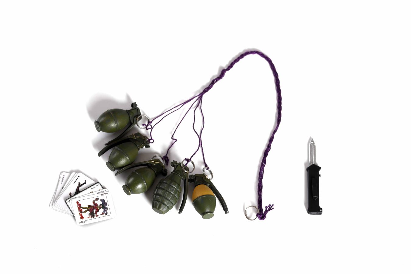 Product List:Hair transplant head X1Body x1Purple coat x1Gray suit top x 1 pieceFlower shirt x1Green Vest x1Flower tie x1Trousers x1Belt x1Leather shoes x1 pairUnderwear x1X1 pair of socksReplaceable hand x9Poker x1 ViceStand x1Grenade x 5Beach x1Submachine gun x 1Spring knife x 1Pistol x1