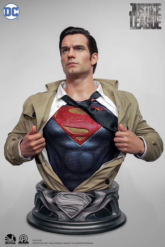 Superman, the first ever super hero in the world. This Superman 1/1 bust was authorized by Warner Bros., designe d and made by Infinity Studio, modeling based on the most classic senery that he changes from reporter to Superm an. The statue is 88cm height, head sculpt and arm skin are all made by medical grade platinum silicone, hairs and moustache are punched with artificial hair, almost 100,000 hairs, were punched manual one by one, meanwhile, we customized blue ocular prosthesis specially, aimed at revive this super hero who represents justice by our utmost.