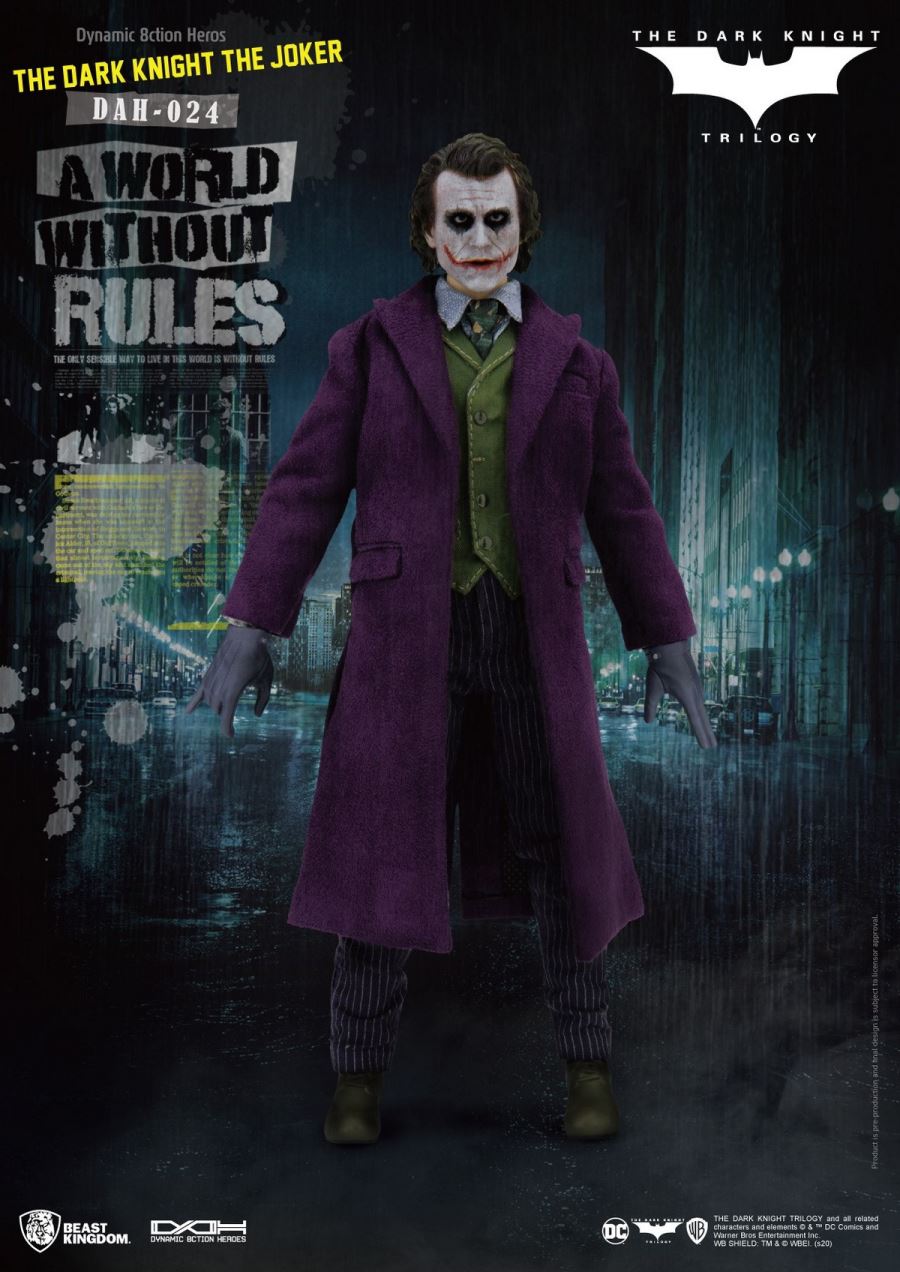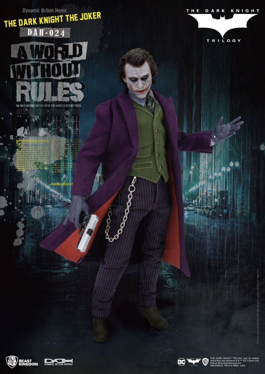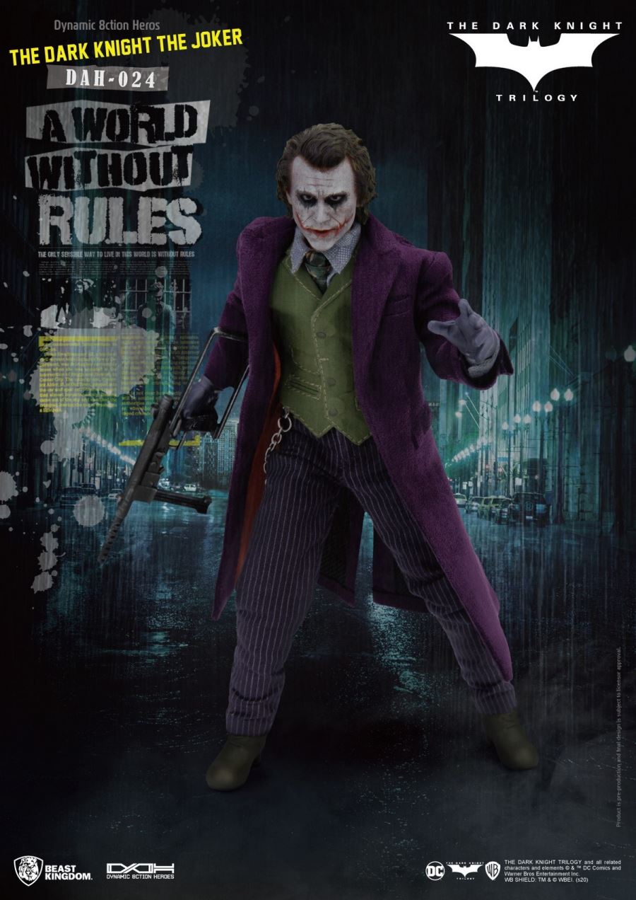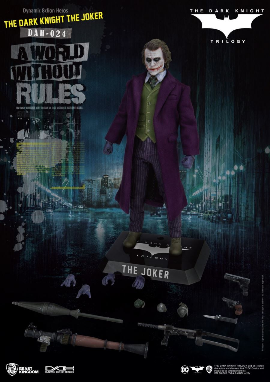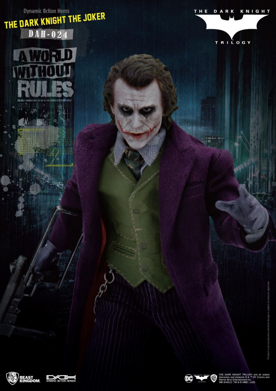 Beast Kingdom, The Entertainment Experience Brand มีความภูมิใจที่จะแนะนำ D.A.H (Dynamic 8ction Heroes) 1/9 ล่าสุดจากแอ็คชั่นที่สองในไตรภาคเดอะลอร์ Batman ของ Christopher Nolan The Dark Knight: Joker มี 28 ข้อในการประกบกันทำให้แฟน ๆ และนักสะสมได้รับสิ่งที่ดีที่สุดในการออกแบบที่เป็นไปได้และสมจริง ในทางกลับกันมีการให้ความสำคัญเป็นอย่างมากกับเสื้อผ้าของ The Joker ซึ่งเป็นสิ่งที่ตัวละครภูมิใจในตัวเองทุกอย่างตั้งแต่การเย็บไปจนถึงปุ่มที่มีรายละเอียดโซ่โลหะที่แท้จริงและอีกมากมายถูกสร้างขึ้นใหม่อย่างสวยงาม รูปปั้นหัวหน้าละเอียดนำความคลั่งไคล้ของ The Joker มาสู่ชีวิตจริง ในที่สุดอย่าลืม D.A.H ที่รวมลายเซ็นของเครื่องประดับไว้ด้วยกันรวมถึงมือสี่ชุดปืนพกปืนยิงจรวดระเบิดมือและอีกมากมายหมายความว่านักสะสมไม่ขาดแคลนวิธีในการสร้างฉากที่พวกเขาชื่นชอบจากภาพยนตร์