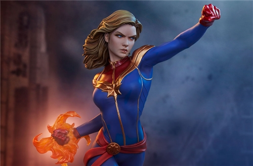 ABOUT THIS STATUE“Don’t you ‘lady’ me, son. I’m an Avenger.”Sideshow presents the Captain Marvel Statue, taking the Avengers Assemble Statue Collection even higher, further, faster than before.Inspired by some of Marvel’s most iconic characters, the 1:5 scale Avengers Assemble collection captures the colorful and battle-ready styles of Earth’s Mightiest Heroes!The polyresin Captain Marvel statue measures 16” tall as Carol Danvers launches herself skyward, prepared to let loose a powerful photon blast from her right fist as she leaves a trail of orange and yellow energy in her wake. This fearless fighter is prepared to punch holes in the sky to overcome even the deadliest of foes. Captain Marvel's iconic blue, red, and gold uniform is fully sculpted and features windswept red sashes and a raised gold Hala star on her chest. Her long-haired portrait captures the stern determination of this former Air Force pilot-turned-Avenger, making her a mighty addition to your Marvel collectibles.Pair Captain Marvel with her allies like Captain America, Black Widow, and Iron Man, or pit her against the villainous Thanos to create an earth-shattering showdown on your shelf. Each of the Avengers Assemble Statue Collection features a rubble-covered proximity base that stands alone or complements others to create an atmospheric battle environment.ArtistsIgor Catto (Sculpt)David Igo (Design)Richard Luong (Design)Ian MacDonald (Design)Chie Izuma (Paint)The Sideshow Design and Development Team (Development)