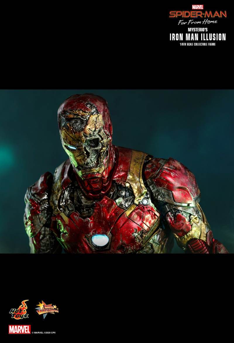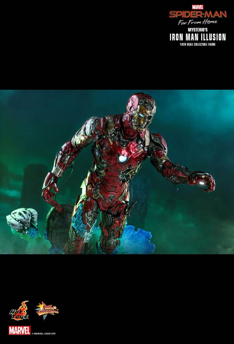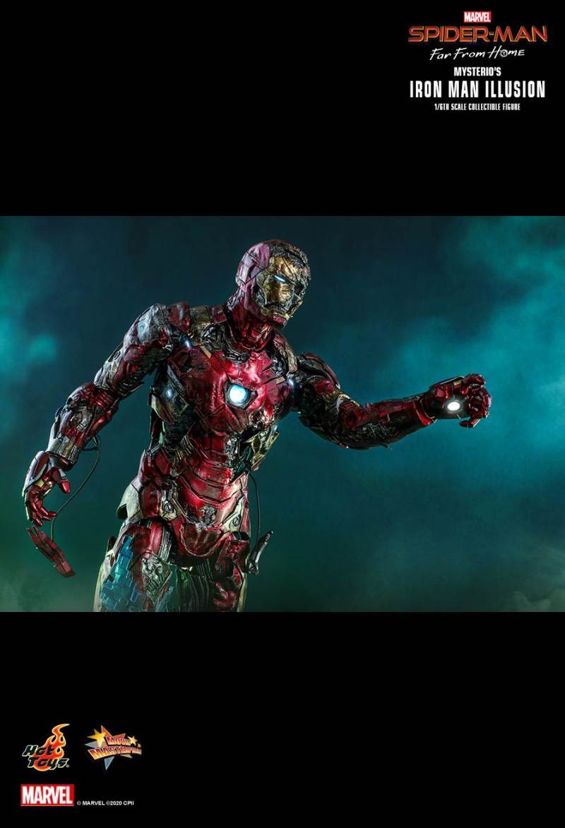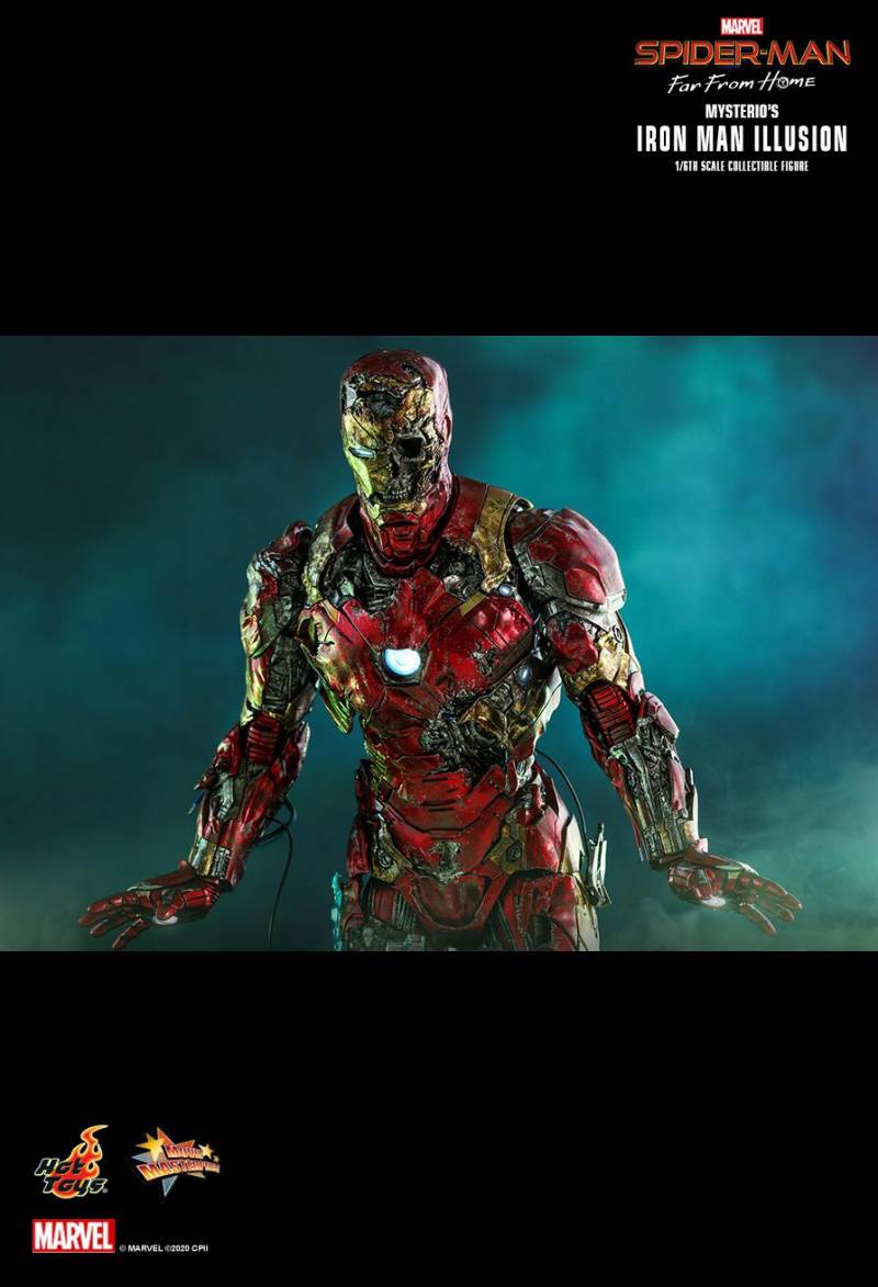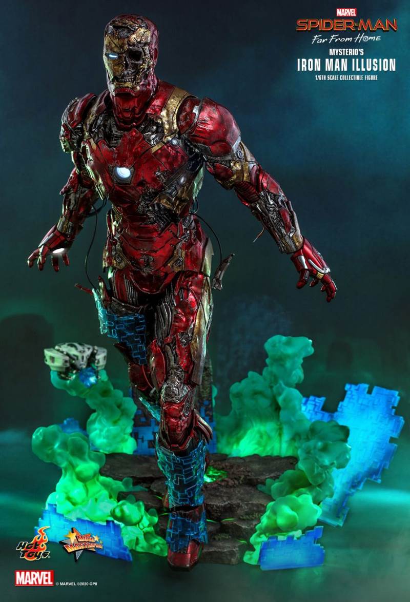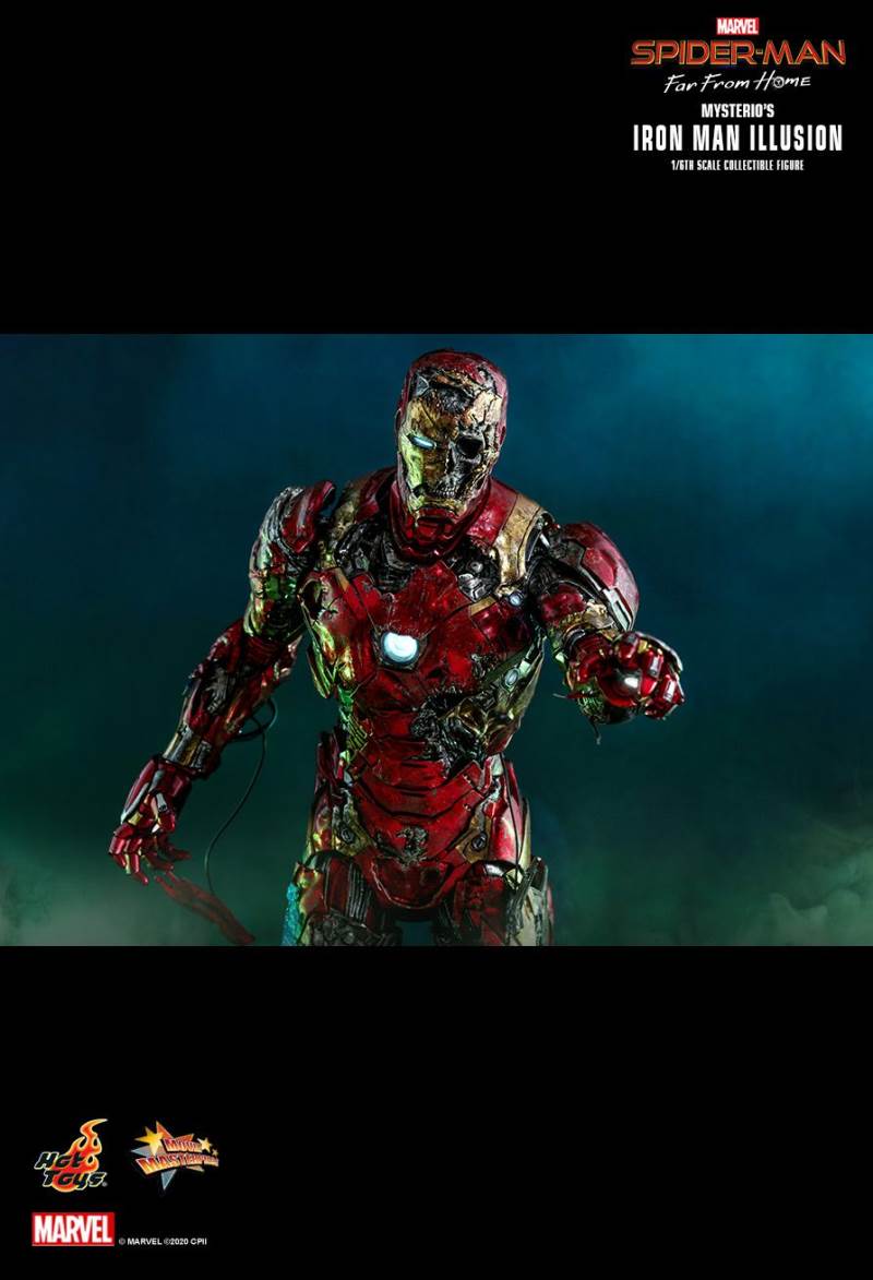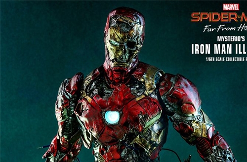 รายละเอียดที่น่าเหลือเชื่อนั้นสร้างขึ้นจาก Iron Man Illusion ของ Mysterio ในภาพยนตร์มีเอฟเฟกต์สภาพอากาศรุนแรงพร้อมรอยขีดข่วนและสนิม โดยรวมทาสีอย่างเชี่ยวชาญสีแดงเมทัลลิทองและสีเงินเกราะกัดกร่อน; หัวหมวกนิรภัยที่พัฒนาขึ้นใหม่อย่างรุนแรงพร้อมฟังก์ชั่นไฟส่องสว่างแบบ LED เผยให้เห็นกะโหลกบางส่วนทางซ้าย สายเปิดเผยที่แนบมากับเกราะ Iron Man ที่แตกละเอียดเผยรายละเอียดเชิงกลที่ดี ฟังก์ชั่นส่องสว่าง LED บน Arc Reactor ที่หน้าอกและมือ สุดท้าย แต่ไม่ท้ายสุดฐานรูปทรงภาพสามมิติที่มีรายละเอียดสูงซึ่งได้รับแรงบันดาลใจจากการต่อสู้แบบหลอนด้วยการออกแบบฟังก์ชั่นไฟ LED มาพร้อมกับเอฟเฟกต์ควันดำและสีเขียว และอุปกรณ์เสริมเอฟเฟกต์แบบพิกเซลเพื่อให้การตั้งค่าภาพน่าทึ่ง