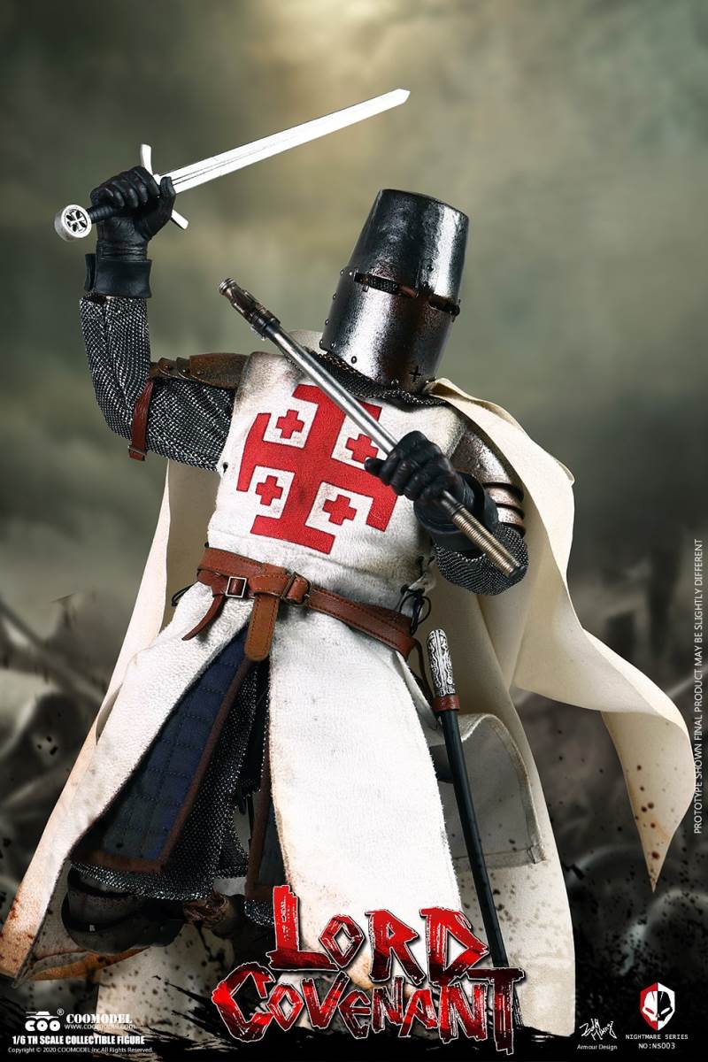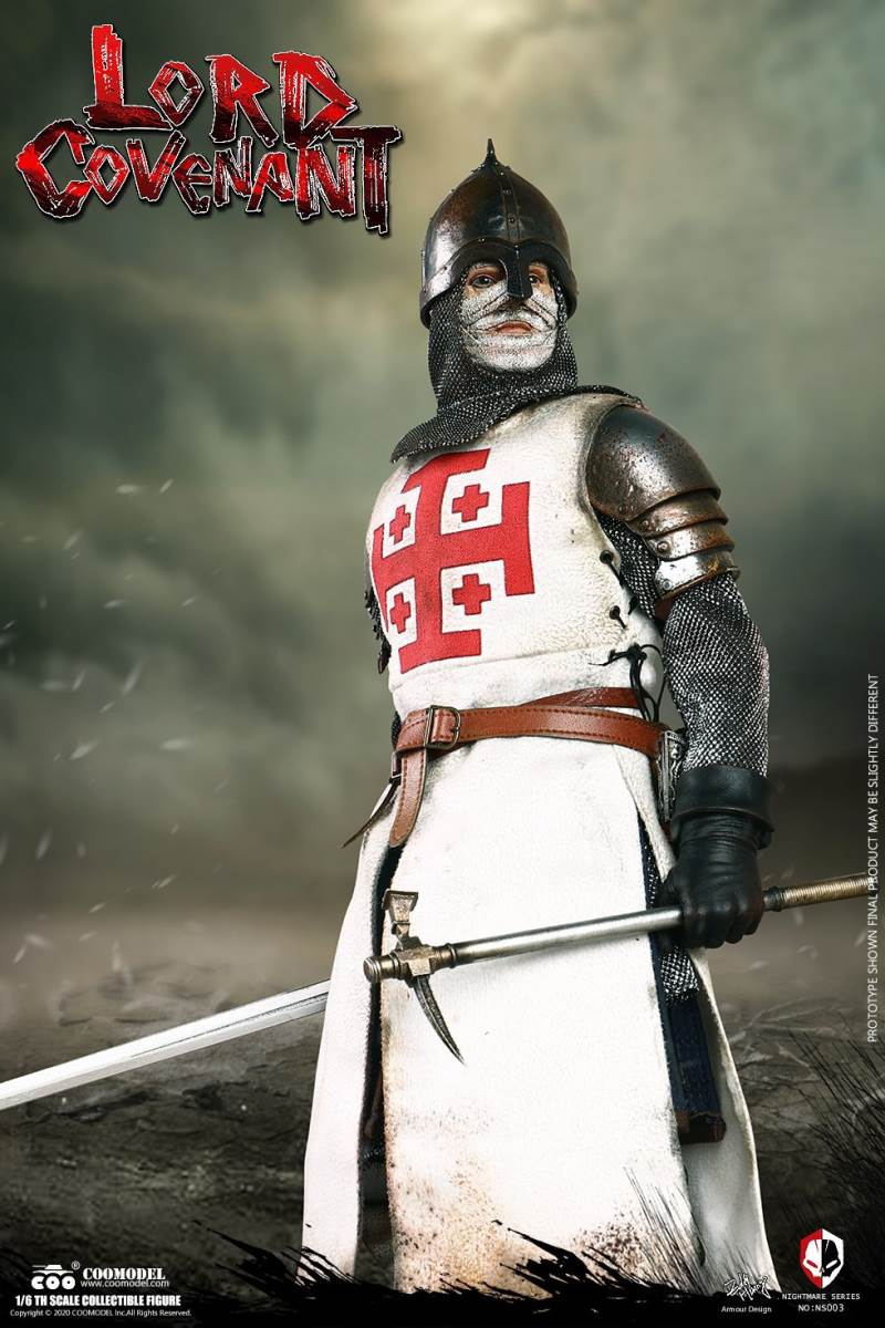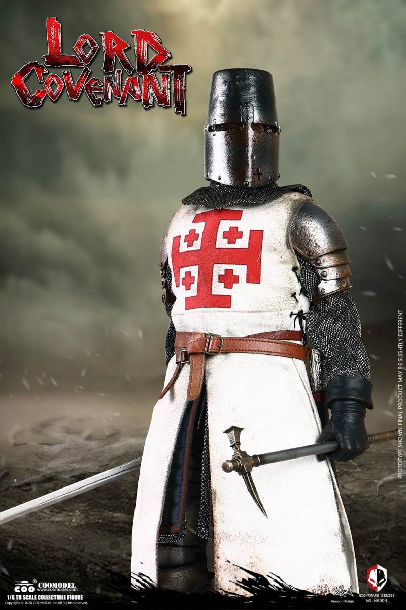 COOMODEL 1/6 NS003 NIGHTMARE SEIRES (DIECAST ALLOY) - LORD COVENANTBARCODE:The 1/6 Scale Lord Covenant Action Figure Specially Features:- One (1) bandaged head sculpt- One (1) zombie body- Four (4) pieces of interchangeable gloved palmsCostumes:- One (1) black shirt- One (1) pair of black short pants- One (1) pair of leather bootsArmors:- One (1) head-covering chain armor- One (1) helmet- One (1) bucket-liked helmet- One (1) mask- One (1) suit of upper-body chain armor- One (1) blue gambeson- One (1) white robe- One (1) pair of thigh armor- One (1) pair of leather belts- One (1) white hoodie cloakWeapons:- One (1) sword with scabbard- One (1) war pickaxeAccessories:- One (1) black figure stand