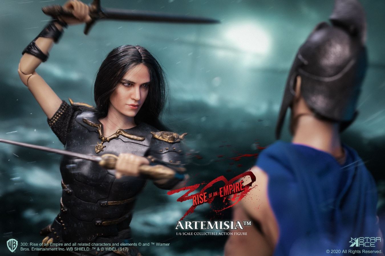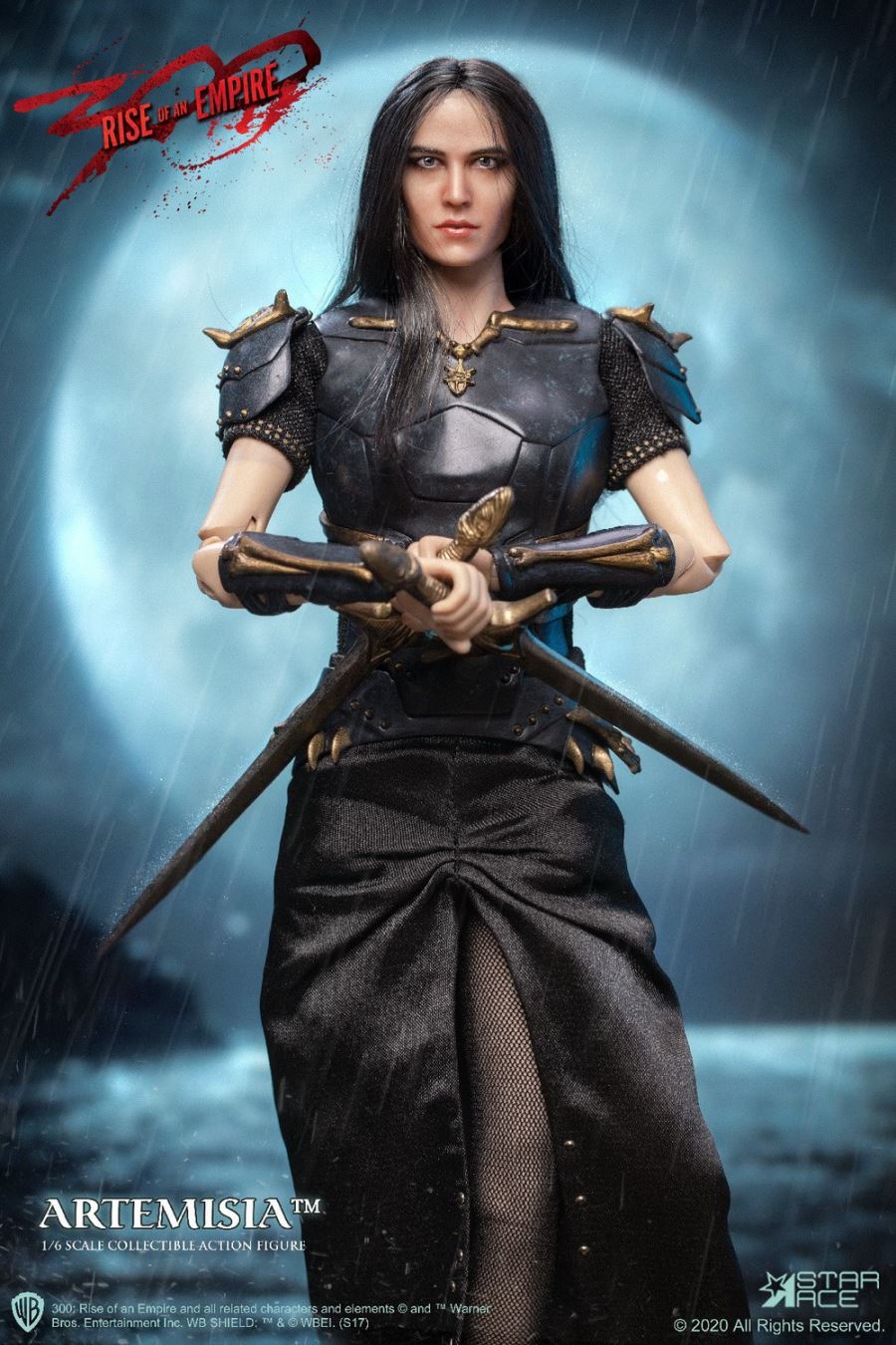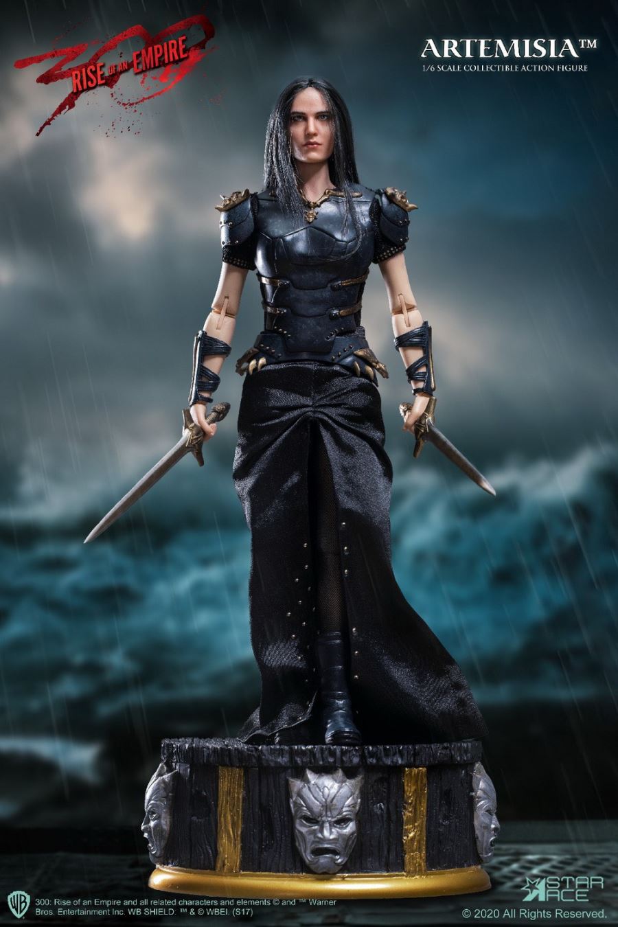 PRODUCT CODE SA0045X (with Diorama) / SA0045C (no Diorama)PRODUCT NAME Artemisia 3.0 Limited EditionSCALE 1/6 SCALE (APPROX. 29 CM HEIGHT)SERIES MY FAVOURITE MOVIE SERIESStar Ace presents the extremely limited Deluxe Edition Sixth Scale Figure of Artemisia from the movie 300: Rise of an Empire.This version of Eva Green as the ruthless leader of the Persian Armada features a new polyresin display base decorated with the masks of the Immortals, the Persian assassination squad. The base has a flexible metal support rod for achieving any action pose.This Deluxe version also features an enhanced head painting technique used from a new paint master and sewn-in fabric hair. This officially licensed Sixth Scale figure has Artemisia in her leather battle armor and is equipped with multiple weapons. This special deluxe edition of Artemisia is limited to only 300 pieces, so do not miss your chance to add her to your 300 collection!The 1/6th scale General Artemisia 3.0 Collectible figure features:-1:6th scale body, approximately 29 cm tall with over 30 points of articulation- Fully realized authentic likeness of Eva Green as General Artemisia in the movie “300 : Rise of an Empire” with accurate facial expression and detailed skin texture-Each head sculpt is specially hand-painted with rooted hairPARTS:- Five (5) interchangeable hands including:- One (1) pair of open hands;- One (1) right hand for holding bow, sword or dagger- One (1) left hand for holding sword- One (1) left hand for holding the arrowCOSTUME:- One (1) Black shirt with gold printing- One (1) Black skirt- One (1) Black chest armor- One (1) Black belt- One (1) set arm bracers- One (1) set shoulder bracers- One (1) pair of black shoesACCESSORIES:- Two (2) Swords- One (1) Dagger- One (1) Bow- One (1) ArrowFIGURE STANDOne (1) Polyresin Diorama with bendable clip (SA0045X – Limited Edition for 300 pcs)One (1) stand (SA0045C – without diorama)Release Date: Q4, 2020**PROTOTYPE SHOWN, FINAL PRODUCT MAY BE SLIGHTLY DIFFERENT**PRODUCT DETAILS SUBJECT TO CHANGE WITHOUT NOTICE300: Rise of an Empire characters, names and related indicia are (C) & TM Warner Bros. Entertainment Inc..TM & (C) WBEI (s20)(C) 2020 Star Ace Toys Limited. All Rights Reserved.