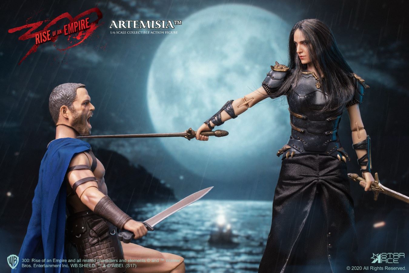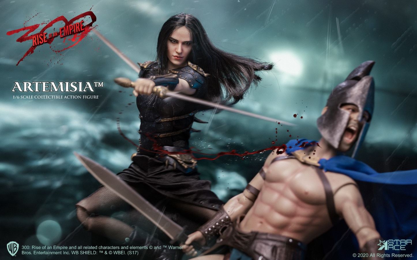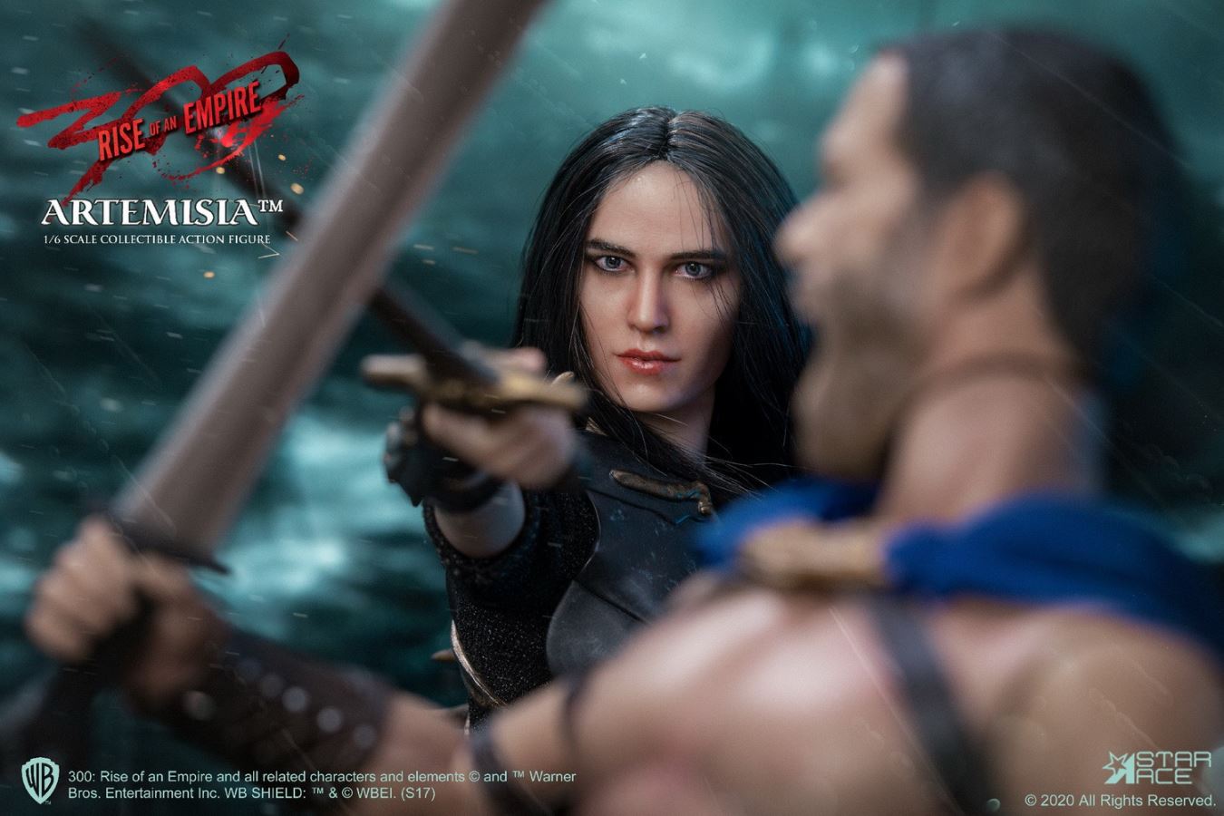 PRODUCT CODE SA0045X (with Diorama) / SA0045C (no Diorama)PRODUCT NAME Artemisia 3.0 Limited EditionSCALE 1/6 SCALE (APPROX. 29 CM HEIGHT)SERIES MY FAVOURITE MOVIE SERIESStar Ace presents the extremely limited Deluxe Edition Sixth Scale Figure of Artemisia from the movie 300: Rise of an Empire.This version of Eva Green as the ruthless leader of the Persian Armada features a new polyresin display base decorated with the masks of the Immortals, the Persian assassination squad. The base has a flexible metal support rod for achieving any action pose.This Deluxe version also features an enhanced head painting technique used from a new paint master and sewn-in fabric hair. This officially licensed Sixth Scale figure has Artemisia in her leather battle armor and is equipped with multiple weapons. This special deluxe edition of Artemisia is limited to only 300 pieces, so do not miss your chance to add her to your 300 collection!The 1/6th scale General Artemisia 3.0 Collectible figure features:-1:6th scale body, approximately 29 cm tall with over 30 points of articulation- Fully realized authentic likeness of Eva Green as General Artemisia in the movie “300 : Rise of an Empire” with accurate facial expression and detailed skin texture-Each head sculpt is specially hand-painted with rooted hairPARTS:- Five (5) interchangeable hands including:- One (1) pair of open hands;- One (1) right hand for holding bow, sword or dagger- One (1) left hand for holding sword- One (1) left hand for holding the arrowCOSTUME:- One (1) Black shirt with gold printing- One (1) Black skirt- One (1) Black chest armor- One (1) Black belt- One (1) set arm bracers- One (1) set shoulder bracers- One (1) pair of black shoesACCESSORIES:- Two (2) Swords- One (1) Dagger- One (1) Bow- One (1) ArrowFIGURE STANDOne (1) Polyresin Diorama with bendable clip (SA0045X – Limited Edition for 300 pcs)One (1) stand (SA0045C – without diorama)Release Date: Q4, 2020**PROTOTYPE SHOWN, FINAL PRODUCT MAY BE SLIGHTLY DIFFERENT**PRODUCT DETAILS SUBJECT TO CHANGE WITHOUT NOTICE300: Rise of an Empire characters, names and related indicia are (C) & TM Warner Bros. Entertainment Inc..TM & (C) WBEI (s20)(C) 2020 Star Ace Toys Limited. All Rights Reserved.