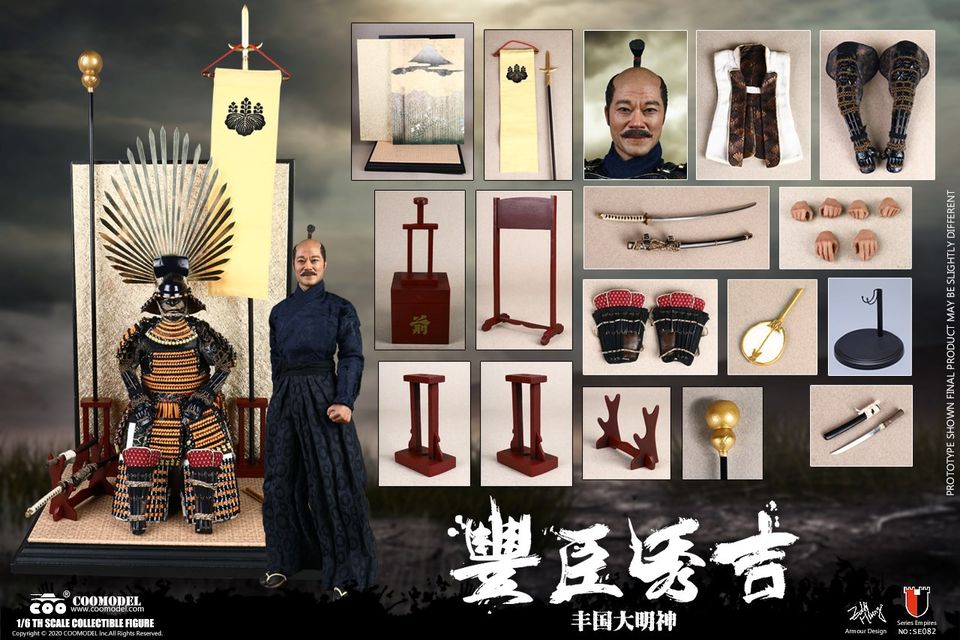 COOMODEL NO.SE081 1/6 SERIES OF EMPIRES - TOYOTOMI HIDEYOSHI (MASTERPIECE VERSION) BARCODE: 6971242121119* The suit of armor is built of manually-attched sheets, 100% copper-made* The swords are assembled by stainless steel blades and copper handles, after which are manually ropedThe 1/6th scale Toyotomi Hideyoshi Collectible Figure specially features:- One (1) realistic head sculpture of Toyotomi Hideyoshi- One (1) super action body- Six (6) Pieces of Interchangeable PalmsCostumes:- One (1) white shirt- One (1) blue coat- One (1) black band- One (1) pair of blue trousers- One (1) pair of black sandalsArmors:- One (1) purple helmet with indica heraldry- One (1) purple mask- One (1) purple neck armor- One (1) pair of purple shoulder armors- One (1) pair of purple vambraces- One (1) suit of purple upper-body armor- One (1) pair of purple cuishes- One (1) pair of black and red jambeaus- One (1) colorful armor tie- One (1) white war vestWeapons:- One (1) katana (long sword)- One (1) black katana scabbard- One (1) wakizashi (short sword)- One (1) black wakizashi scabbard- One (1) white fanAccessories:- One (1) black figure stand--------------------------------------------------------------------------------------------COOMODEL NO.SE082 1/6 SERIES OF EMPIRES - TOYOTOMI HIDEYOSHI (MAGNUM OPUS VERSION)BARCODE: 6971242121133* The suit of armor is built of manually-attched sheets, 100% copper-made* The swords are assembled by stainless steel blades and copper handles, after which are manually ropedThe 1/6th scale Toyotomi Hideyoshi Collectible Figure specially features:- One (1) realistic head sculpture of Toyotomi Hideyoshi- One (1) super action body- Six (6) Pieces of Interchangeable PalmsCostumes:- One (1) white shirt- One (1) blue coat- One (1) black band- One (1) pair of blue trousers- One (1) pair of black sandalsArmors:- One (1) purple helmet with indica heraldry- One (1) purple mask- One (1) purple neck armor- One (1) pair of purple shoulder armors- One (1) pair of purple vambraces- One (1) suit of purple upper-body armor- One (1) pair of purple cuishes- One (1) pair of black and red jambeaus- One (1) colorful armor tie- One (1) white war vestWeapons:- One (1) katana (long sword)- One (1) black katana scabbard- One (1) wakizashi (short sword)- One (1) black wakizashi scabbard- One (1) white fan-- One (1) gold spear-- One (1) yellow flag-- One (1) gold gourd-shaped hammerAccessories:- One (1) black figure standDisplay Parts:- One (1) black tatami display base- One (1) gold screen- One (1) moutain painting screen- One (1) armor box- One (1) armor stand- One (1) kimono stand- One (1) katana stand- Two (2) spear stands --------------------------------------------------------------------------------------------COOMODEL NO.SE083 1/6 SERIES OF EMPIRES - AUSHIUGUMA (STANDARD VERSION)BARCODE: 6971242121140The 1/6th scale Aushiuguma Steed specially features:- One (1) black steed, Aushiuguma- One (1) red bridle- One (1) red chest band- One (1) red hip band- One (1) set of red and black saddles- One (1) pair of red and stirrups --------------------------------------------------------------------------------------------COOMODEL NO.SE084 1/6 SERIES OF EMPIRES - AUSHIUGUMA (EXCLUSIVE VERSION)BARCODE: 6971242121157* The suit of armor is built of manually-attched metal sheets* The horse helmet is built of die-cast alloyThe 1/6th scale Aushiuguma Steed specially features:- One (1) black steed, Aushiuguma- One (1) red bridle- One (1) red chest band- One (1) red hip band- One (1) set of red and black saddles- One (1) pair of red and stirrups- One (1) gold dragon-shaped horse mask- One (1) suit of gold horse armor --------------------------------------------------------------------------------------------