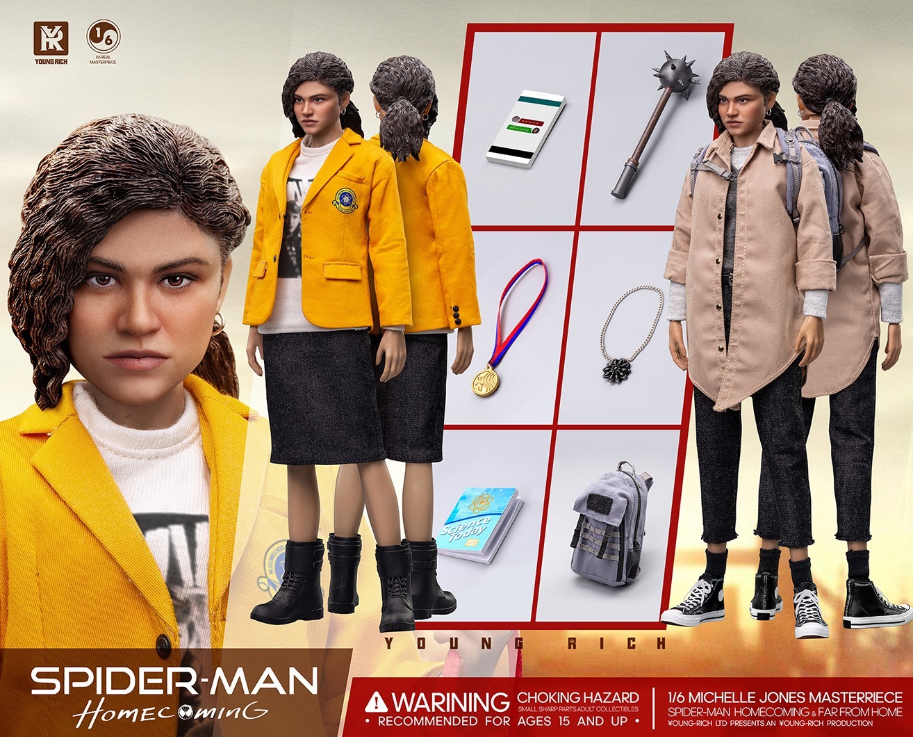 Young Rich TOYS YR010 1/6 MJ Spider-Man Michelle Jones Masterriece Product configuration list: (picture see official picture)· Calm head sculpture x1 (with earrings)·Special height female body x1·Hand x4 pairs·Black canvas shoes x1 pair·Black leather boots x1 pair·Short-sleeved T-shirt x1·Yellow suit x1·Denim skirt x1·Shirt x1·Gray vest x1·Long sleeve T-shirt x1·Jeans x1·Belt x1·Sock x1 pair·School bag x1·Medal x1·Mobile phone x1·Langya Hammer x1 pair·Necklace x1·Book x1