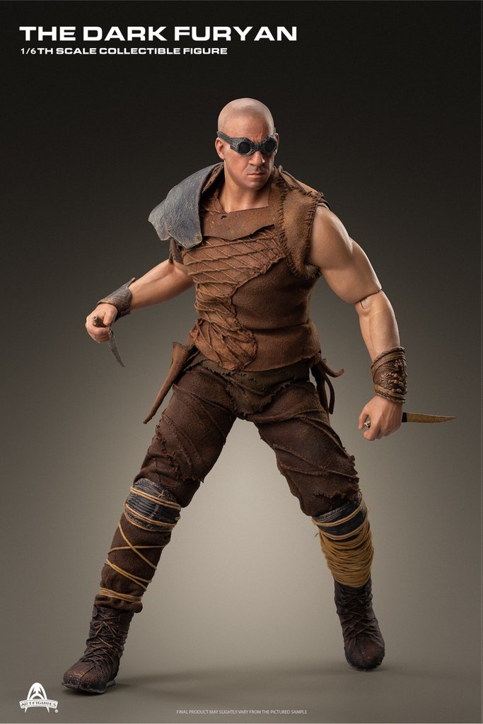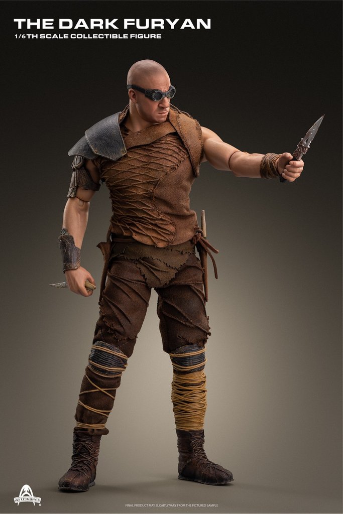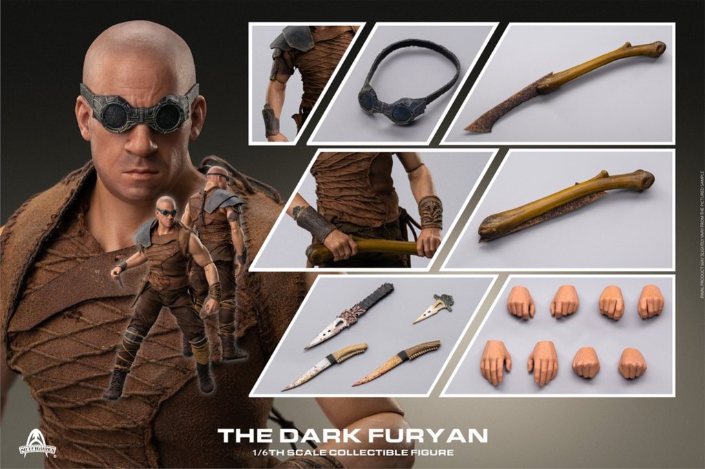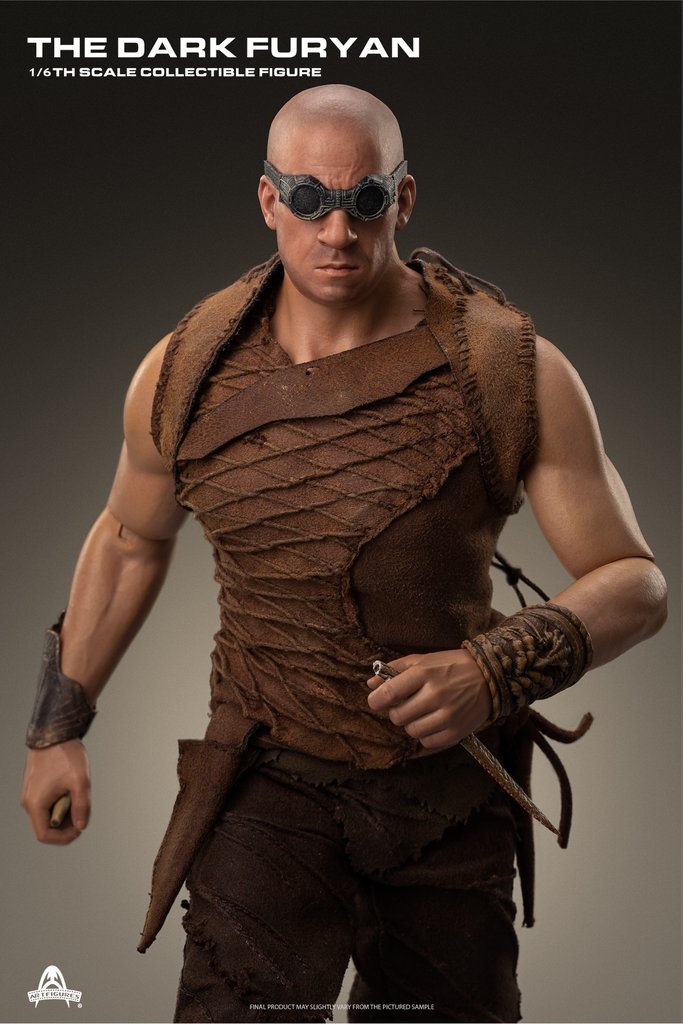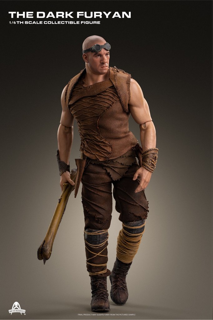 PRODUCT NAME: THE DARK FURYAN 2.0PRODUCT CODE: AF-025PRODUCT PROPORTION: 1/6 SCALEPRODUCT STATUS: FOR ORDERINGThe 1/6th scale The Dark Furyan Collectible Figure specially features:1. Authentic and detailed likeness of the character in the desert2. Newly developed head sculpt with movie-accurate facial expression with detailed skin texture3. Newly designed figure with over 30 points of articulations which naturally portray muscular body in the movie4. Approximately 33cm tall5. Eight (8) pieces of interchangeable hands including:One (1) pair of fistsOne (1) pair of machetes holding handsOne (1) pair of knives holding handsOne (1) pair of relaxed handsCostume:1. One (1) specially tailored suit with bronze and gold colored feature-patterned armor plates.2. One (1) brown-colored leather-like back shield holder and body strap3. One (1) waistband with belt4. One (1) pair of brown colored leather-like pants5. One (1) pair of brown colored leather-like boots6. One (1) pair of kneepads7. One (1) pair of bracers8. One (1) upper arm armor9. One (1) shoulder armor10. One (1) pair of goggles*All materials are fabrics with special processing technology, not artificial leatherWeapons:1. One (1) machete with beast-bone-like handle2. One (1) pair of belt knives with beast-teeth-like handle and sheaths3. One (1) throwing knifeRelease date: Approximately November 2020**Prototype shown, final product may be slightly different**Product details could be subjected to change without further notice2020 Art Figures Limited. All Rights Reserved.