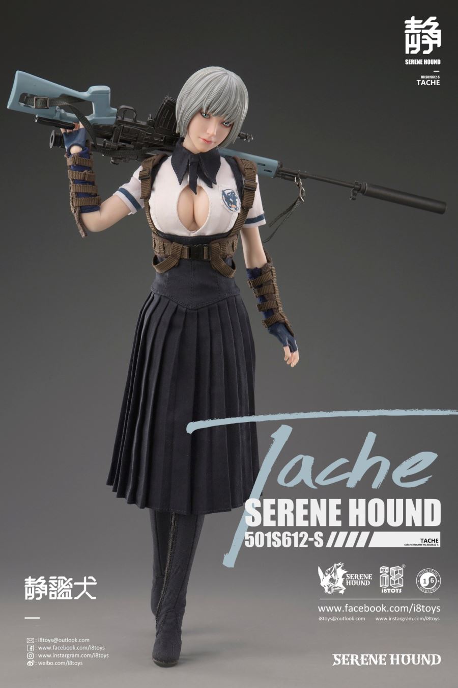 i8TOYS 1/6 TACHE Serene Hound Troop Figure ---501S612-STache, the Quiet Dog , 501S612-SChecklist· Female head sculpt (Movable eyes)· Female body (hybrid teenage body with metal skeleton)· Hand*10 Hands 10pcs· Tactical sling· White uniform short sleeve shirt· Blue uniform suspender Long skirt· Blue sleeve 2pcs· Brown arm guard 2pcs· Blue Thigh stockings 2pcs· Blue cloth Long boots 2pcs· SVD Sniper Rifle i8TOYS 1/6 RINE Serene Hound Troop Figure ---501S612-NQuiet Dog Rine , 501S612-NChecklist· Female head sculpt (Movable eyes)· Female body (hybrid teenage body with metal skeleton)· Hand*10 Hands 10pcs· Tactical sling· White uniform long sleeve shirt· Blue uniform suspender short skirt· Blue Thigh stockings 2pcs· Blue cloth short boots 2pcs· SVDS Sniper Rifle