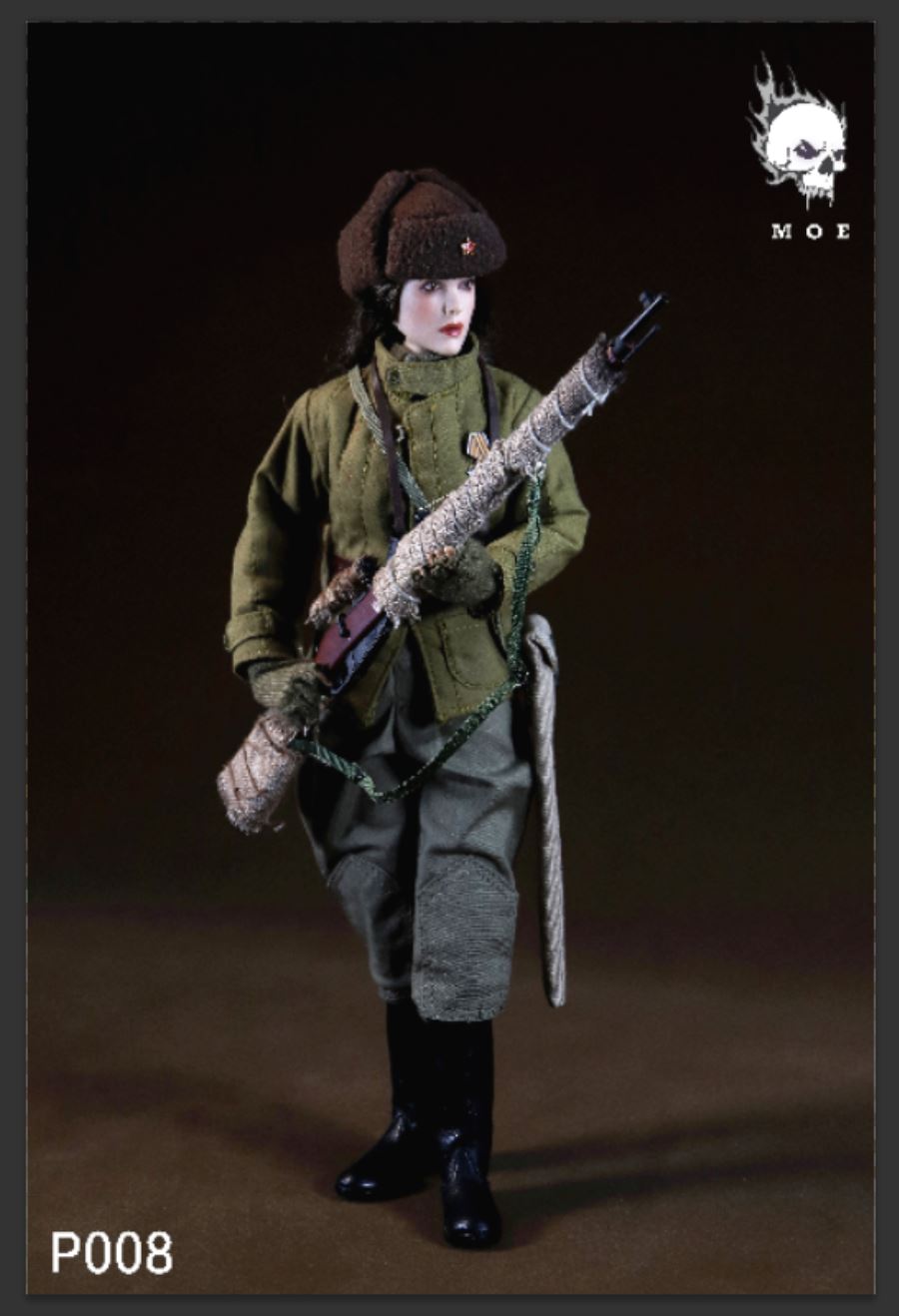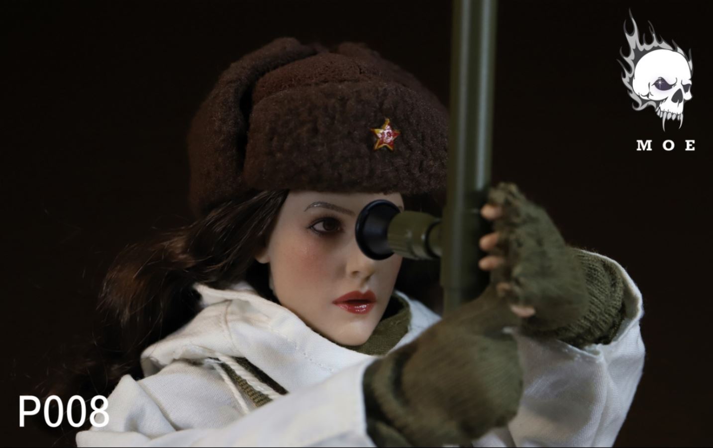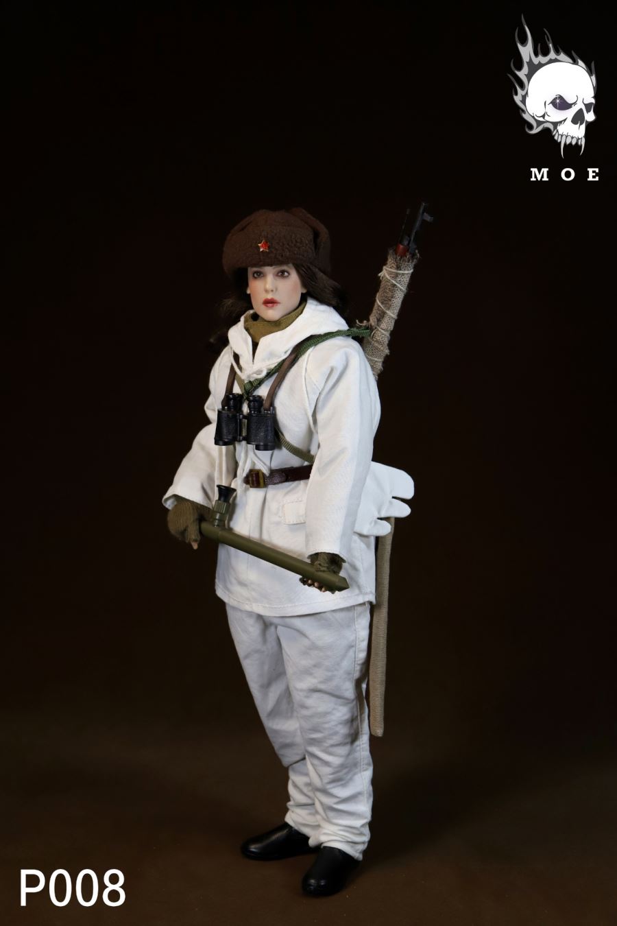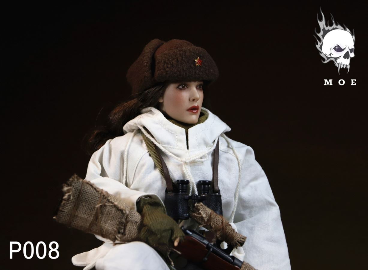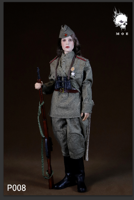 MOETOYS Female sniper with snow camouflage in the Soviet Union P008 Cut-off date: November 20, 2020 Shipment date:First quarter of 2021MOETOYS Female sniper with snow camouflage in the Soviet Union P008Cut-off date: November 20, 2020 Shipment date: The first quarter of 2021P008 Product List P008 Product LiHair Planting Head Carving 1 head carving*1Female body 1 Female model*1Hand type 7 bare hands*7Boat cap 1 Forage Cap *1 Cotton hat 1 Cotton hat*1Uniform top 1 Soviet Uniform coat *1Uniform pants 1 Soviet Uniform trousers *1Cotton jacket 1 Cotton jacket*1 Snow camouflage top*1Snow camouflage pants 1 Snow camouflage pants*1Half gloves*1Snow camouflage gloves*1 Snow camouflage gloves*1Leather belt 1 leather belt *1Leather boots 1 Real leather boots*1kettle+bag 1 kettle+bag * 1Periscope + bag 1 Periscope + bagtelescope 1 Telescope*1medal 1 medal*1black stand 1 Black figure stand*1Mosin-Nagant sniper rifle+Camouflage cloth*1 (Metal + wood)