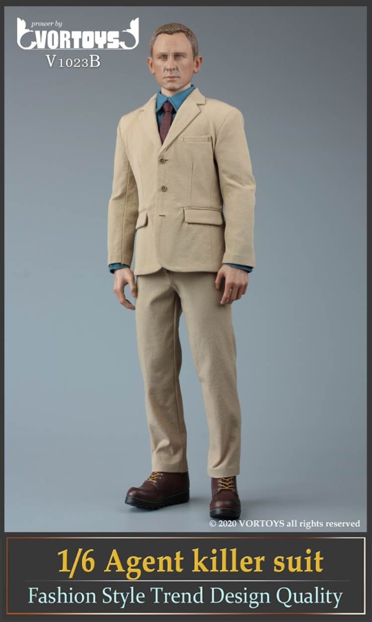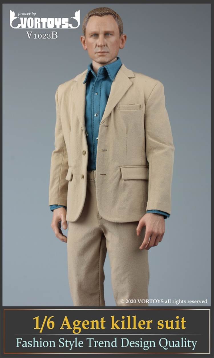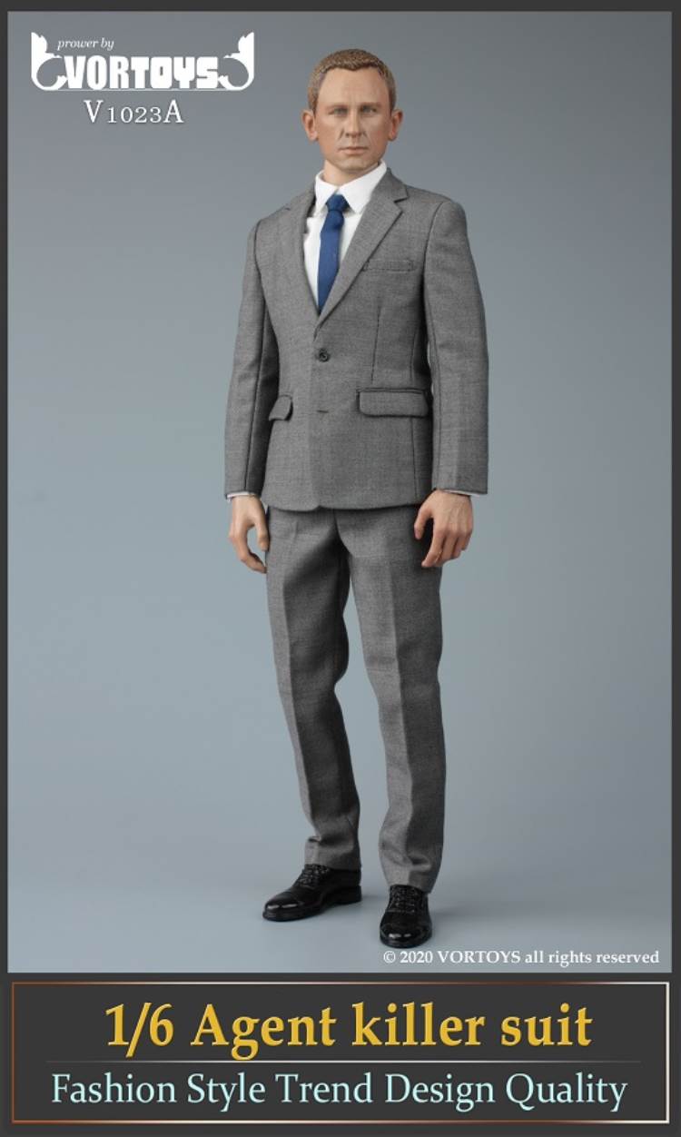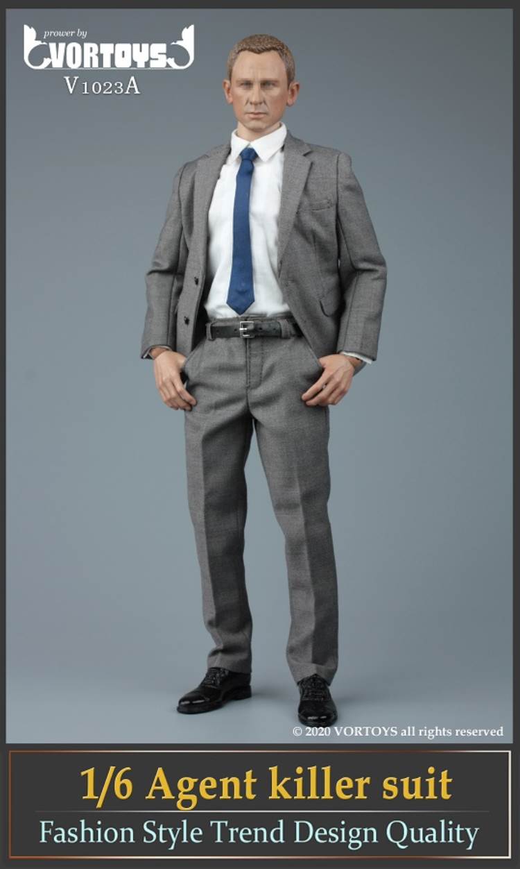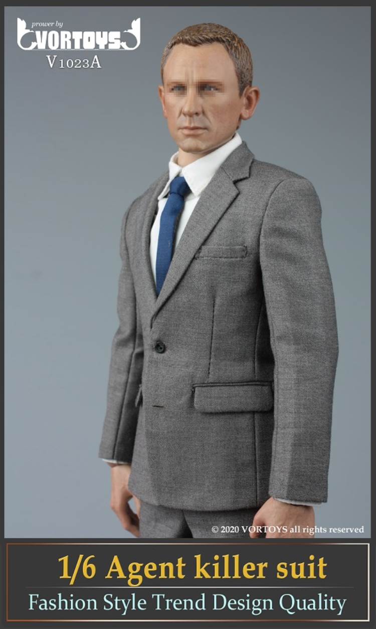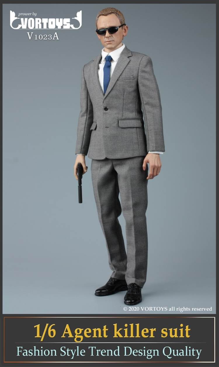 Brand: VORTOYSName: Male Agent SuitsNumber: V1023A Gray V1023B YellowList:suit jacket*1shirt*1trousers*1tie*1belt*1shoes*1PPK pistol*1silencer*1sunglasses*1watch* 1Description: The narrow shoulder body with COOMODEL has the best effect (the template in the picture is COOMODEL BD001 body)
