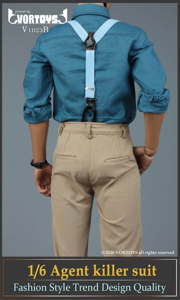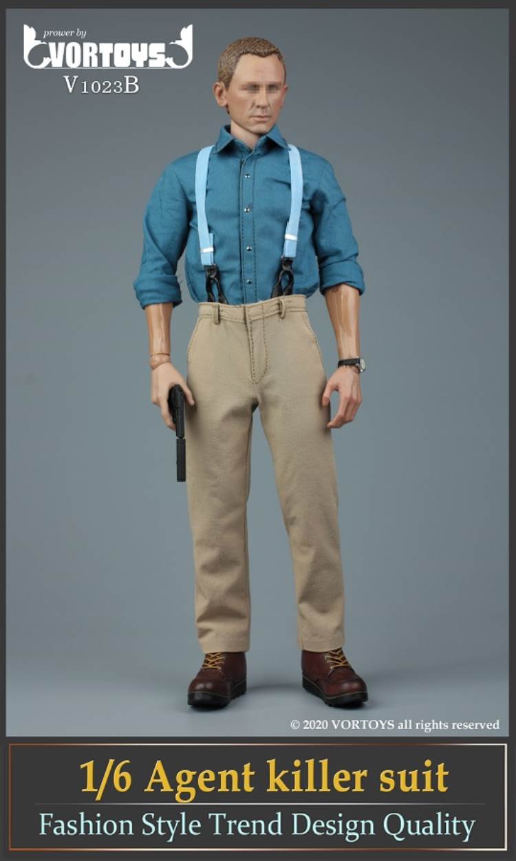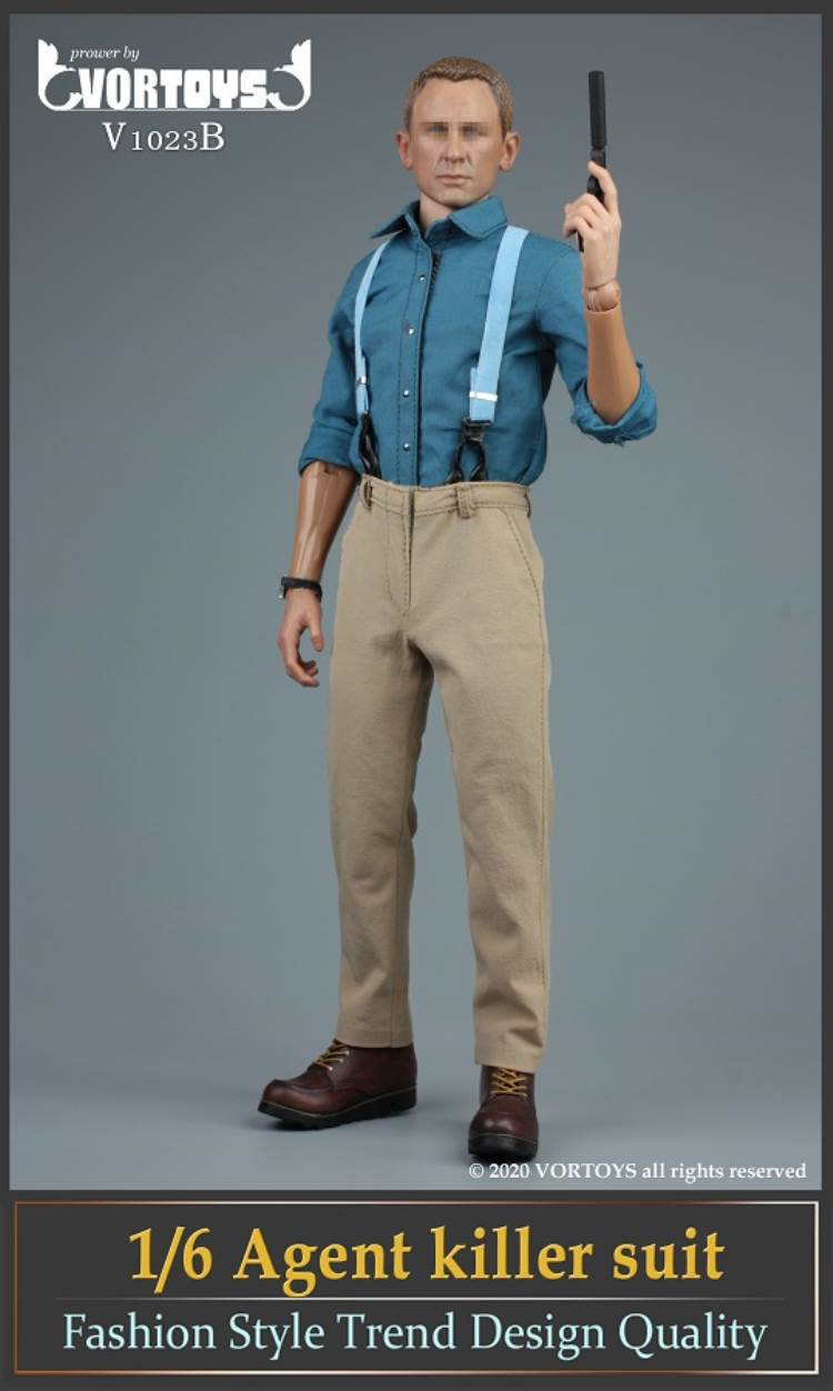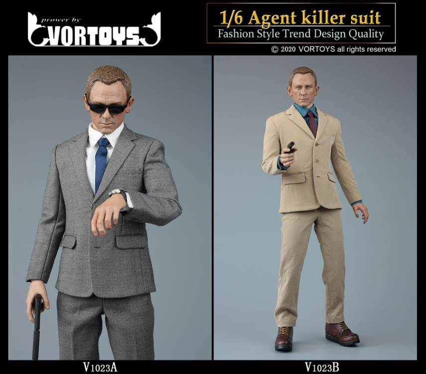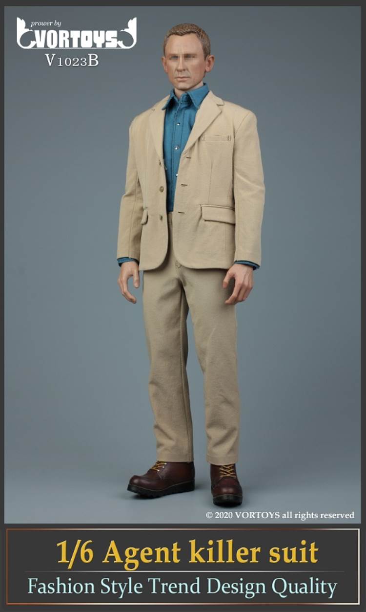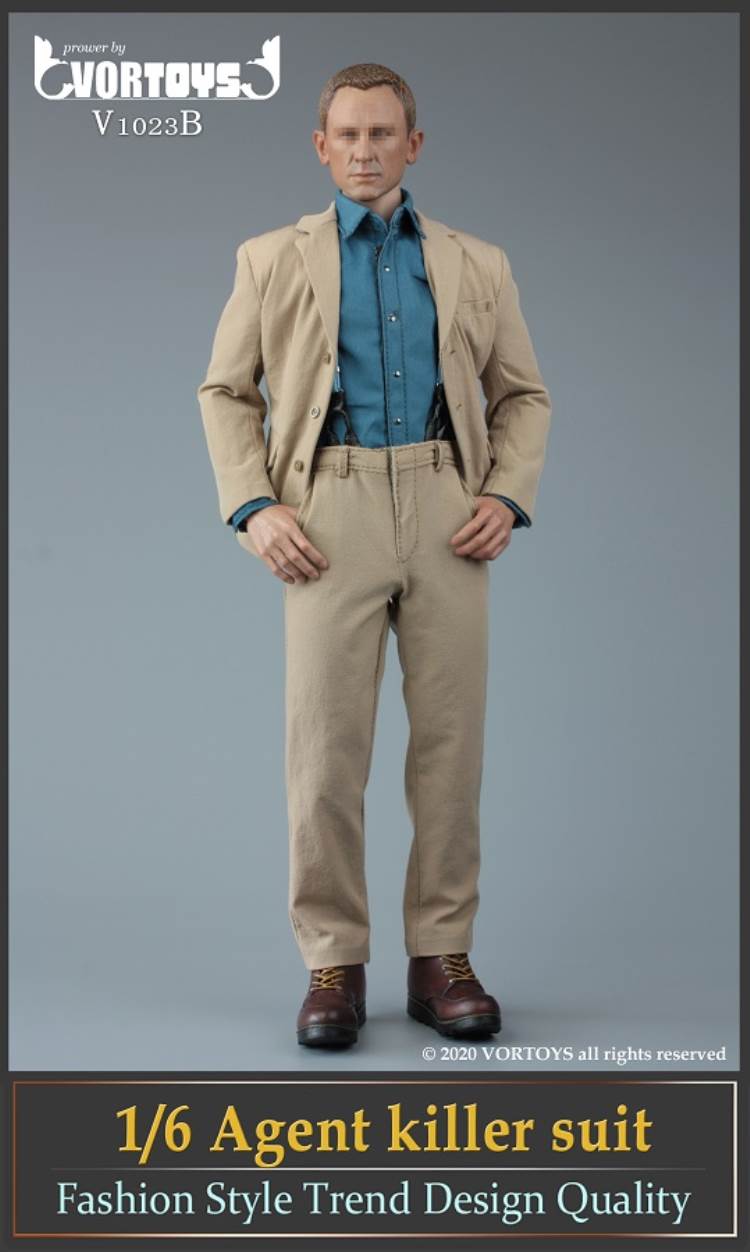 Brand: VORTOYSName: Male Agent SuitsNumber: V1023A Gray V1023B YellowList:suit jacket*1shirt*1trousers*1tie*1belt*1shoes*1PPK pistol*1silencer*1sunglasses*1watch* 1Description: The narrow shoulder body with COOMODEL has the best effect (the template in the picture is COOMODEL BD001 body)