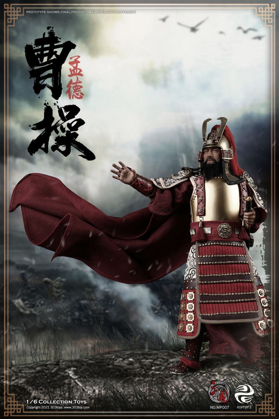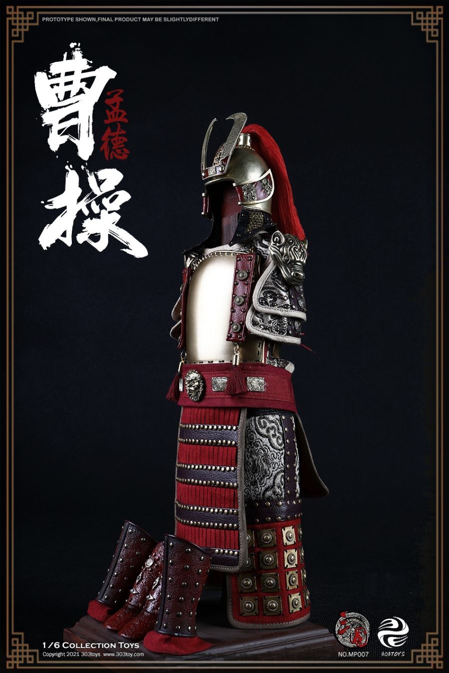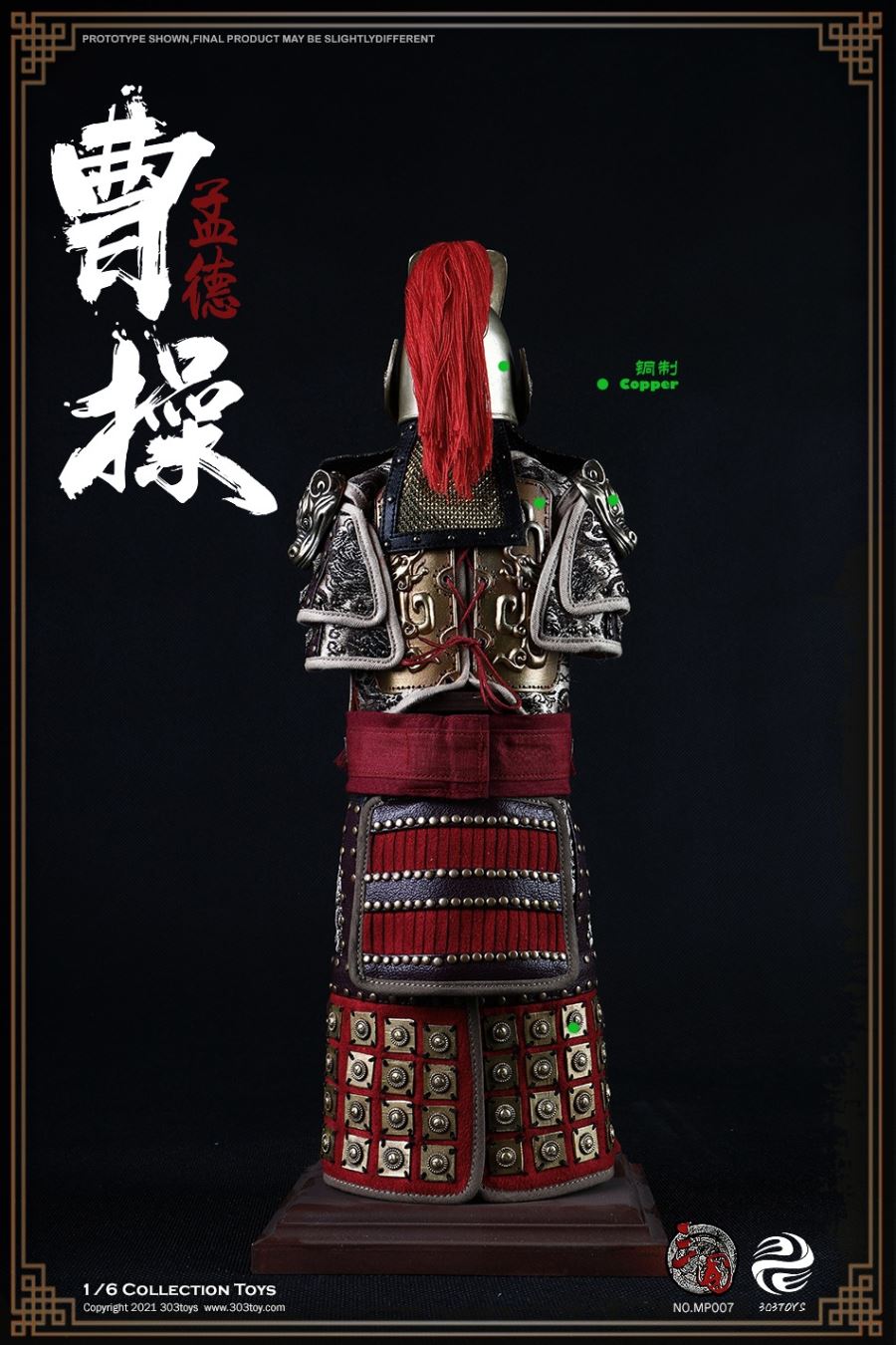 303TOYS MP007 1/6 MASTERPIECE SERIES - CAO CAO (MENDE) COPPER ARMORED VERSIONBARCODE: 6972603770052The 1/6 Scale Cao Cao Figure Specially Features:- One (1) realistic head sculpt with fabric beard and removable bun- One (1) super active medium-sized body- Eight (8) pieces of interchangeable palmsCostumes:- One (1) light brown silk coat- One (1) pair of brown silk pants- One (1) pair of red boots- One (1) red robe- One (1) Thickened underwearArmors:- One (1) copper-made helmet- One (1) copper-made chest-back plain armor- One (1) pair of copper-made shoulder armors- One (1) copper-attached waist-legs armor- One (1) pair of copper-attached vambraces- One (1) pair of copper-attached cuishes- One (1) copper-attached armor belt- One (1) red velvet cloack- One (1) red embroidery cloackWeapons:- One (1) Copper Sword Yitian with scabbardAccessories:- One (1) army flag with flagpole- One (1) flag base- One (1) black figure stand