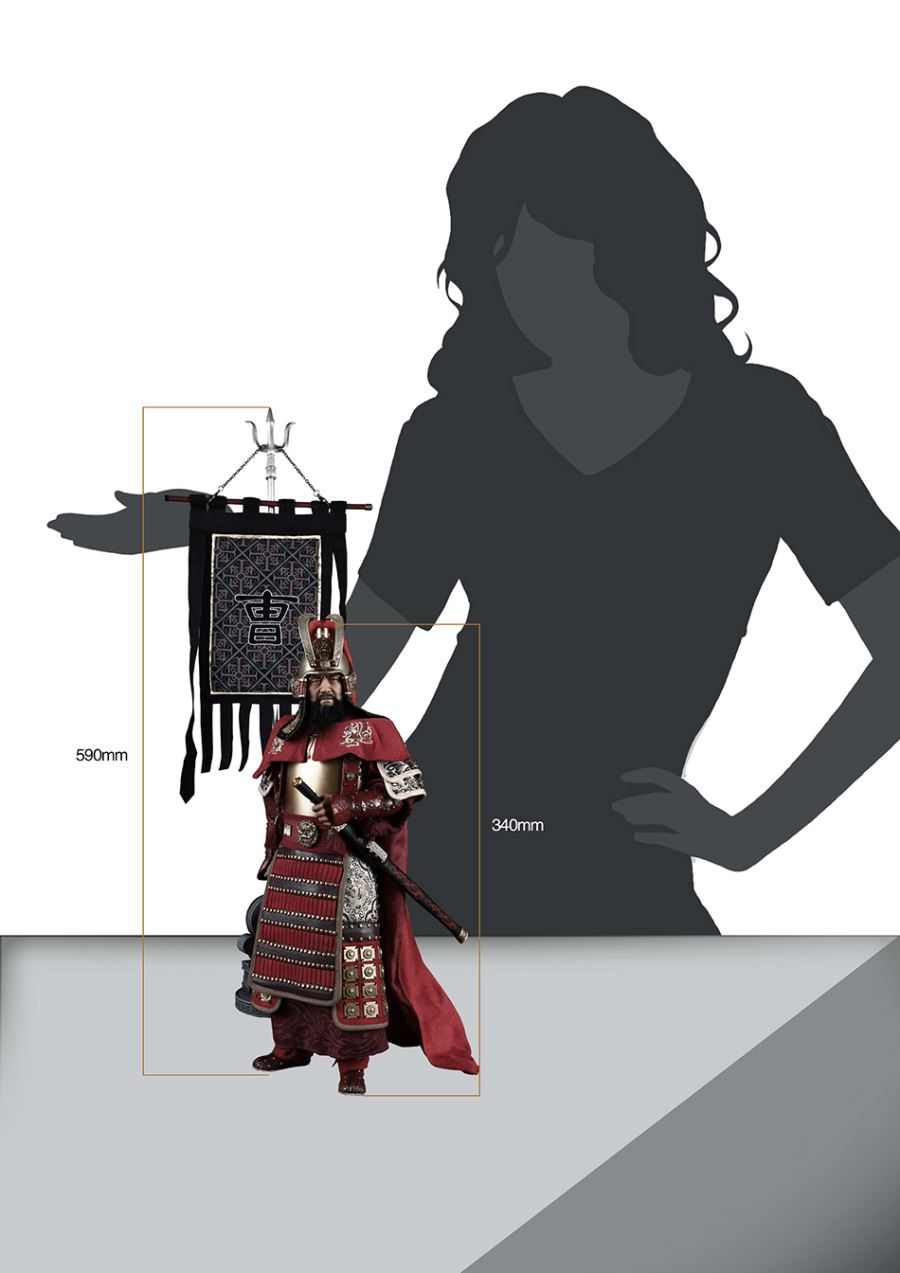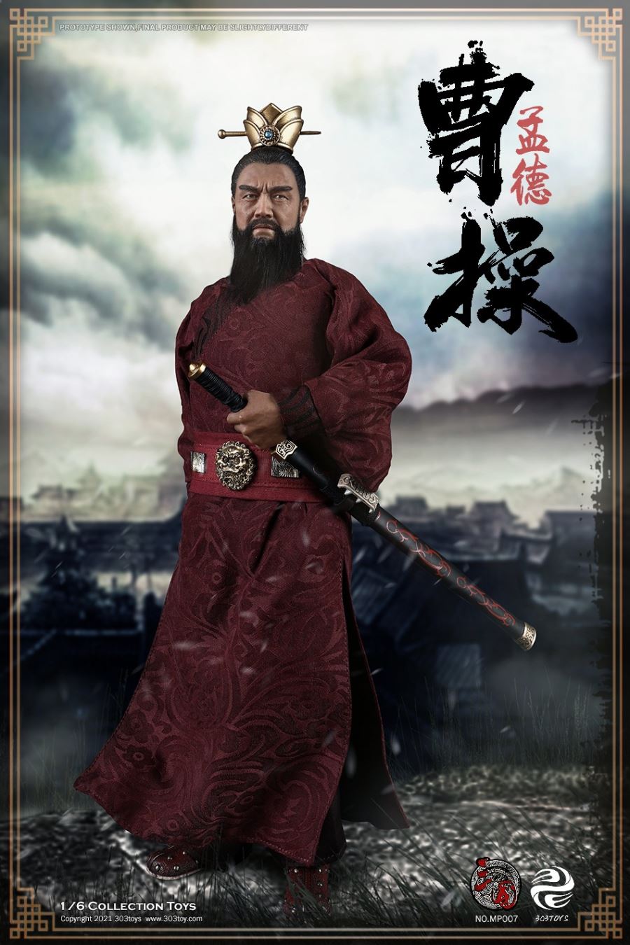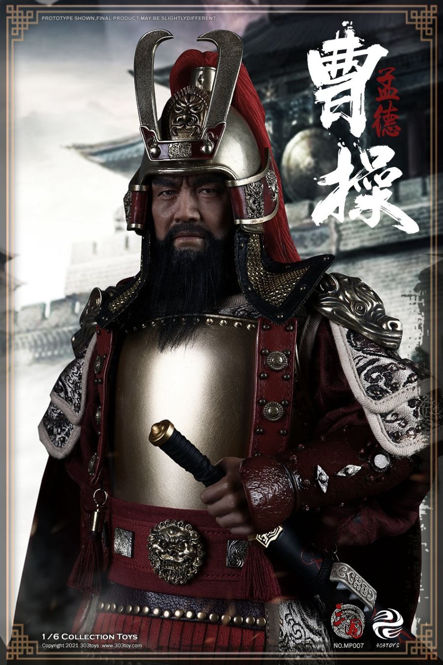 303TOYS MP007 1/6 MASTERPIECE SERIES - CAO CAO (MENDE) COPPER ARMORED VERSIONBARCODE: 6972603770052The 1/6 Scale Cao Cao Figure Specially Features:- One (1) realistic head sculpt with fabric beard and removable bun- One (1) super active medium-sized body- Eight (8) pieces of interchangeable palmsCostumes:- One (1) light brown silk coat- One (1) pair of brown silk pants- One (1) pair of red boots- One (1) red robe- One (1) Thickened underwearArmors:- One (1) copper-made helmet- One (1) copper-made chest-back plain armor- One (1) pair of copper-made shoulder armors- One (1) copper-attached waist-legs armor- One (1) pair of copper-attached vambraces- One (1) pair of copper-attached cuishes- One (1) copper-attached armor belt- One (1) red velvet cloack- One (1) red embroidery cloackWeapons:- One (1) Copper Sword Yitian with scabbardAccessories:- One (1) army flag with flagpole- One (1) flag base- One (1) black figure stand