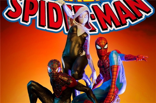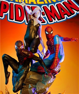 The Queen Studios '1/4 scale รูปปั้น Amazing Spider-Man Spider-Verse Trio ได้รับแรงบันดาลใจจากภาพปกจาก Amazing Spider-Man เล่ม 3: Spider-Verse ปกประกอบด้วย Miles Morales, Peter Parker และ Gwen Stacy (ท่ามกลางคนอื่น ๆ ) ขณะที่พวกเขาแกว่งไปข้างหน้าในการต่อสู้ผ่านไฟและเศษซาก