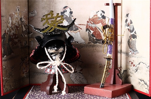 COOMODEL SE094 1/6 DIECAST ALLOY - SERIES OF EMPIRES - LOVE HELMET SETBARCODE: 6971242121447* The Helmet is built of manually-attched sheets, 100% metal-made* The edges of swords are made by stainless steel(incuding copper parts)The 1/6 Scale Love Helmet Set Specially Features:- One (1) black helmet with red strings, decorated of character love- One (1) black face-neck mask with white moustache and beard- One (1) katana of gold handle- One (1) white scabbard with gold strings- One (1) helmet stand- One (1) katana stand- One (1) dancing screen- One (1) display stage