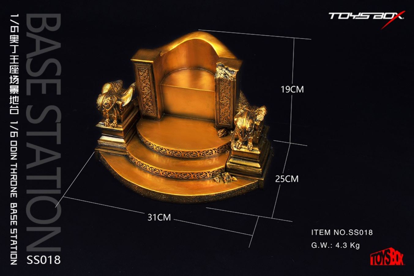 1/6 Odin Throne Throne Scenery PlatformBrand: TOYS-BOXModel: SS018Packing Size: 40x27x32cmGross Weight: 5kg1/6 ODIN Throne BASE STATIONBRAND: TOYS-BOXITEM NO.SS018Packging Size: 40x27x32cmGW: 5KgRetail Price: 398 yuan