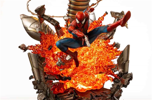 A Complex and detailed Polystone Statue featuring a destroyed street base scene with the Villainous Spider-Bot and Iconic Spider-Man featuring his wrap around web design.