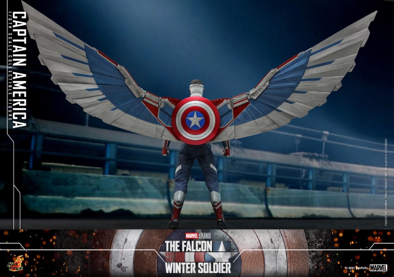 ชุดใหม่มีทั้งโล่ของกัปตันอเมริกาและปีกหลังบินของเหยี่ยว Hot Toys มีต้นแบบมาจากต้นฉบับเสื้อผ้าได้รับการตัดเย็บอย่างประณีตและประณีต
