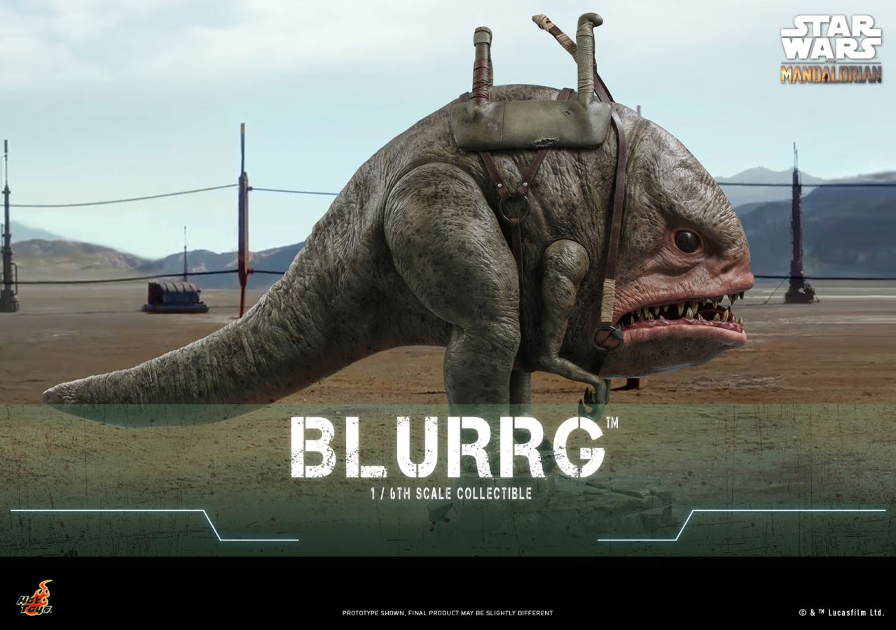 Blurrg ที่มีความแม่นยำสูงได้รับการพัฒนาอย่างชำนาญตามลักษณะของสิ่งมีชีวิตใน The Mandalorian ยืนสูงประมาณ 37 ซม. (43 ซม. พร้อมฐาน) และความยาว 60 ซม. มีส่วนหัวและลำตัวที่มีรายละเอียดมากแขนที่ประกบกันอานม้าและขาตั้งแสดงธีมหิน!