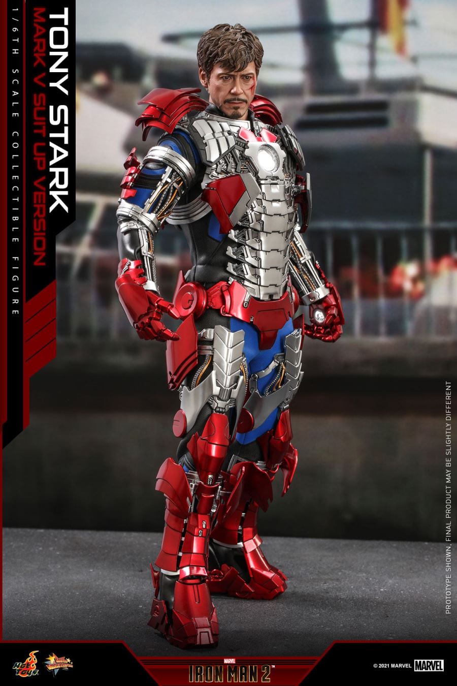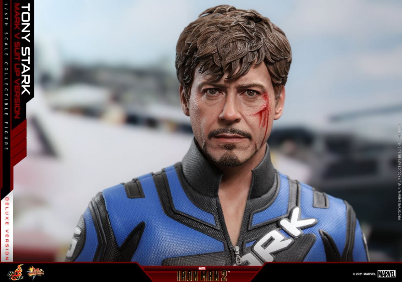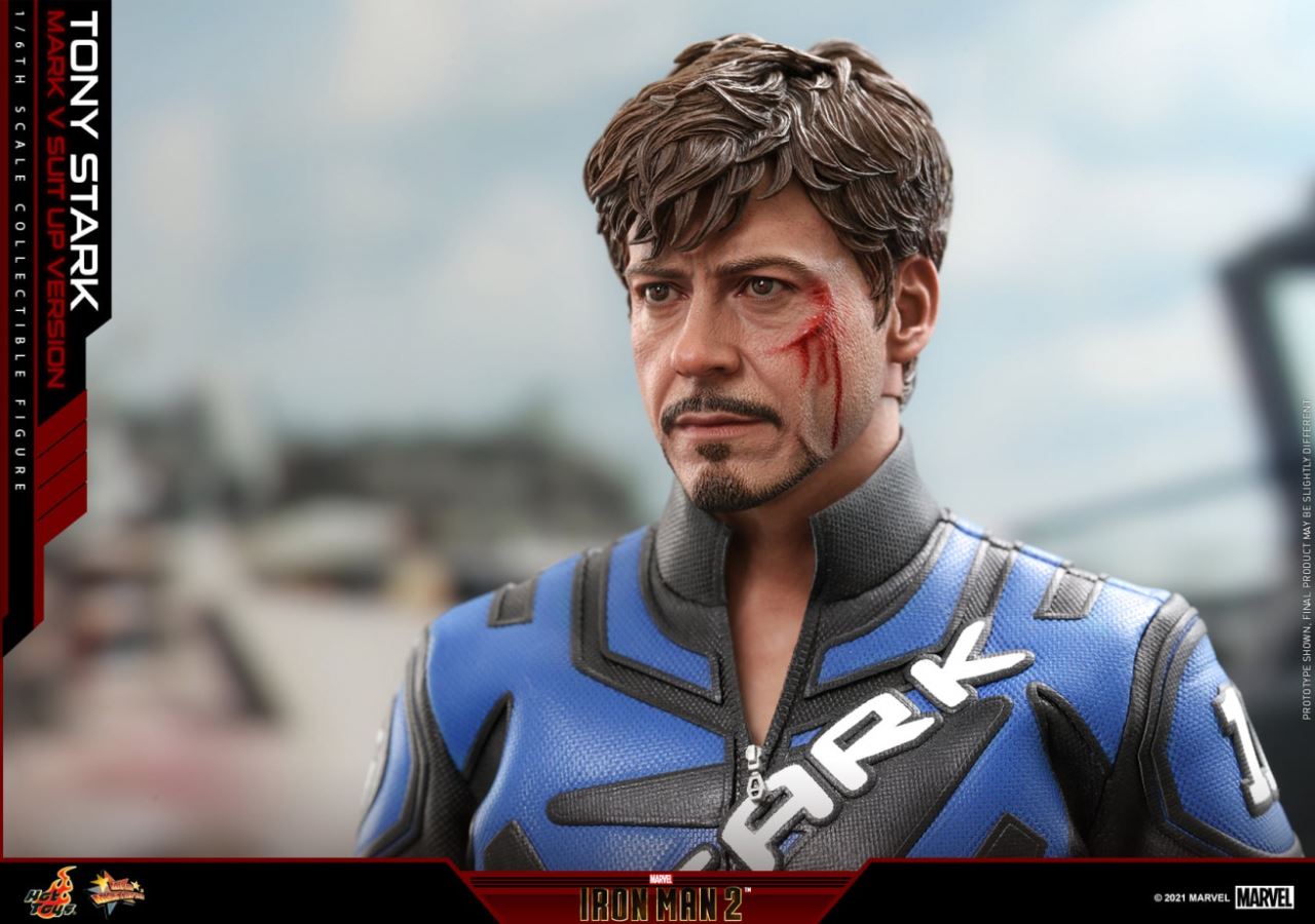 ของเล่นสุดฮอตสร้างจากภาพเหมือนของนักแสดงโรเบิร์ตดาวนีย์ (Robert Downey Jr. ) โทนี่สตาร์คที่แกะสลักและทาสีใหม่สำหรับตุ๊กตา ดูเหมือนรูปปั้นศีรษะจริงจับการแสดงออกของตัวละครลักษณะใบหน้าทรงผมยุ่งเหยิงและเคราอันเป็นเอกลักษณ์ รอยฟกช้ำและคราบเลือดหลังการต่อสู้จะถูกสแกนอย่างรอบคอบ การจำลองระดับสูงเปรียบได้กับคนจริงอย่างแน่นอน ตามอัตราส่วนลักษณะของ Tony Stark Hot Toys ได้สร้างร่างกายที่สามารถเคลื่อนย้ายได้สูงโดยมีความสูงมากกว่า 30 ซม. และมีข้อต่อที่เคลื่อนย้ายได้มากกว่า 30 ข้อ ในขณะเดียวกันทีมผู้ผลิต Hot Toys ก็ทำตามแบบ 100% เพื่อสร้างเครื่องแต่งกายในชีวิตจริง ชุดแข่งสีน้ำเงินและสีดำครบชุดทำจากผ้าคุณภาพสูงเสื้อแจ็คเก็ตซิปกางเกงและรองเท้าบู๊ตที่ตกแต่งด้วยตัวละคร STARK ทำตามแบบจำลองในภาพยนตร์ตามความเป็นจริง ฝีมือการตัดเย็บของทั้งชุดพิถีพิถัน