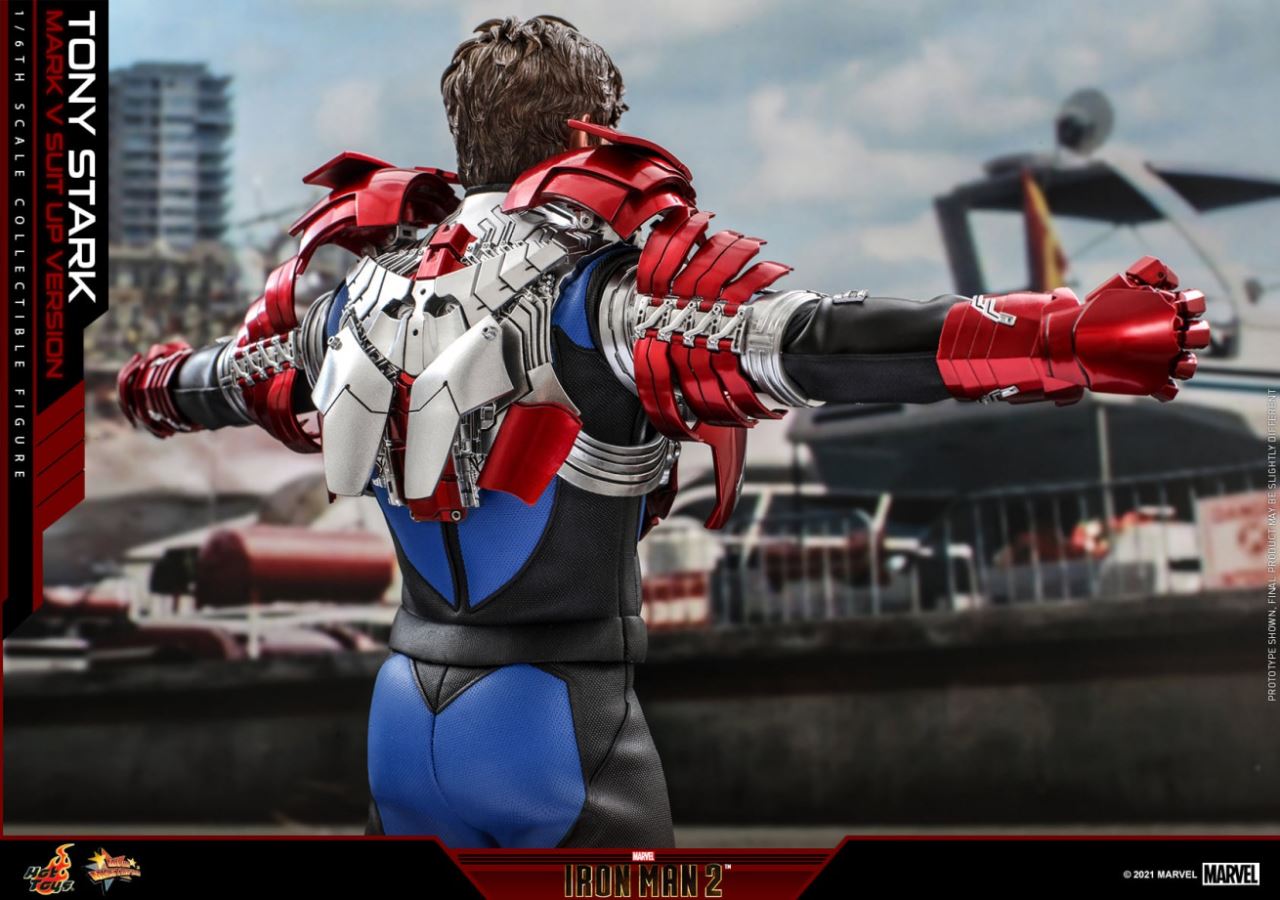 จุดเด่นอีกประการหนึ่งของตุ๊กตาคือการฟื้นฟูรูปแบบเกราะครึ่งตัวของ Tony Stark เมื่อเขาสวม Iron Man Mark V Hot Toys ได้รวบรวมโครงสร้างกึ่งเกราะที่ซับซ้อนและมีรายละเอียดใหม่สำหรับ Iron Man Mark V ด้วยสีแดงเมทัลลิก