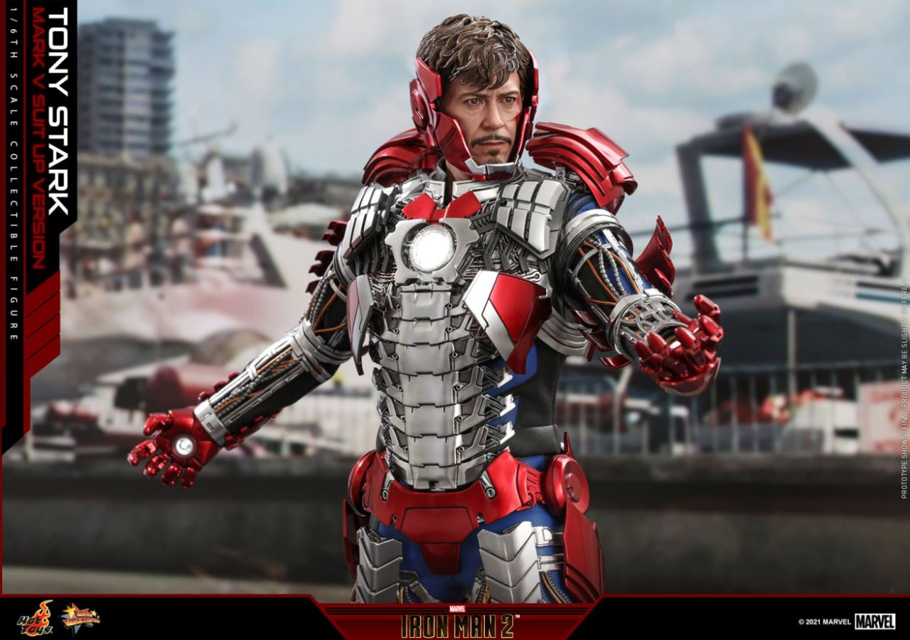 Tony Stark (รุ่นเกราะ Mark V) ฟิกเกอร์ของนักสะสมสเกล 1: 6 (รุ่นดีลักซ์) ใน "Iron Man 2" นอกเหนือจากการกำหนดค่าของรุ่นปกติข้างต้นแล้วยังมาพร้อมกับกระเป๋าเดินทาง Mark V ที่มีฟังก์ชั่นเปิด และชุดส่วนประกอบเกราะภายใน Mark V ที่ดึงออกมาจากกระเป๋าเดินทางสามารถติดตั้งบนกระเป๋าเดินทาง Mark V ที่เปิดอยู่ได้ กระเป๋าเดินทางมีที่จับที่สามารถเคลื่อนย้ายได้เล็กน้อยเพื่อให้สามารถถอดตุ๊กตา Tony Stark ในชุดแข่งออกจากกระเป๋าเดินทาง Mark V ได้ พล็อตเรื่องเมื่อกระเป๋าเดินทางถูกดึงออกจากชุดเกราะ