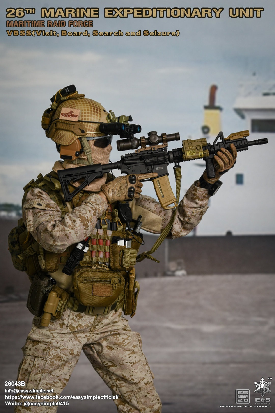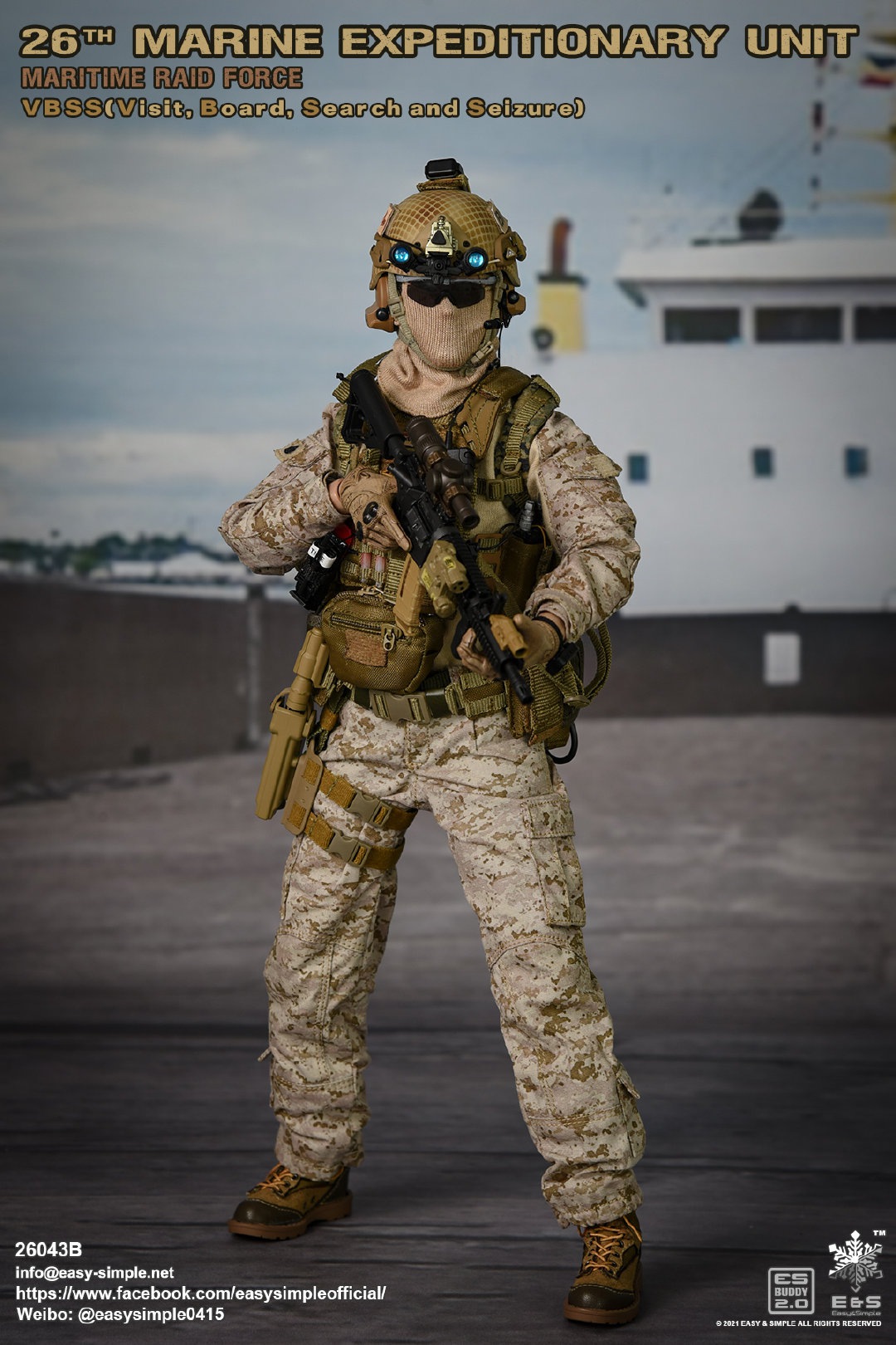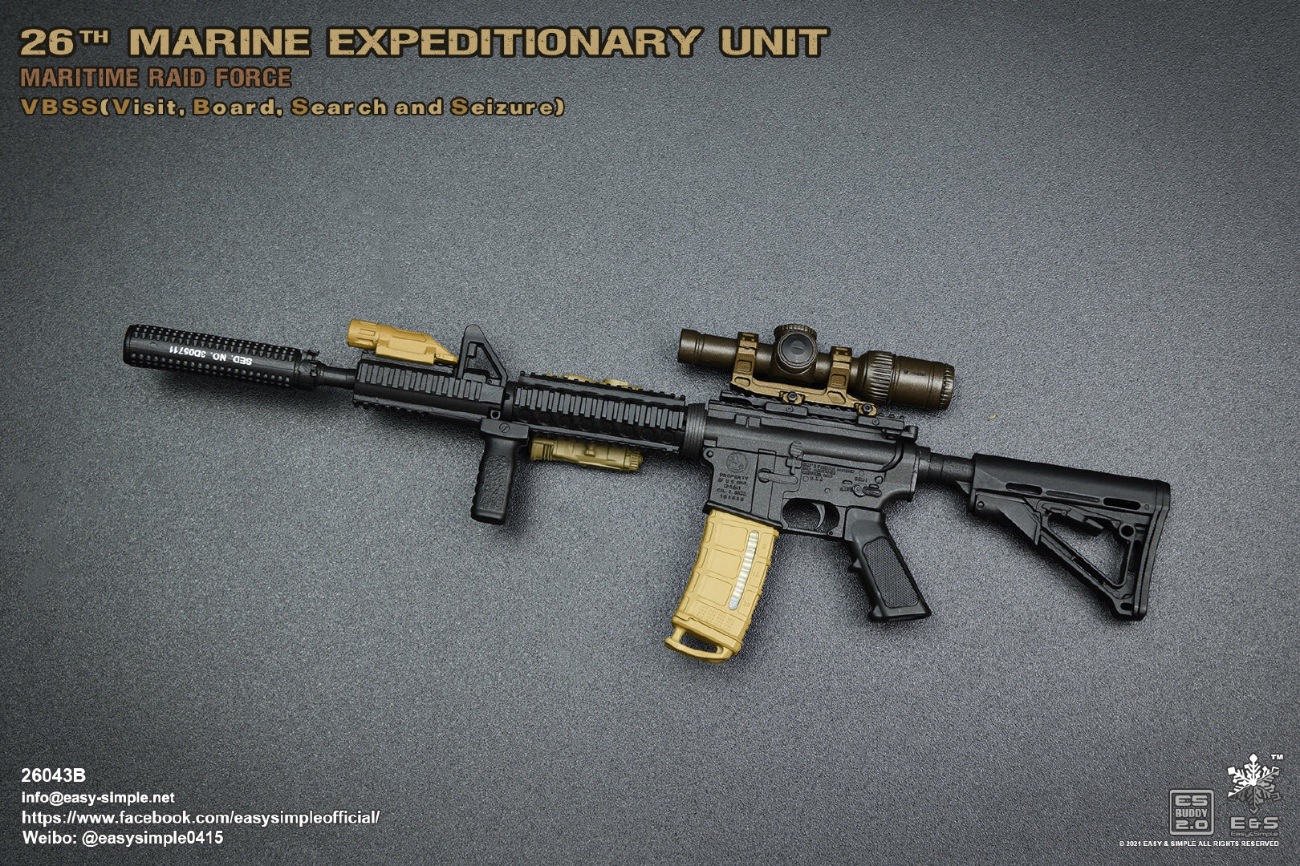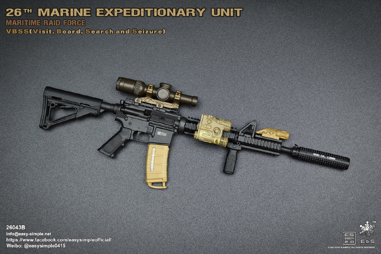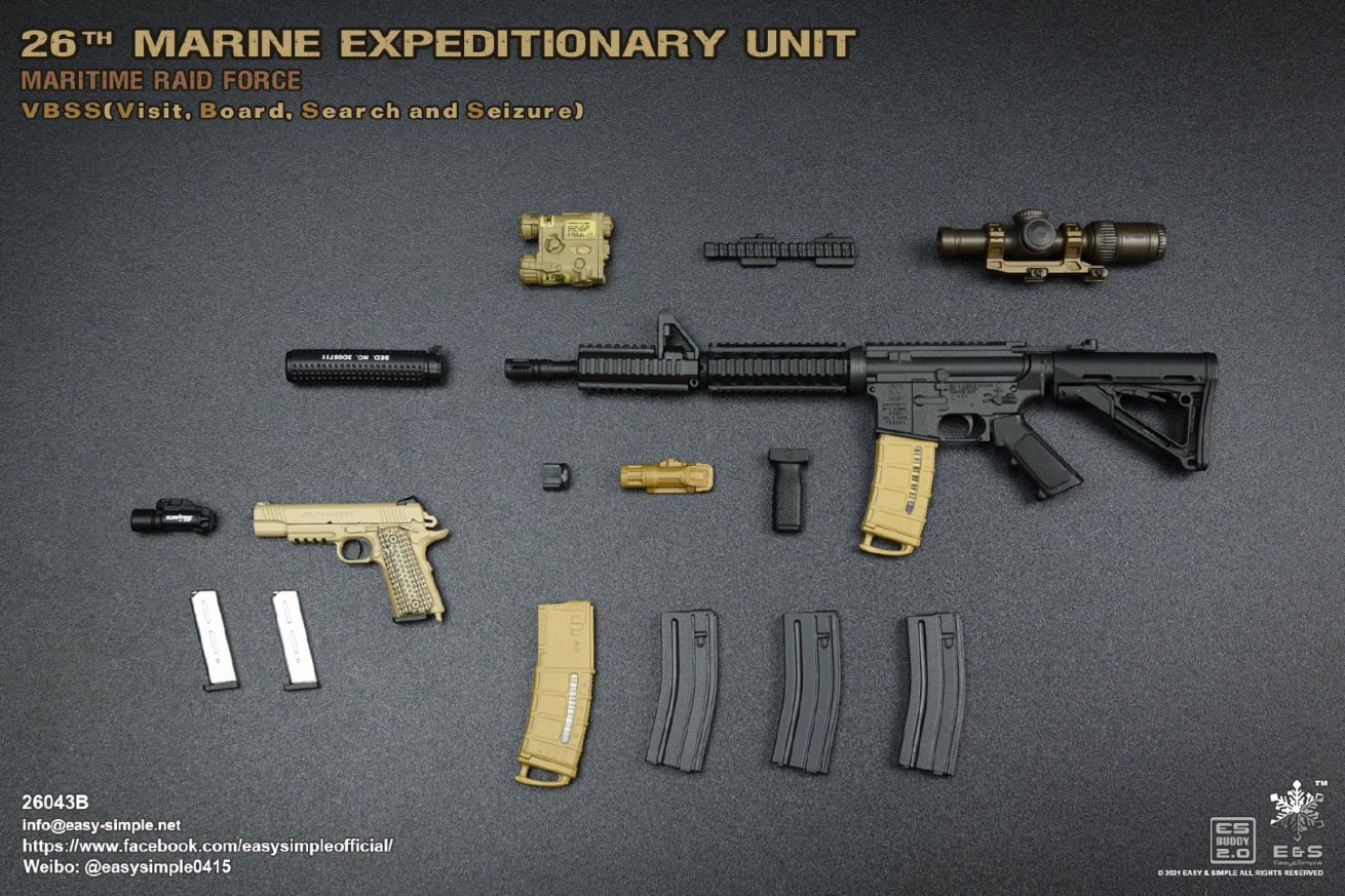 Easy&Simple 26043B26th Marine Expeditionary UnitMaritime Riad ForceVisit Board Search Seizure(VBSS)SKU: 26043BITEM: 26th Marine Expeditionary UnitMaritime Raid ForceVisit Board Search Seizure(VBSS)Breakdown ListReal like Head SculptES-Buddy 2.0 BodyFR Printed Shirt *NewMARPAT Desert FROG Combat Shirt *NewMARPAT Desert FROG Combat Pants *NewFROG Balaclava *NewInner Duty BeltPadded Heavy Duty War Belt Flex CAS Plate Carrier *NewMedium Nut Ruck *NewFSBE2 Radio PouchFSBE2 Single M4 Mag PouchFSBE2 Dump PouchFSBE2 Medic PouchFSBE2 Pistol Mag PouchFSBE2 FlashBang PouchMARPAT Woodland YOTE Assault Pack *NewM4A1 Assault Rifle with Extended Rail System *NewRazor HD 2 1-6 ScopeFlat Top Riser Rail *NewTactical Weapon Mounted Light(WML) *NewTactical Vertical Fore GripPEQ-16 Indicator5.56 SuppressorTactical SlingCQD Sling Ring30rd MagPmagM-45 CQBP .45 PistolX300 Weapon Light6004 HiolsterPistol MagEnhanced Combat Helmet *New ColorUniversal NVG MountAN/PVS-31 NVGRemote Battery PackMK3 Gen1 Counterweight *NewMPLS LightM-Pact 4.0 Gloves *NewR.A.T Boots *NewCOMTAC3 HeadsetPeltor PTTPRC-148 RadioAntenna Extension CableCarabineersForetrex 401 GPS MS2000 StrobeMK13 FlashbangC.A.T TourniquetMetal Insignia *NewFSBE2 Speed Flashlight HolsterHABD with PouchTactical Floatation SystemSI Frame SunglassLight StickPatches