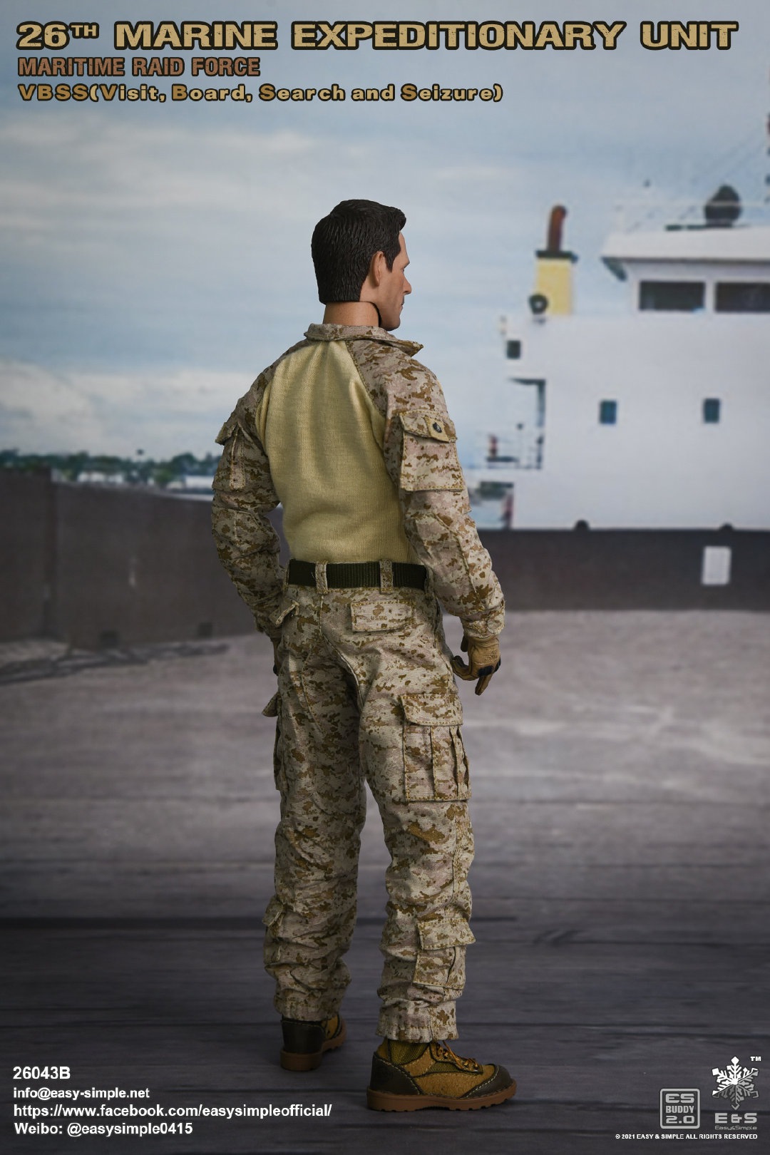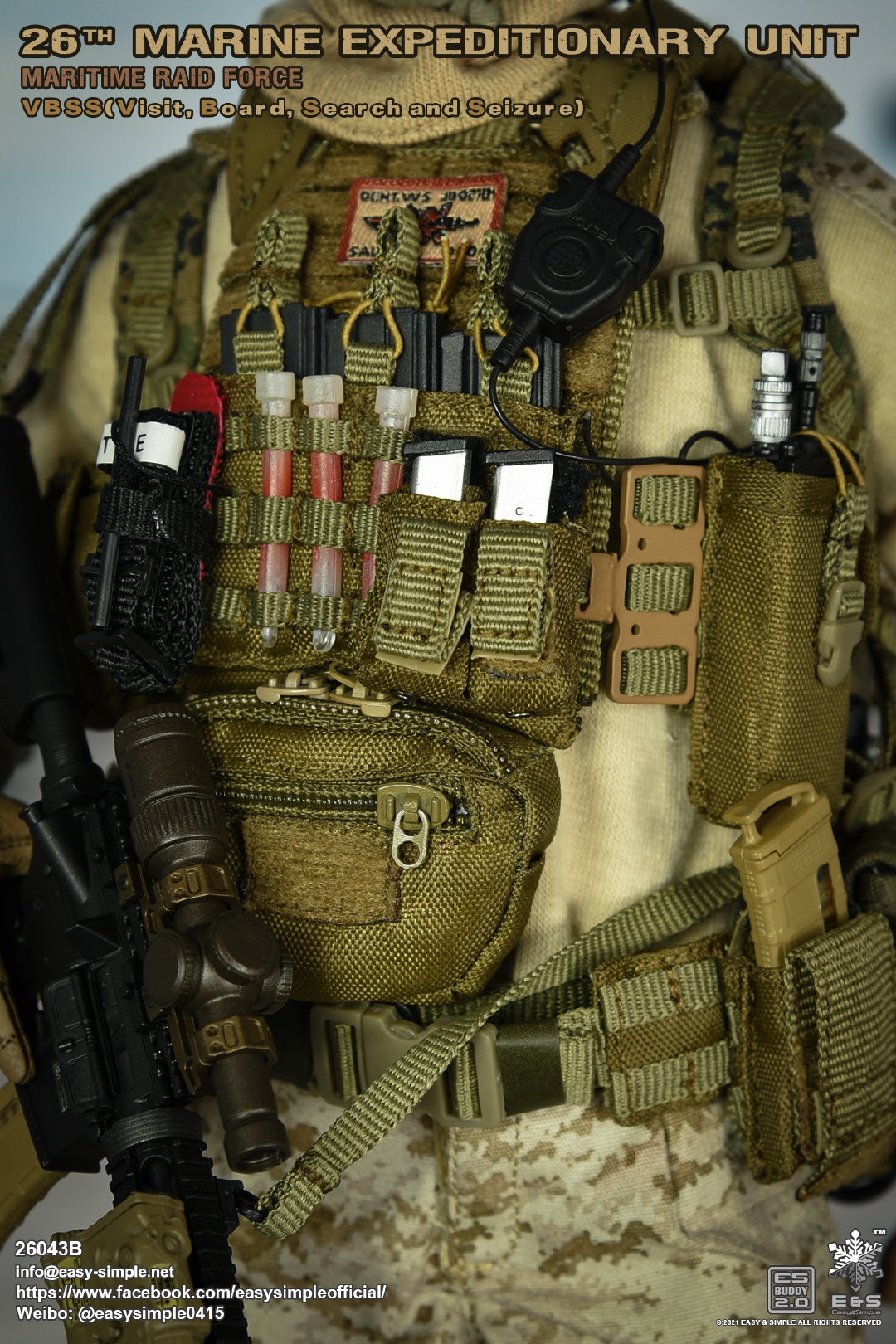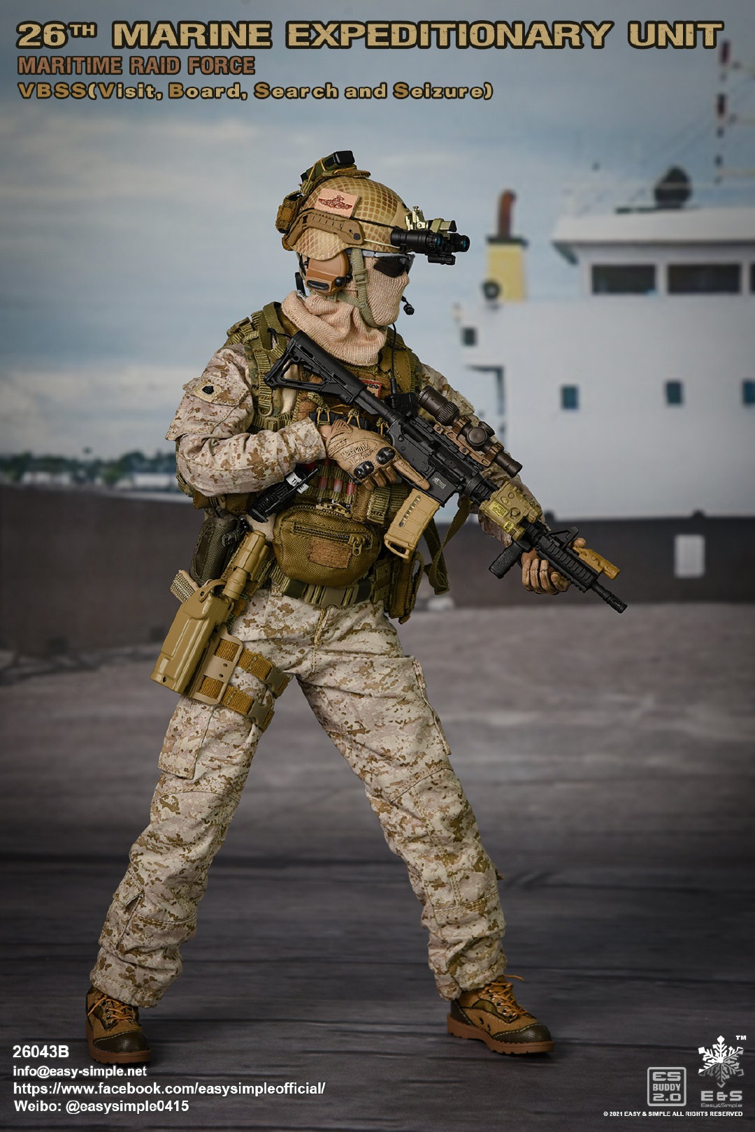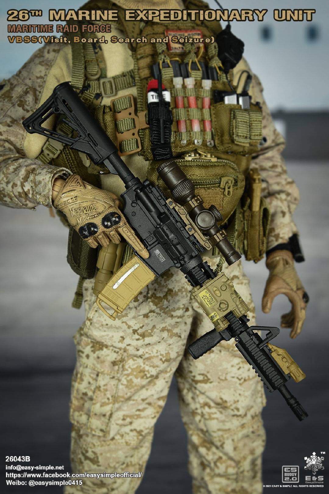 Easy&Simple 26043B26th Marine Expeditionary UnitMaritime Riad ForceVisit Board Search Seizure(VBSS)SKU: 26043BITEM: 26th Marine Expeditionary UnitMaritime Raid ForceVisit Board Search Seizure(VBSS)Breakdown ListReal like Head SculptES-Buddy 2.0 BodyFR Printed Shirt *NewMARPAT Desert FROG Combat Shirt *NewMARPAT Desert FROG Combat Pants *NewFROG Balaclava *NewInner Duty BeltPadded Heavy Duty War Belt Flex CAS Plate Carrier *NewMedium Nut Ruck *NewFSBE2 Radio PouchFSBE2 Single M4 Mag PouchFSBE2 Dump PouchFSBE2 Medic PouchFSBE2 Pistol Mag PouchFSBE2 FlashBang PouchMARPAT Woodland YOTE Assault Pack *NewM4A1 Assault Rifle with Extended Rail System *NewRazor HD 2 1-6 ScopeFlat Top Riser Rail *NewTactical Weapon Mounted Light(WML) *NewTactical Vertical Fore GripPEQ-16 Indicator5.56 SuppressorTactical SlingCQD Sling Ring30rd MagPmagM-45 CQBP .45 PistolX300 Weapon Light6004 HiolsterPistol MagEnhanced Combat Helmet *New ColorUniversal NVG MountAN/PVS-31 NVGRemote Battery PackMK3 Gen1 Counterweight *NewMPLS LightM-Pact 4.0 Gloves *NewR.A.T Boots *NewCOMTAC3 HeadsetPeltor PTTPRC-148 RadioAntenna Extension CableCarabineersForetrex 401 GPS MS2000 StrobeMK13 FlashbangC.A.T TourniquetMetal Insignia *NewFSBE2 Speed Flashlight HolsterHABD with PouchTactical Floatation SystemSI Frame SunglassLight StickPatches