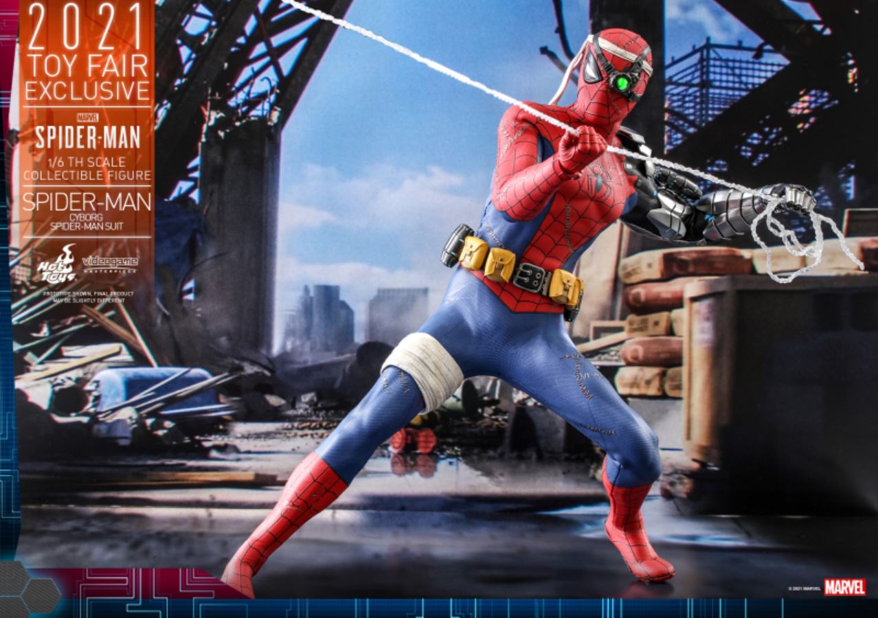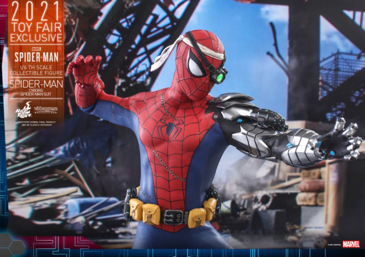 MARVEL'S SPIDER-MANSPIDER-MAN (CYBORG SPIDER-MAN SUIT)1/6TH SCALE COLLECTIBLE FIGUREJoin Peter Parker in the Cyborg Spider-Man Suit to stop crime in Marvel’s Spider-man video game and face off against villains determined to defeat the friendly neighbourhood hero! Designed with a modern twist making it special and unique, the Cyborg Spider-Man suit is an iconic outfit based on a heavily damaged Spider-Man variant that firstly introduced in Marvel Comics.To further expand Marvel’s Spider-Man collectible series, Hot Toys is delighted to introduce a new 1/6th scale Spider-Man (Cyborg Spider-Man Suit) collectible figure capturing one of the signature looks of the wall-crawling hero. This amazing figure will be one of our 2021 Toy Fair Exclusive items!The figure is expertly crafted based on Spider-Man wearing Cyborg Spider-Man Suit in the Marvel’s Spider-Man video game, featuring a newly crafted masked head sculpt with LED light up left eyes and multiple interchangeable right eye pieces to create different combinations of Spider-Man’s expressions; a greatly poseable figure body with cybernetic left arm specially painted in metallic color; skillfully tailored Cyborg Spider-Man suit following a blue and red color scheme with utility belt and battle damage effects; interchangeable hands for iconic postures; assorted web effect accessories, and a dynamic figure stand for display uses.Don’t miss out on the chance to recruit the latest Spider-Man figure to your Spidey collection!SPECIFICATIONSPRODUCT CODEVGM51PRODUCT NAMESPIDER-MAN (CYBORG SPIDER-MAN SUIT)HEIGHTAPPROXIMATELY 30CM TALLPOINTS OF ARTICULATIONS30SPECIAL FEATURESNEWLY DEVELOPED MASKED HEAD SCULPT WITH LED LIGHT UP LEFT EYE, FINELY SCULPTED GOGGLES AND WHITE HEADBAND, BATTLE DAMAGED CYBORG SPIDER-MAN SUITARTISTSHEAD SCULPTED BY N/AHEAD PAINTED BY N/AHEAD ART DIRECTED BY N/AThe 1/6th scale Spider-Man (Cyborg Spider-Man Suit) Collectible Figure specially features:- Authentic and detailed likeness of Spider-Man wearing Cyborg Spider-Man Suit in Marvel’s Spider-Man video game- Newly developed masked head sculpt with LED light up left eye (green light, battery operated)- Three (3) interchangeable right eye pieces that can create different combinations of Spider-Man’s expressions- Finely sculpted goggles and white headband- Approximately 30cm tall- Specialized body with over 30 points of articulations- Metallic silver painted cybernetic left arm with details and grenades attached- Ten (10) pieces of interchangeable hands including:- One (1) pair of fists- One (1) pair of opened hands- One (1) pair of web shooting hands- One (1) pair of cobweb swinging hands- One (1) pair of gesture handsCostume :- One (1) battle damaged red and blue colored Cyborg Spider-Man Suit with grayish black trims, cobweb pattern and black spider emblem on chest- One (1) utility belt with pouchesAccessories:- Six (6) strings of spider web in different shapes and lengths, attachable to the web-shooters- One (1) open spider web effect accessory- A dynamic figure stand with game logo, character nameplate and graphic cardRelease date: Approximately Q3 – Q4, 2021*Prototype shown, final product may be slightly different**Product details could be subjected to change without further notice© 2021 Marvel.© 2021 Hot Toys Limited. All Rights Reserved.