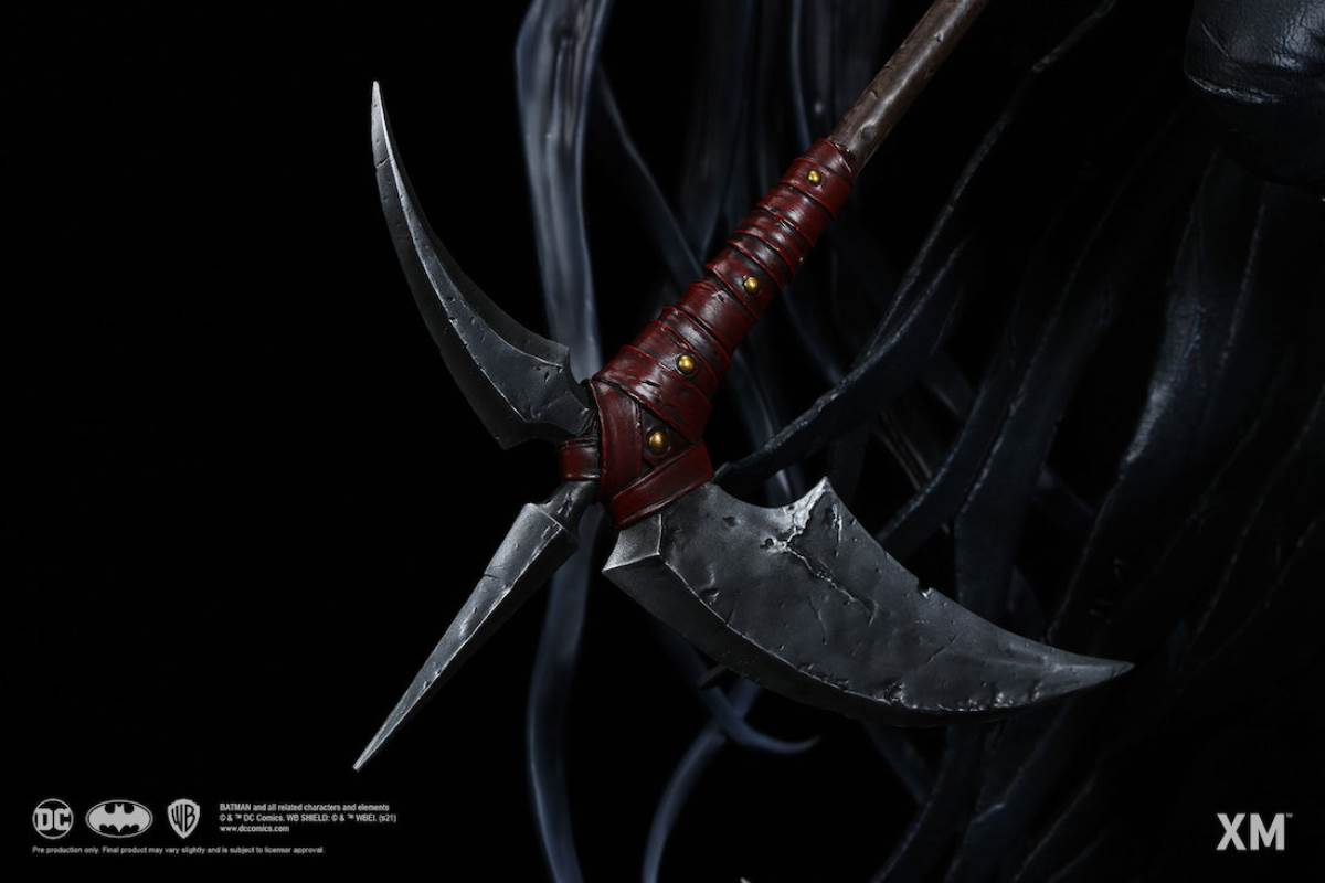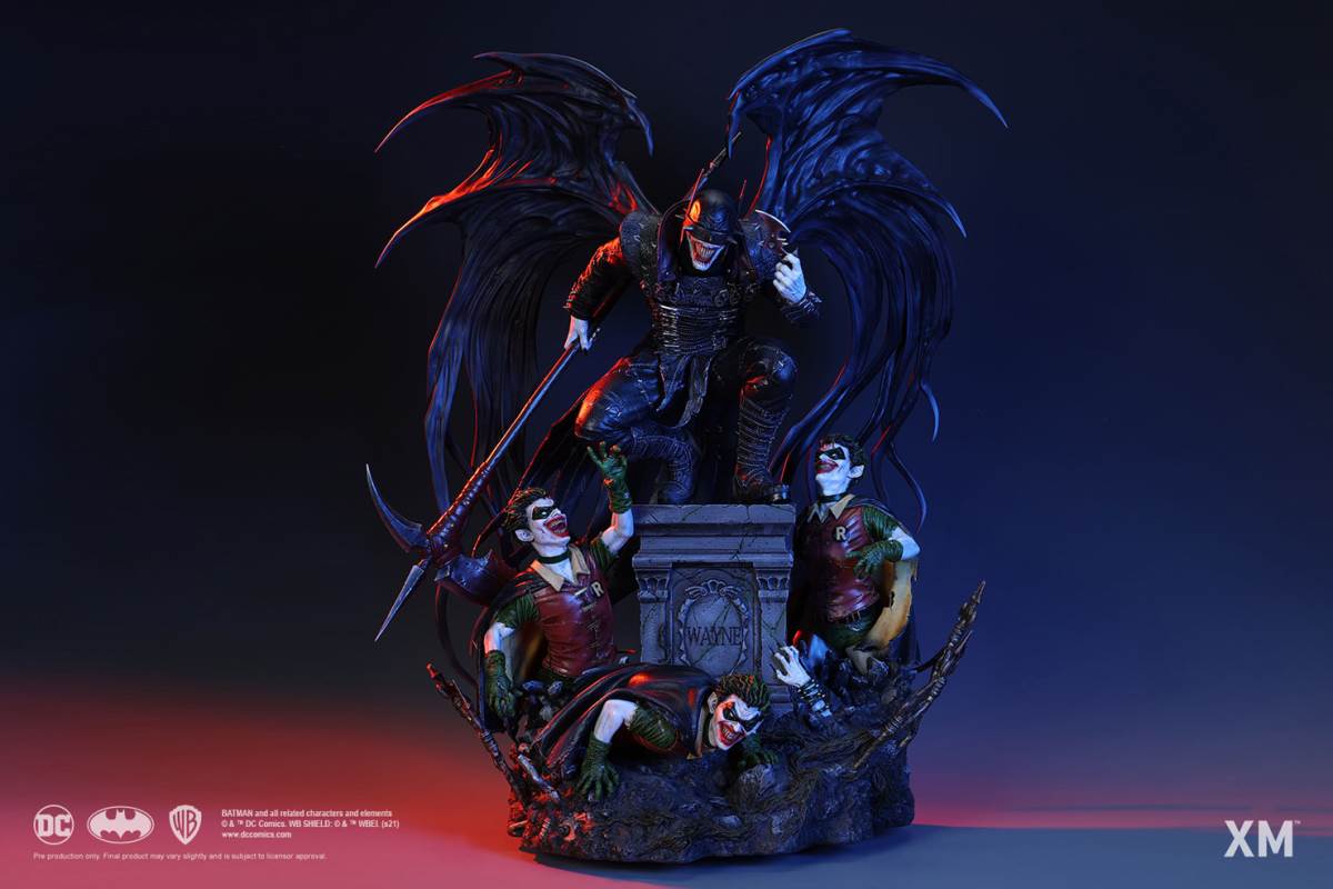 XM Studios is excited to present our first 1:4 DC Premium Collectibles Dark Knights Metal Series statue, The Batman Who Laughs! Immortalized in detailed 1:4 scale cold-cast porcelain. Each handcrafted statue is individually hand-painted with high quality finish.Pre-Order opens 10 Jul 2021, Sat, 6pm (UTC+8)Pre-Order before 24 Jul 2021, 6pm SGT (UTC+8) to receive a collectible Display Plaque as your early bird pre-order gift!Hailing from the Dark Multiverse, The Batman Who Laughs is the evil counterpart of Batman, a jokerized version of Batman who killed The Joker in his multiverse.A deadly combination of Bruce Wayne’s tactical intellect, The Joker’s amorality and thirst for chaos, The Batman Who Laughs is Batman’s worst nightmare, a version of himself who has lost all moral code and ethics, unrestrained in his madness.In this 1:4 statue, The Batman Who Laughs crouches atop the tomb of Bruce Wayne, a metaphorical representation of the death of his past moral code and the rules that once bind him, now unshackled. Within his chains, he leashes his 3 Rabid Robins, eager to devour and feast at the drop of a command.Take a closer look at the base and you will see a hand reaching from beneath the grave, its wrists adorned with spiked bracelets; Dark Robin is never far away...Features:3 Head Sculpt: 1 with the visor removed, 1 grinning, 1 laughing4 Left hand switch out: 1 holding spiked visor, 1 holding Batarang, 1 holding knife, 1 holding on chains2 right hand switch out: 1 holding scythe, 1 holding on chainsWings switch-out, collectors can choose to display Batman with wings or without.Crafted in cold cast porcelainEach handcrafted statue is individually hand-painted with the high quality finishES: MTO Max 699Artists:Riccardo Federici Alvaro Bernardes Cota Ribeiro, Joshua Wu (Sculpt)XM Studios Design and Development TeamProduct and Box Dimensions Estimated Product Size (LxBxHt): 67*50*75cmEstimated Product Weight: 16kgEstimated Box Size (LxBxHt): 89*69*47.5cmEstimated Box Weight: 30kg