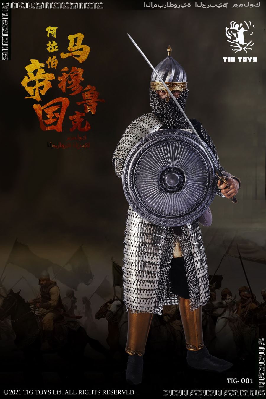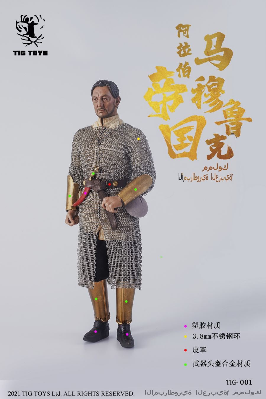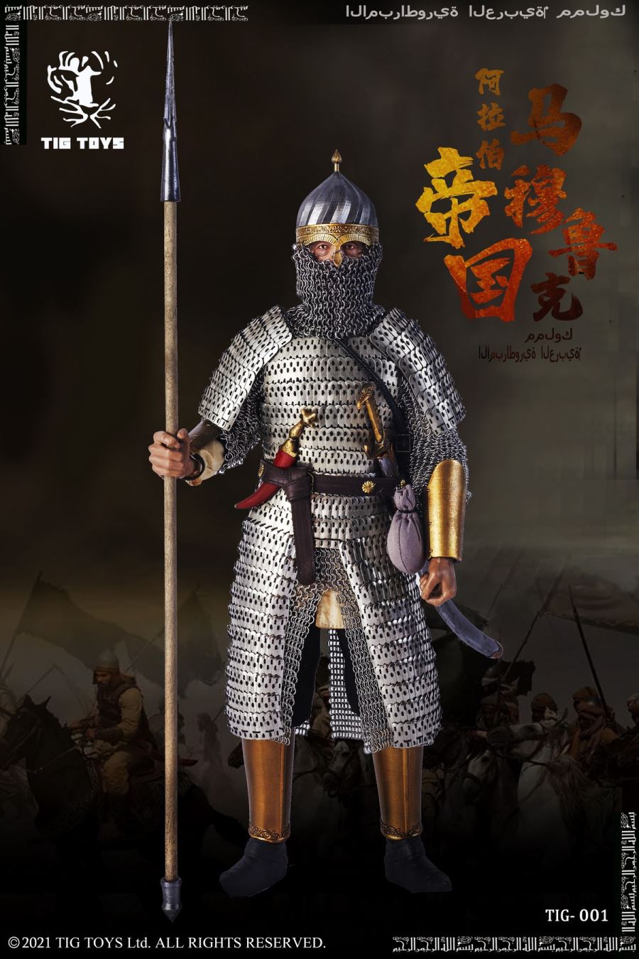 TIG TOYS 1/6 Arab empire seris-----mamluksTIG-001 configuration listing- head x 1- ferrite x 1- The shape of the hand x 7- helmet x 1- coat x1- The trousers x 1- The belt x 1- Kitty litter x 1- Chain mail x 1- The armor x 1- Toe nails x 2- Combat boots x 2- Hand a x 2- The spear x 1- knife x 1- Long dao x 1- The shield x 1- Folding bracket x 1- Folding bracket x 1