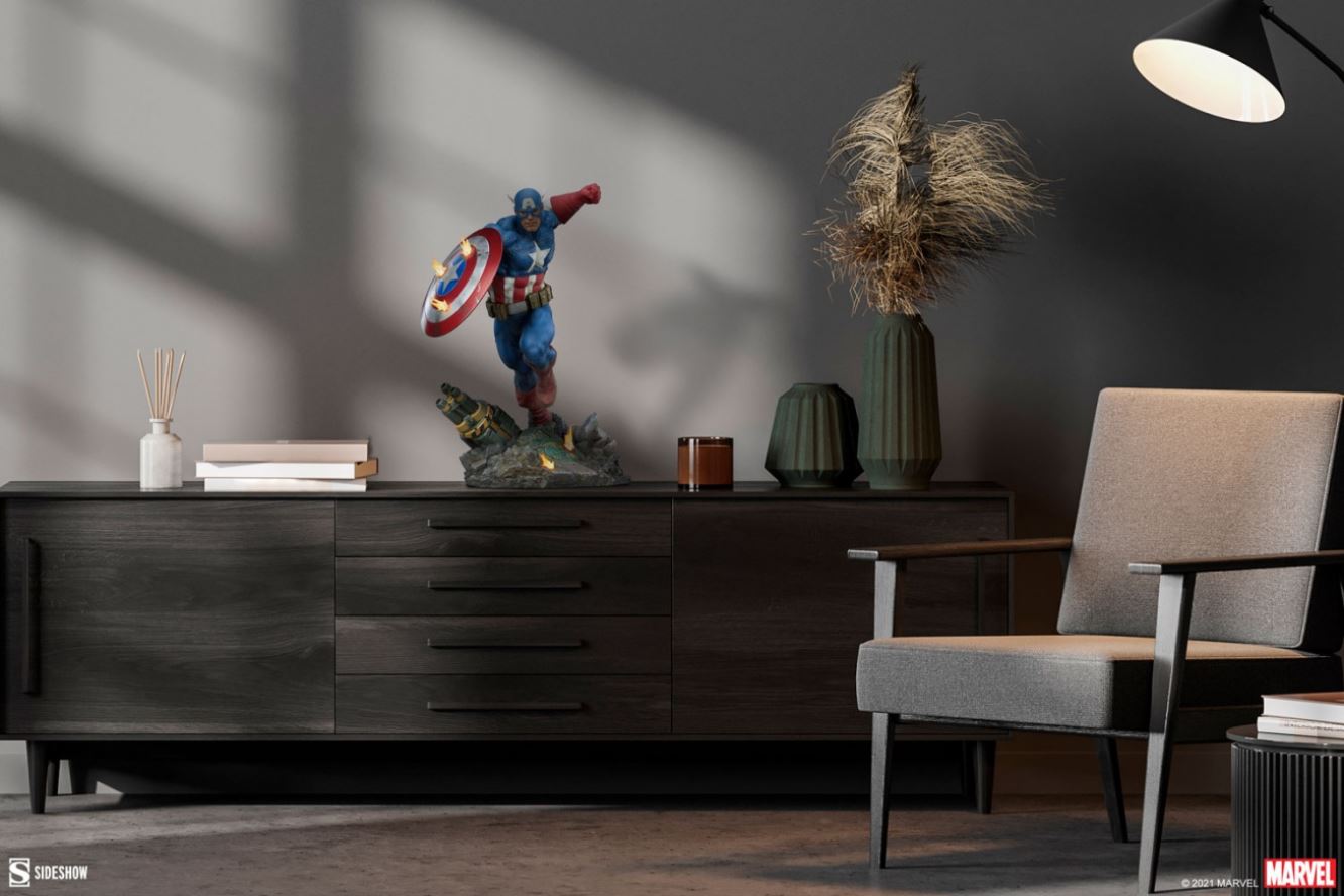 ฟิกเกอร์ Captain America Premium Format มีขนาดสูง 21” และลึก 22” ขณะที่ Steve Rogers พุ่งลงไปในสนามรบ ป้องกันการยิงของศัตรูด้วยโล่อันเป็นสัญลักษณ์ของเขาในท่าแอคชั่นไดนามิกนี้ อาวุธไฮดราสีเขียวและสีเหลืองถูกฝังไว้ใต้ฝ่าเท้าของเขา แคปและพรรคพวกของเขายึดครอง ขณะที่เขาปกป้องคุณค่าแห่งความหวังและอิสรภาพจากกองกำลังชั่วร้ายที่นำโดย Red Skull ซึ่งเป็นศัตรูคู่อาฆาตของเขา