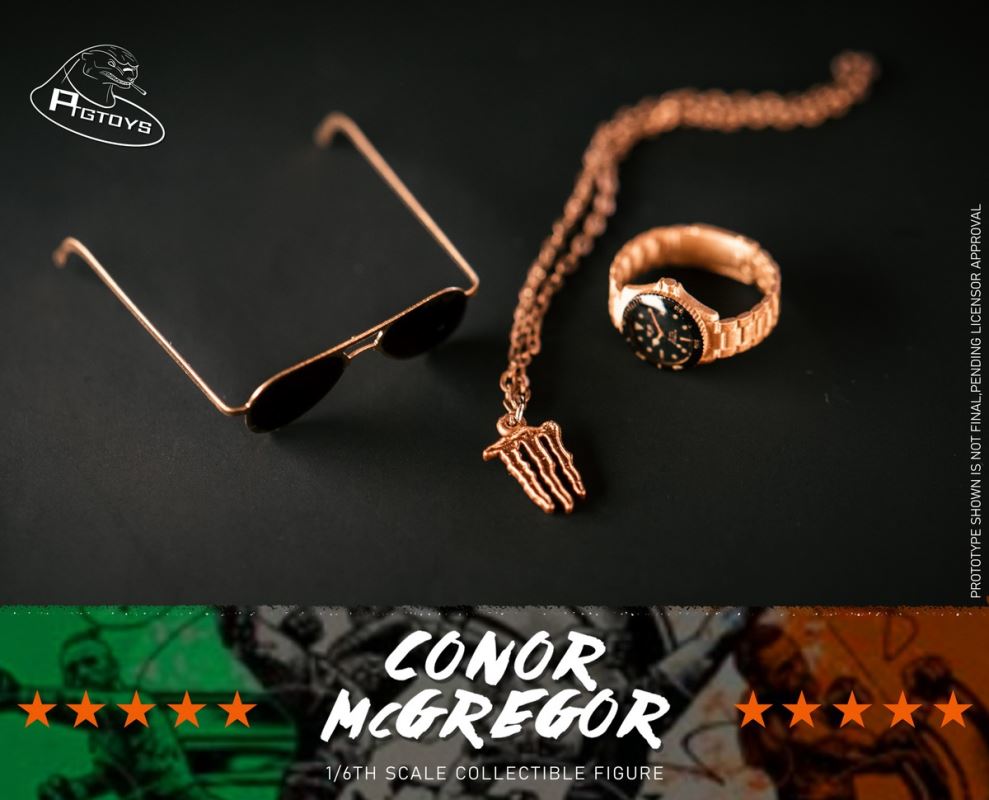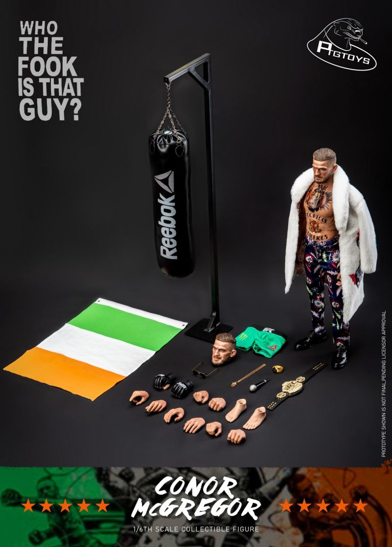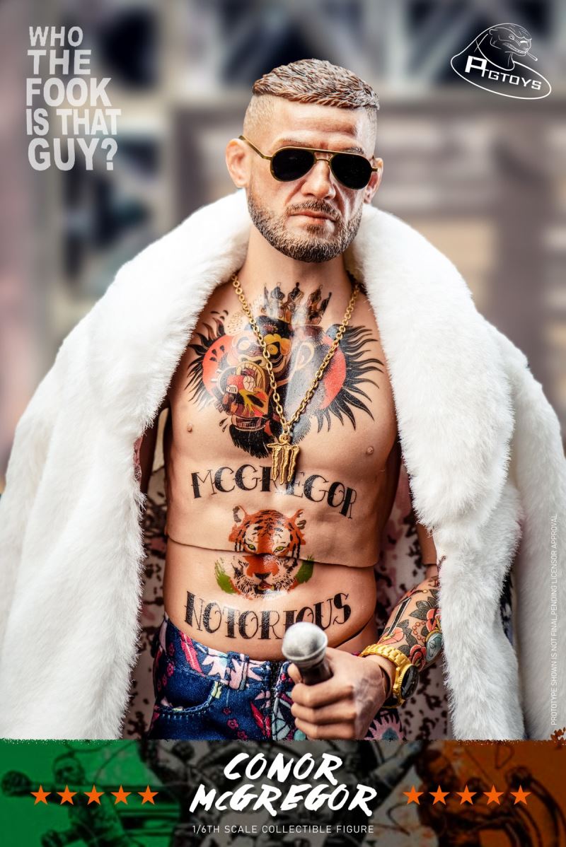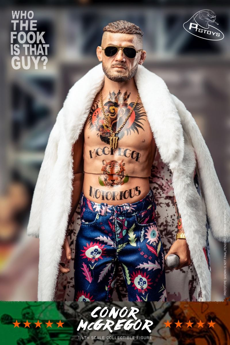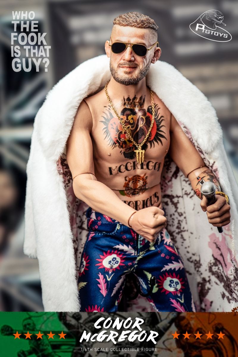 Ptgtoys1/6 Fighting King Mouth Gun CONOR Action figure CONOR MCGREGOR PT-8602 Accessories List1 Head carving(Fierce Version)2 Head carving (Funny version)3 Movable tattoo elements (one set)4 Flesh-colored hands (five pairs)5 Fighting Gloves (one pair)6 Sandbags (one set)7 wool coat (one piece)8 Fighting Shorts (one piece)9 Dress trousers (one piece)10 Necklaces (one)11 Leather shoes (one pair)12 Gold Belt (one)13 Microphone (one)14 Watch (one)15 Sunglasses (one pair)16 Irish Flag (one)