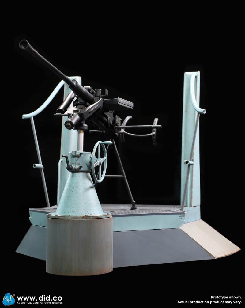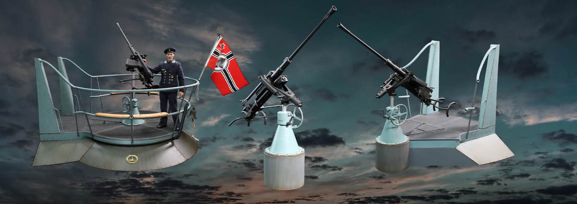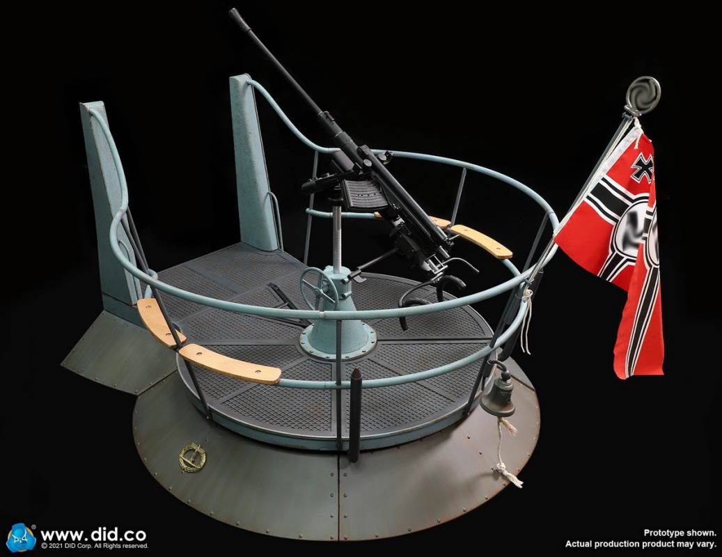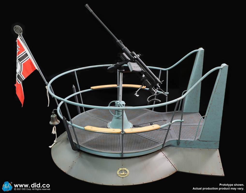 The deck gun is a 20mm Flak C/30 anti-aircraft gun, which is made of metal and plastic. The height is adjustable through spinning the wheel. The gun can be used on the shore for defence as well.