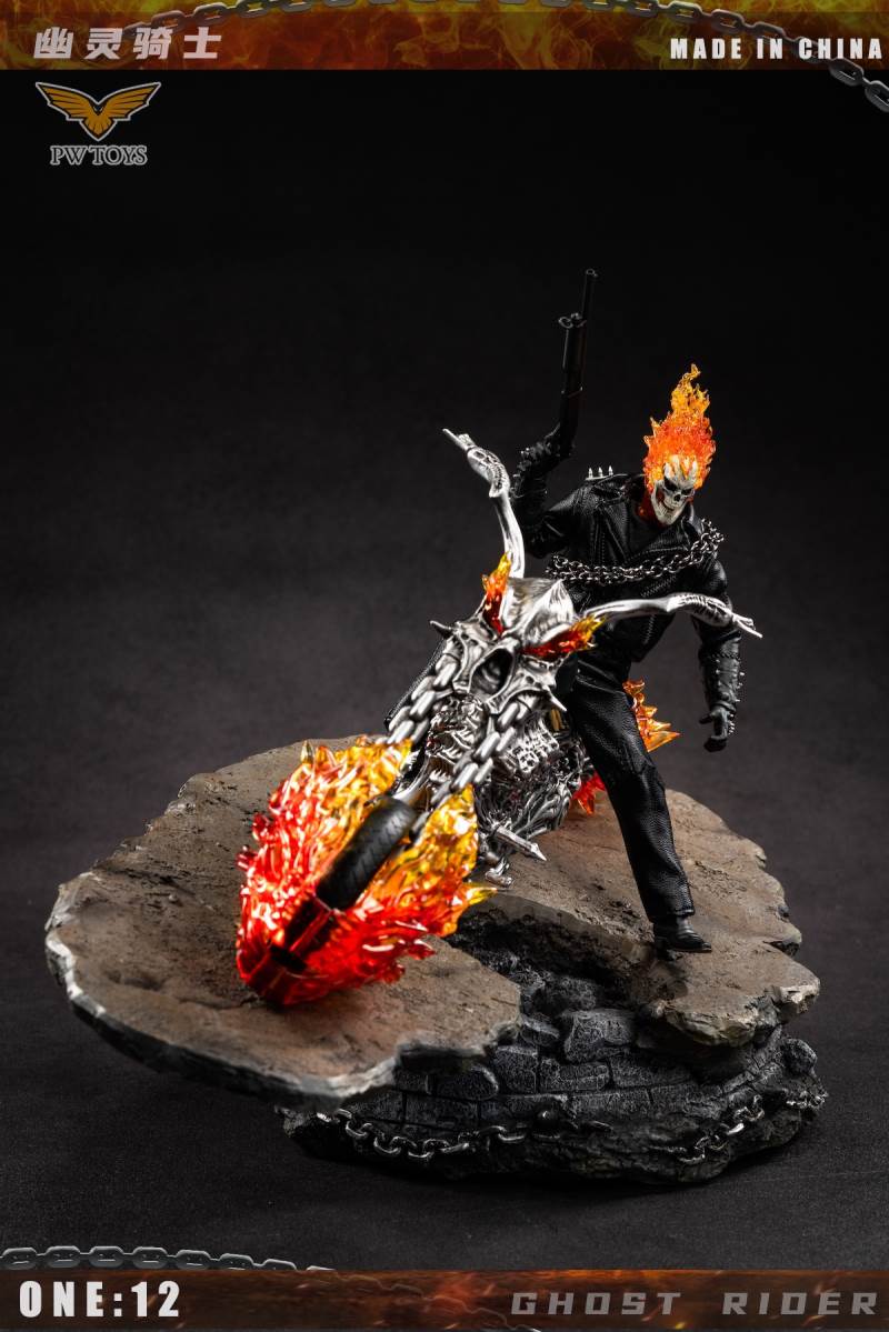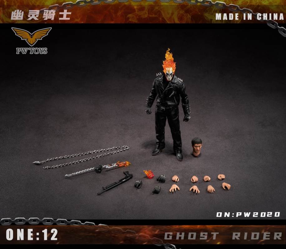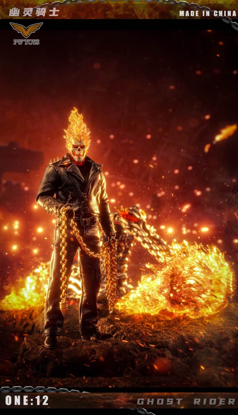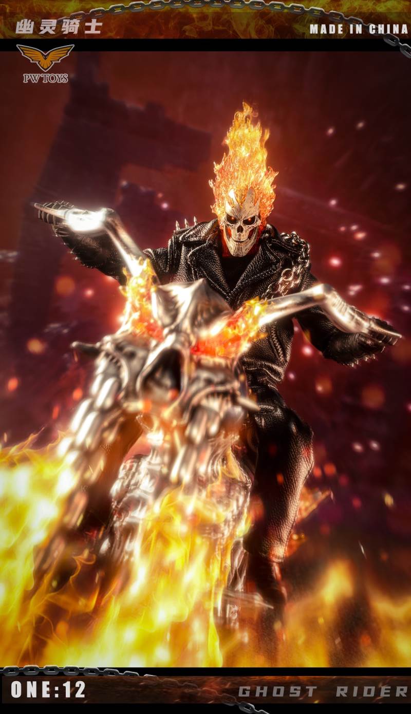 Product:PWTOYSName:Hell knights Scale:1/12 No:PW2020/PW2021/PW2022 Material:PVC/ABS/clothPW2022 size:36*19*10cm Perorder is available before:November 5, 2021 Release date:Q1 2022 Selling point:The head can glow The wheels can shineList:PW2020:1. Head sculpture*12. Skull sculpture (With Magnetron Light)*13. Super movable body*1 (CFTOYS)4. A pair of gloves hands with gun *25. A pair of holding gloved hand*26. A pair of flame gloved hand*17. A pair of holding chain flame gloved hand*18. Bare hands*89. Bracer*210. Iron chain*111.Shotgun*112.Black leather jacket*113.Leather pants*114.Belt*115.Black T-shirt *116.Leather shoes*217.Battery*518.Insulation sheet *3PW2021:1. ghost rider bike*1 (With lighting Function)PW2022:1Hell scenario*12rock*1
