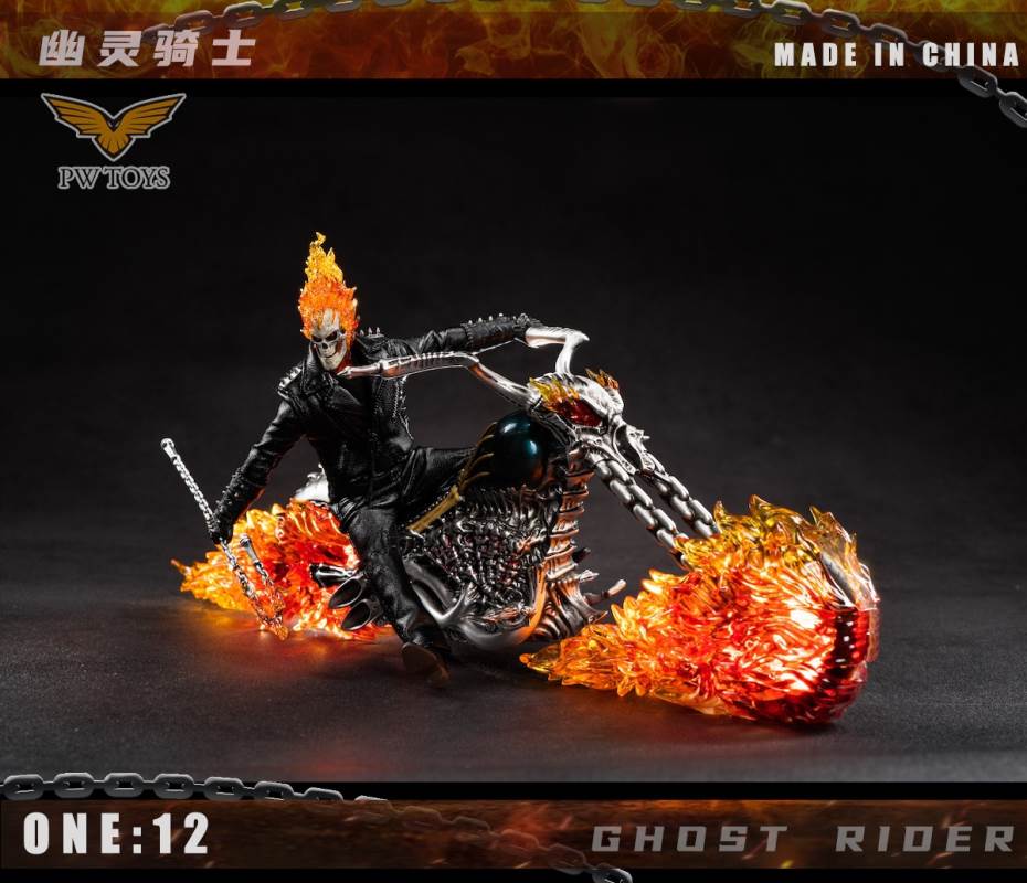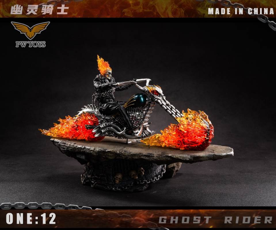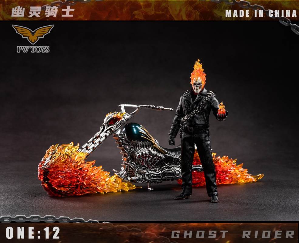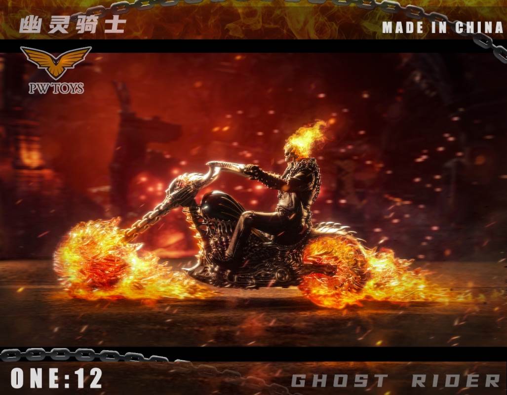 Product:PWTOYSName:Hell knights Scale:1/12 No:PW2020/PW2021/PW2022 Material:PVC/ABS/clothPW2022 size:36*19*10cm Perorder is available before:November 5, 2021 Release date:Q1 2022 Selling point:The head can glow The wheels can shineList:PW2020:1. Head sculpture*12. Skull sculpture (With Magnetron Light)*13. Super movable body*1 (CFTOYS)4. A pair of gloves hands with gun *25. A pair of holding gloved hand*26. A pair of flame gloved hand*17. A pair of holding chain flame gloved hand*18. Bare hands*89. Bracer*210. Iron chain*111.Shotgun*112.Black leather jacket*113.Leather pants*114.Belt*115.Black T-shirt *116.Leather shoes*217.Battery*518.Insulation sheet *3PW2021:1. ghost rider bike*1 (With lighting Function)PW2022:1Hell scenario*12rock*1