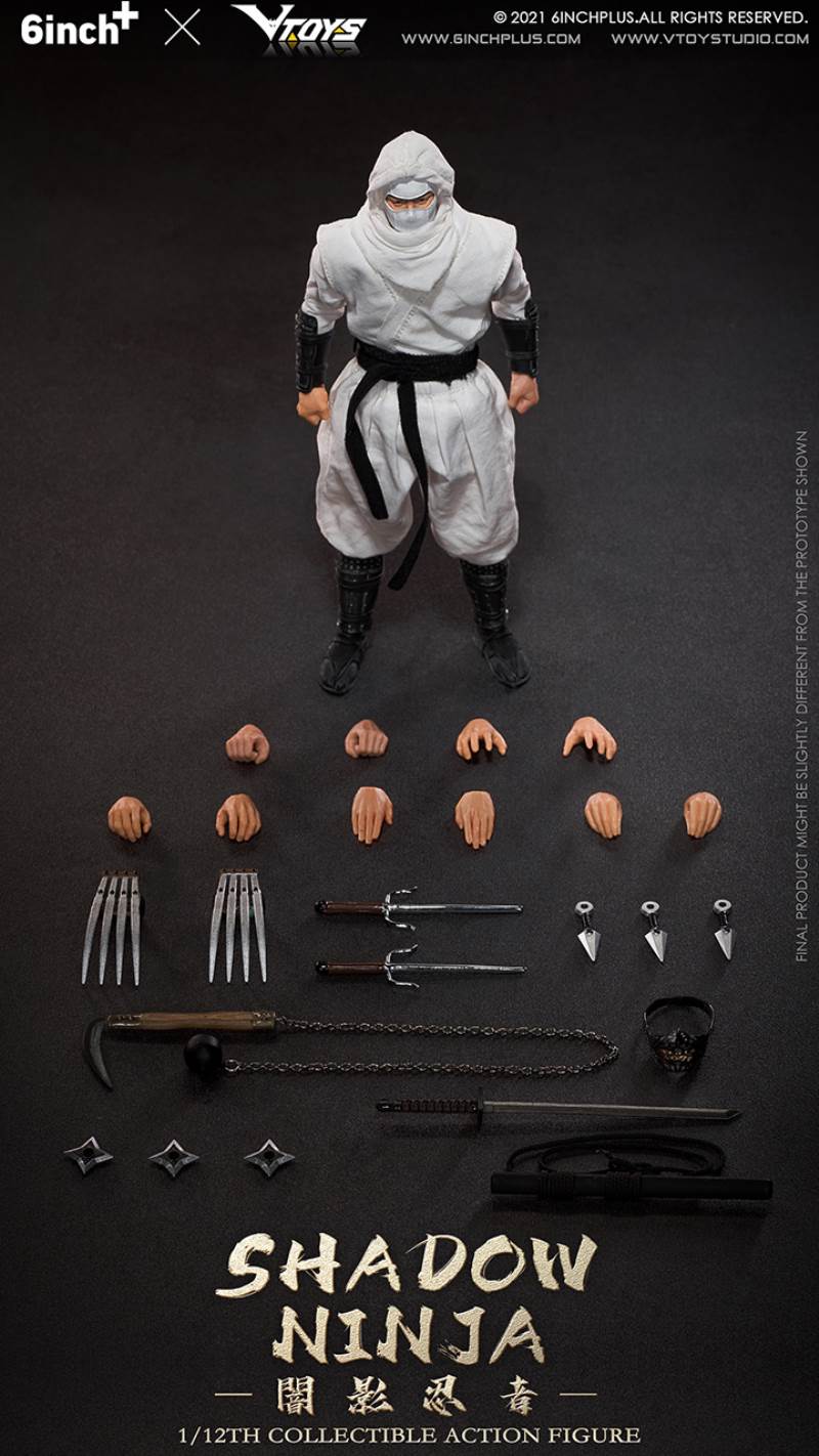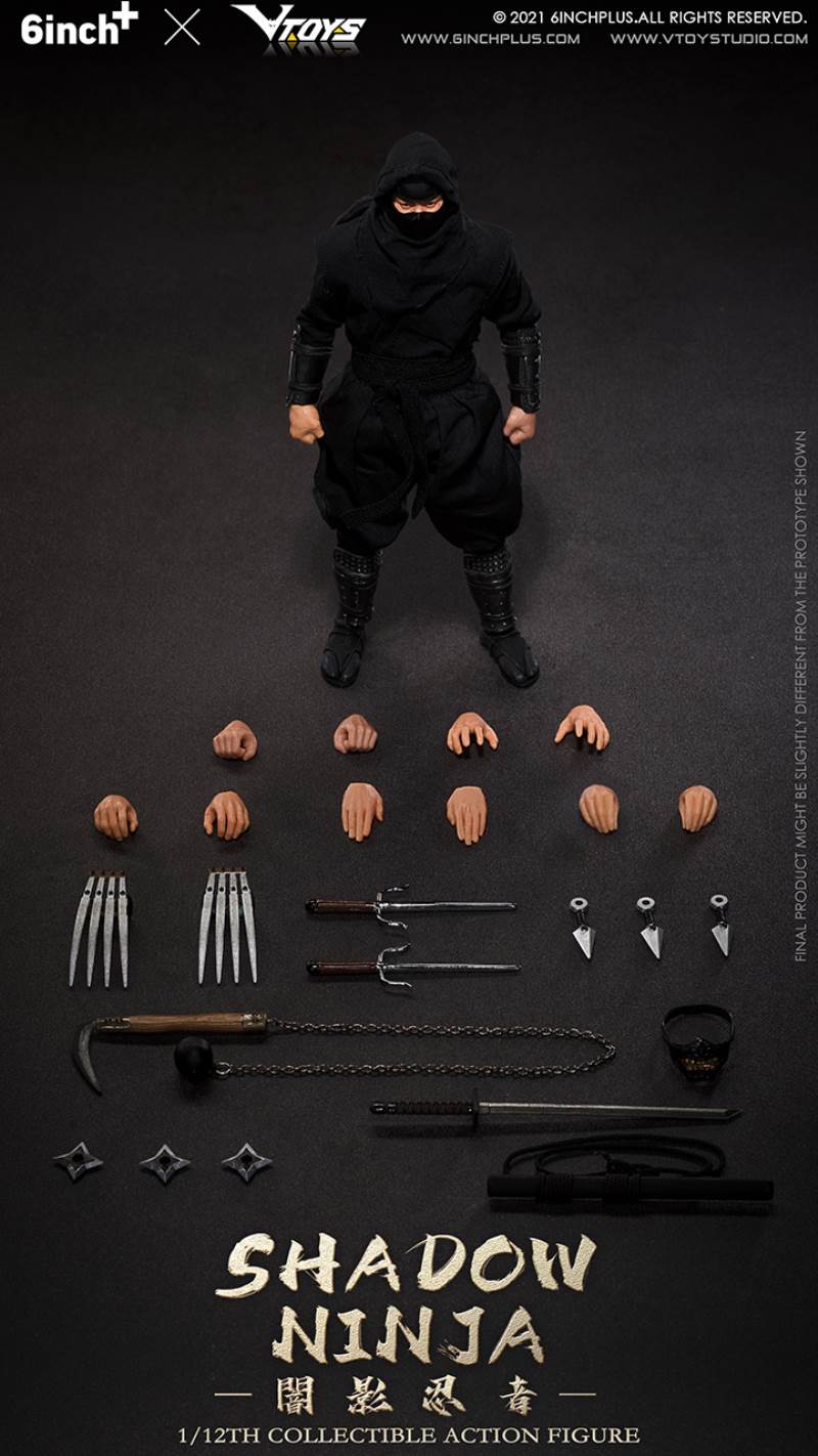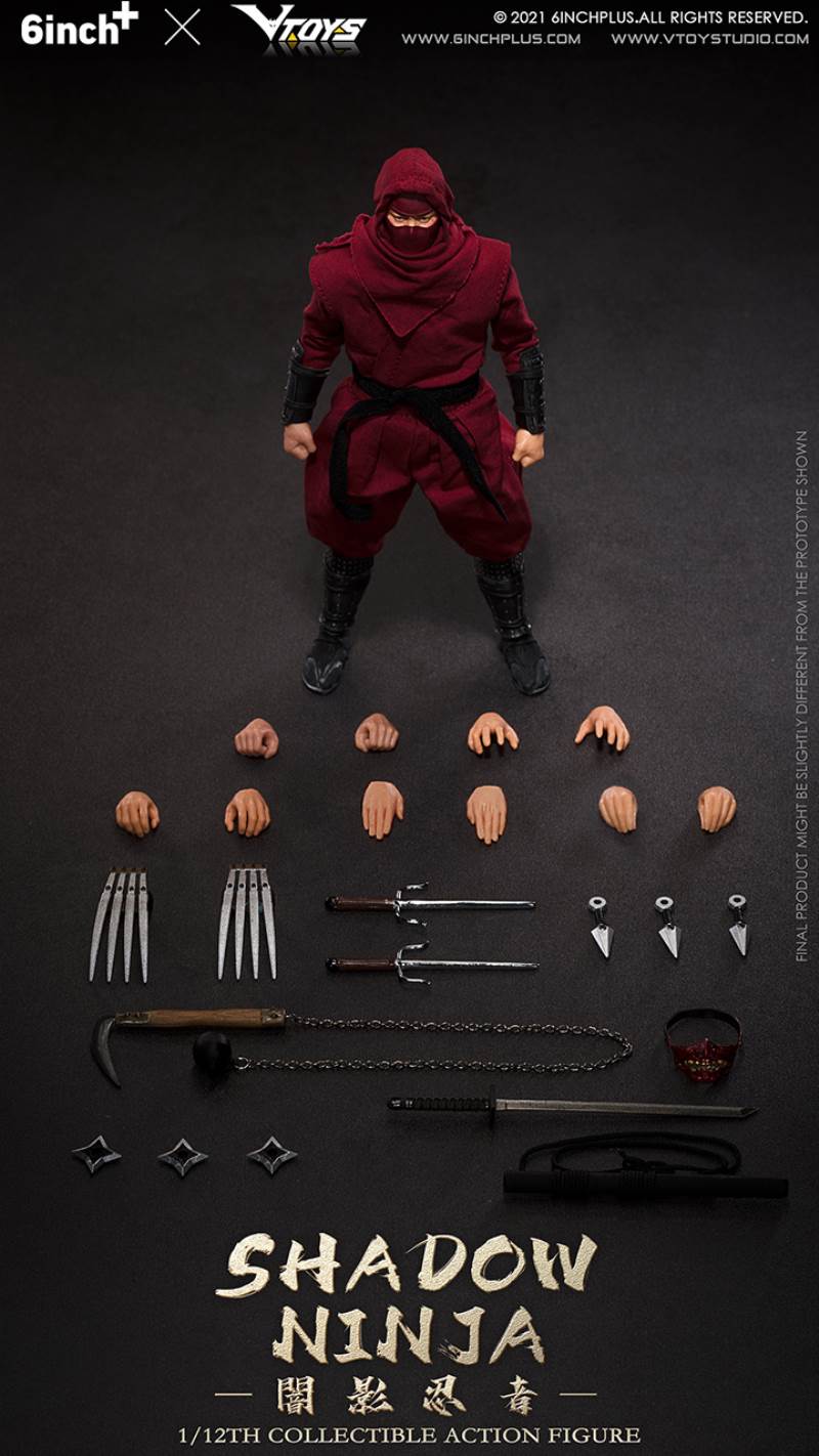 VTOYS X 6INCH+ Shadow Ninja 6inch 1/12 Collectible Action FigureBrand: 6INCH+ X VTOYSScale: 1/12Size: About 16cm highType: Collectible Action FigureProduct No.:SN001(black) ;SN002(red);SN003(white)Deadline: November 26, 2021Release Time : First quarter of 2022Official spot price: 399 rmbAccessories:Body x1Head carving x1Hand x12Ninja clothes x1Ninja knife x1Scabbard x1Prajna mask x1Kunai x3Lock sickle x1Triangular steel fork x2Four corner dart x3Steel claw x2
