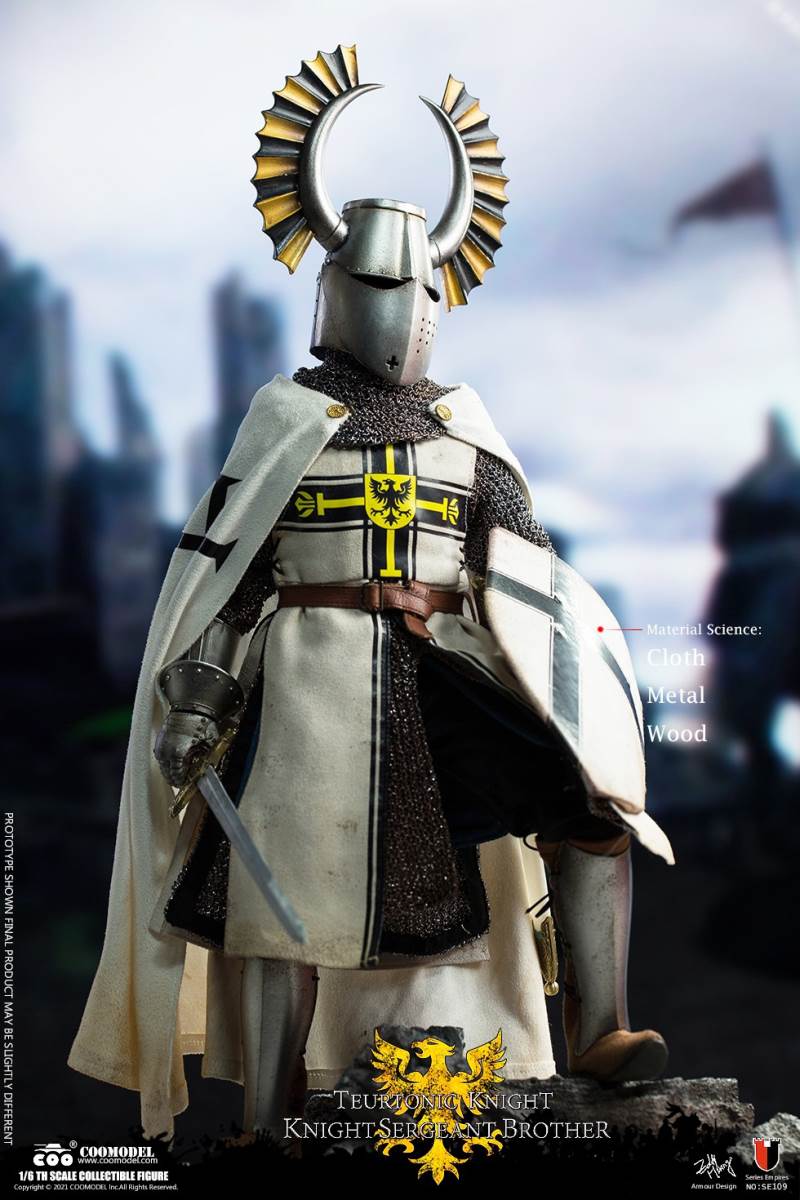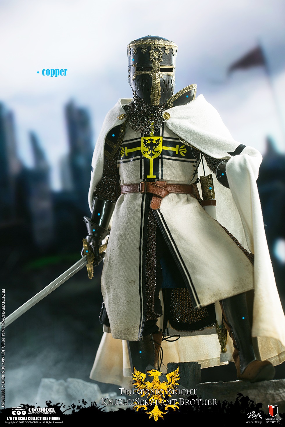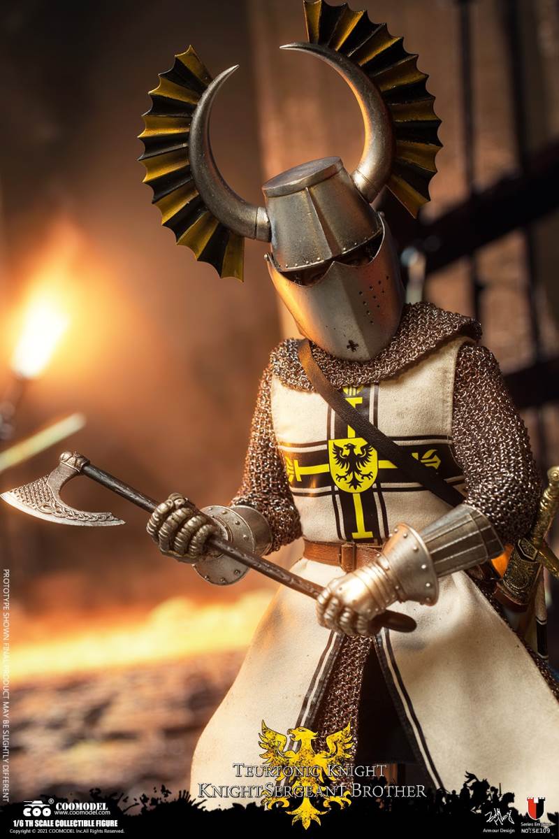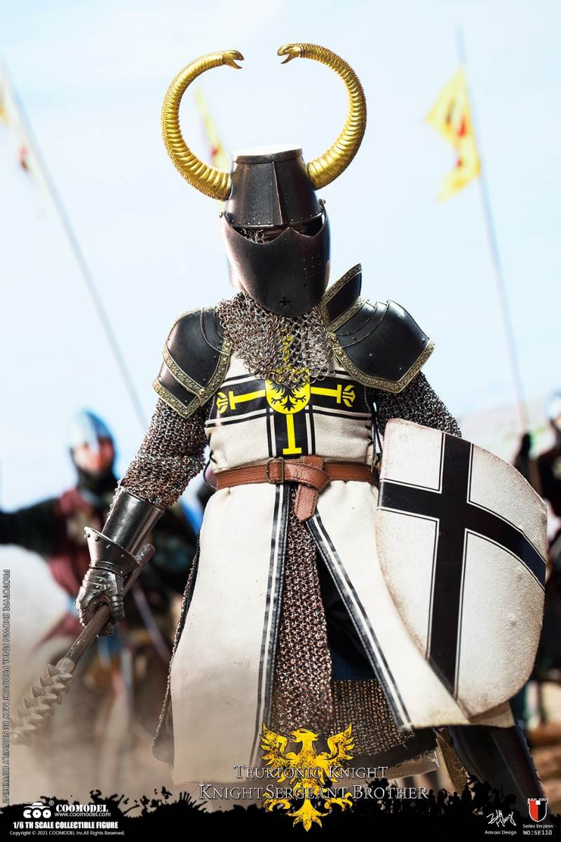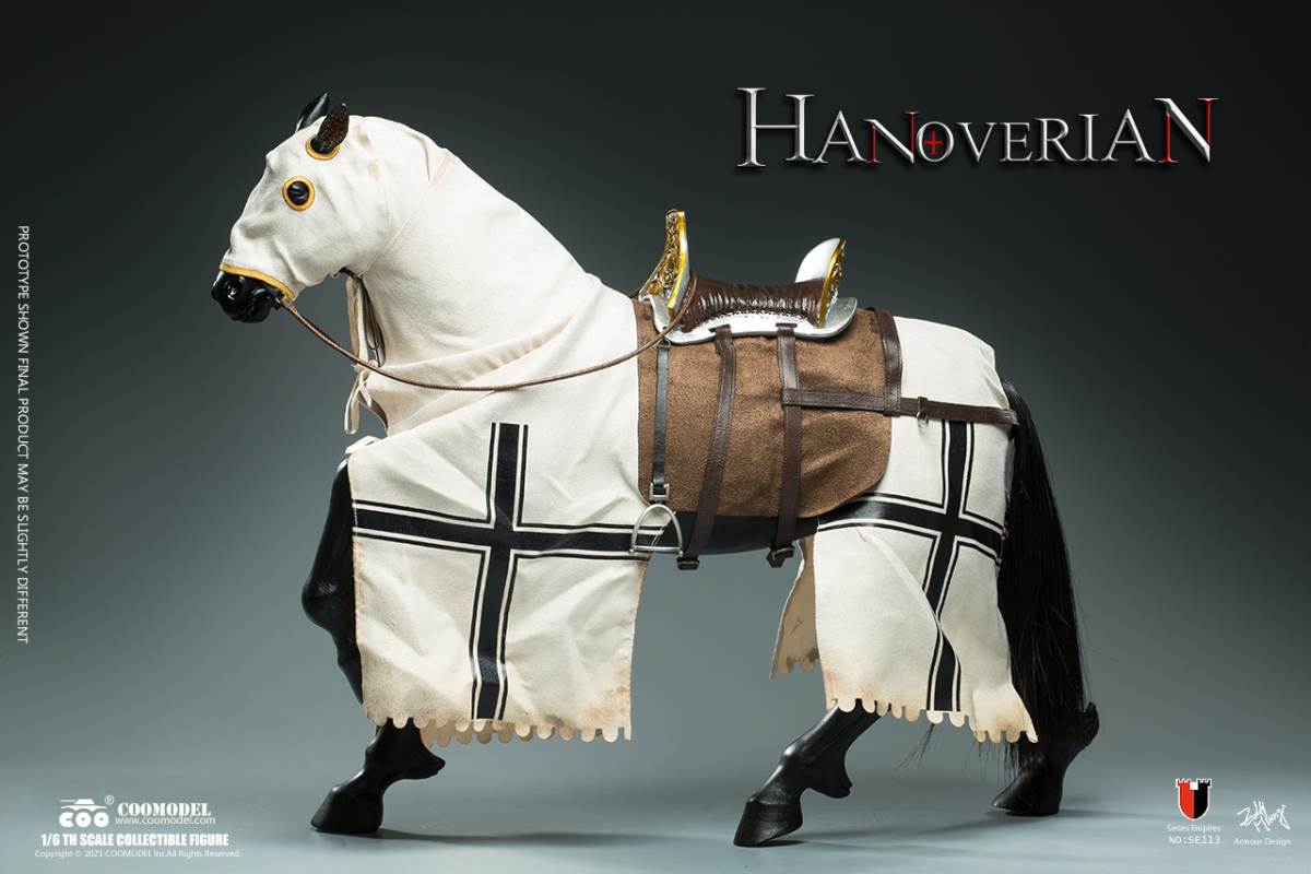 COOMODEL 1/6 SE109 SERIES OF EMPIRES - TEUTONIC SERGEANT (STANDARD ALLOY VERSION)BARCODE: 6971242121720The 1/6 Scale Teutonic Sergeant (Standard Ver.) Action Figure Specially Features:- One (1) head sculpt with fabric beard- One (1) super active body- Six (6) pieces of interchangeable palms- Four (4) pieces of gloved plamsCostumes and Armors:- One (1) black shirt- One (1) pair of black pants- One (1) chain armor- One (1) white robe with black cross- One (1) leather belt- One (1) alloy horned helmet- One (1) chain-armored mask- One (1) pair of alloy vambraces- One (1) pair of alloy wrist armors- One (1) pair of alloy cuisses- One (1) pair of leather boots- One (1) white cloak with black crossWeapons:- One (1) alloy sword- One (1) scabbard- One (1) axe- One (1) white alloy shiledAccessory:- One (1) black figure stand=============COOMODEL 1/6 SE113 Empire Series - Hannuoweima (dark horse)Bar Code: 6971242121768configuration list:- Black Hannuoweima- a white cross mask Ma clothing- leather mattress- saddle and stirrups- reinsCOOMODEL 1/6 SE113 SERIES OF EMPIRES - HANOVERIAN HORSEBARCODE: 6971242121768The Percheron Horse Set Specially Features :-One(1) black Hanoverian horse-One (1) suit of white horse mask and coat-One (1) saddle pad-One (1) saddle with stirrups-One (1) bridle