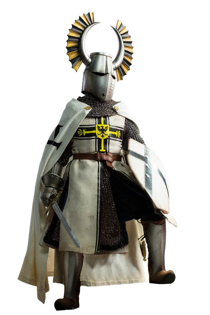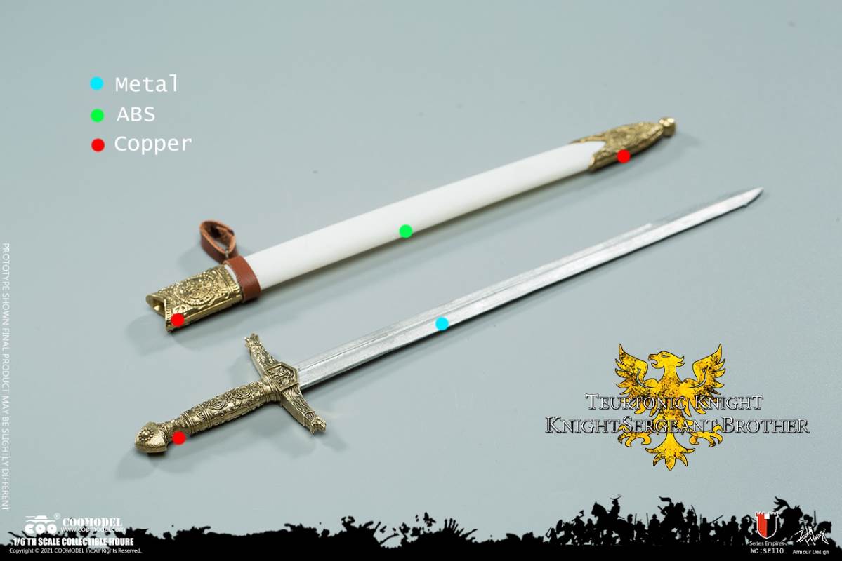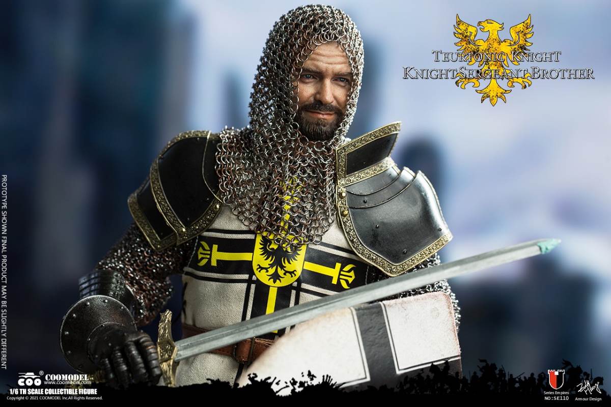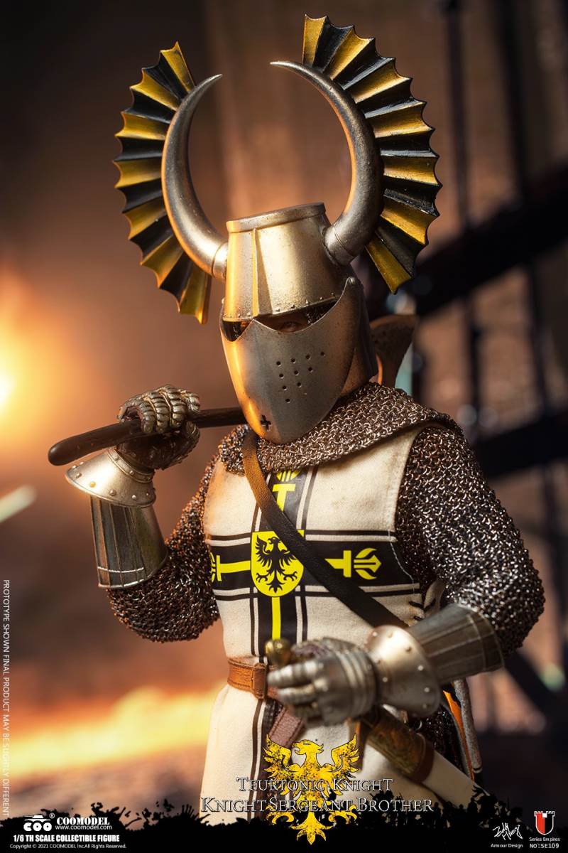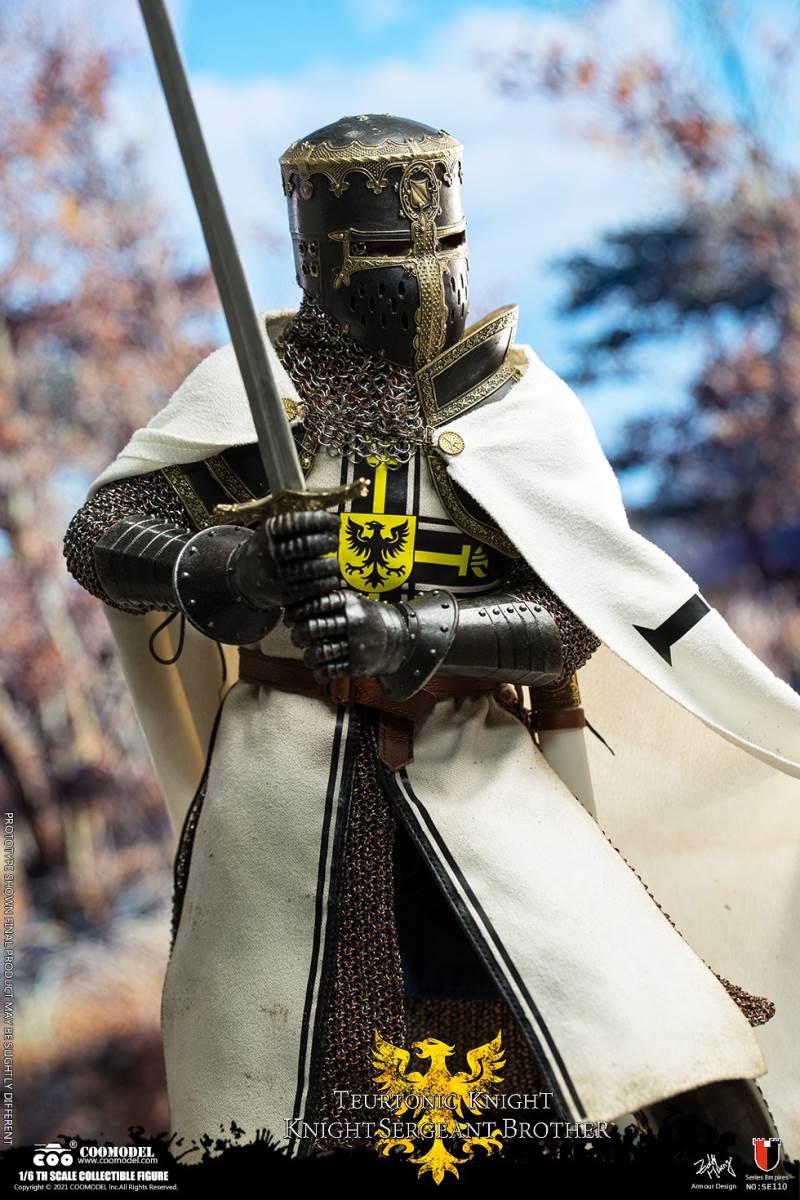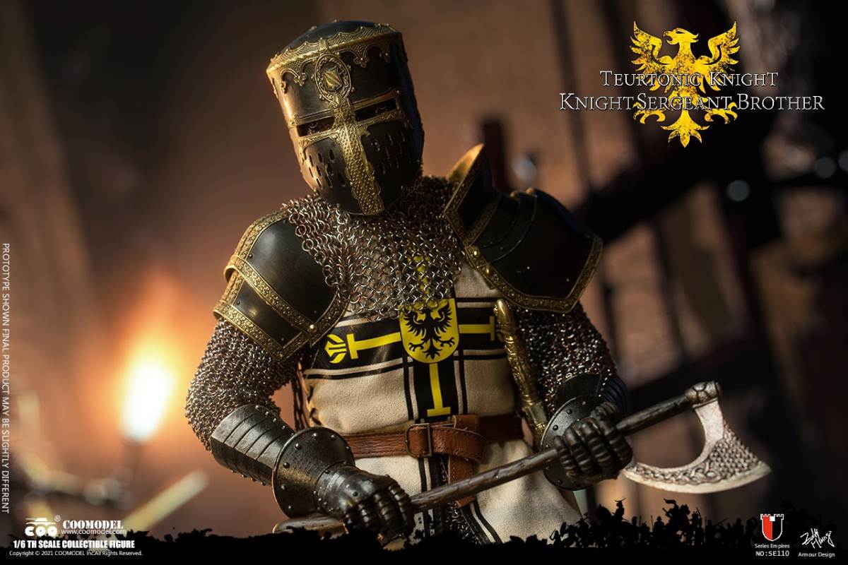 COOMODEL 1/6 SE109 SERIES OF EMPIRES - TEUTONIC SERGEANT (STANDARD ALLOY VERSION)BARCODE: 6971242121720The 1/6 Scale Teutonic Sergeant (Standard Ver.) Action Figure Specially Features:- One (1) head sculpt with fabric beard- One (1) super active body- Six (6) pieces of interchangeable palms- Four (4) pieces of gloved plamsCostumes and Armors:- One (1) black shirt- One (1) pair of black pants- One (1) chain armor- One (1) white robe with black cross- One (1) leather belt- One (1) alloy horned helmet- One (1) chain-armored mask- One (1) pair of alloy vambraces- One (1) pair of alloy wrist armors- One (1) pair of alloy cuisses- One (1) pair of leather boots- One (1) white cloak with black crossWeapons:- One (1) alloy sword- One (1) scabbard- One (1) axe- One (1) white alloy shiledAccessory:- One (1) black figure stand=============COOMODEL 1/6 SE113 Empire Series - Hannuoweima (dark horse)Bar Code: 6971242121768configuration list:- Black Hannuoweima- a white cross mask Ma clothing- leather mattress- saddle and stirrups- reinsCOOMODEL 1/6 SE113 SERIES OF EMPIRES - HANOVERIAN HORSEBARCODE: 6971242121768The Percheron Horse Set Specially Features :-One(1) black Hanoverian horse-One (1) suit of white horse mask and coat-One (1) saddle pad-One (1) saddle with stirrups-One (1) bridle