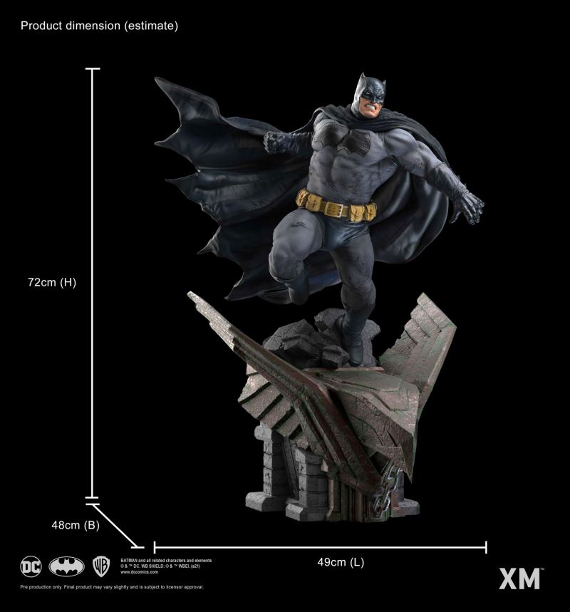 Presenting Batman: The Dark Knight Returns premium collectibles line! One that Batman fans have been waiting for: the iconic, well-loved Batman from The Dark Knight Returns comics series is here in 1:4 and 1:6 scale. 1:6 scale is available Worldwide while 1:4 Scale is available in Singapore, Malaysia, Thailand, Philippines, Indonesia, Vietnam, TaiwanThis page is for Batman: The Dark Knight Returns 1:6 scale. For 1:4 Scale, please click hereStaying true to the overall character design and set up, with the iconic Batman emblem on full display, this statue collectible immortalises the starting point of an adrenaline filled action scene as Batman leaps off an eagle gargoyle, fist raised, ready to land a series of bloody, jaw breaking punches. Features: 2 hand switchoutsCrafted in polystone.Each handcrafted statue is individually hand-painted with the high quality finishArtists Involved:Rafa Sandoval (2D)Tiago Rios (3D)XM Studios Design and Development TeamManufactured by: XM StudiosNote: Render shown and pending final approval, final product may differ. Batteries will not be included for products with light up features due to customs. Product and Box DimensionsEstimated Product Size (LxBxHt): 32.7x32x48 cmEstimated Product Weight : 8 kg Estimated Box Size (LxBxHt): 62×46×30.5 cmEstimated Shipping Weight : 11.5 kg
