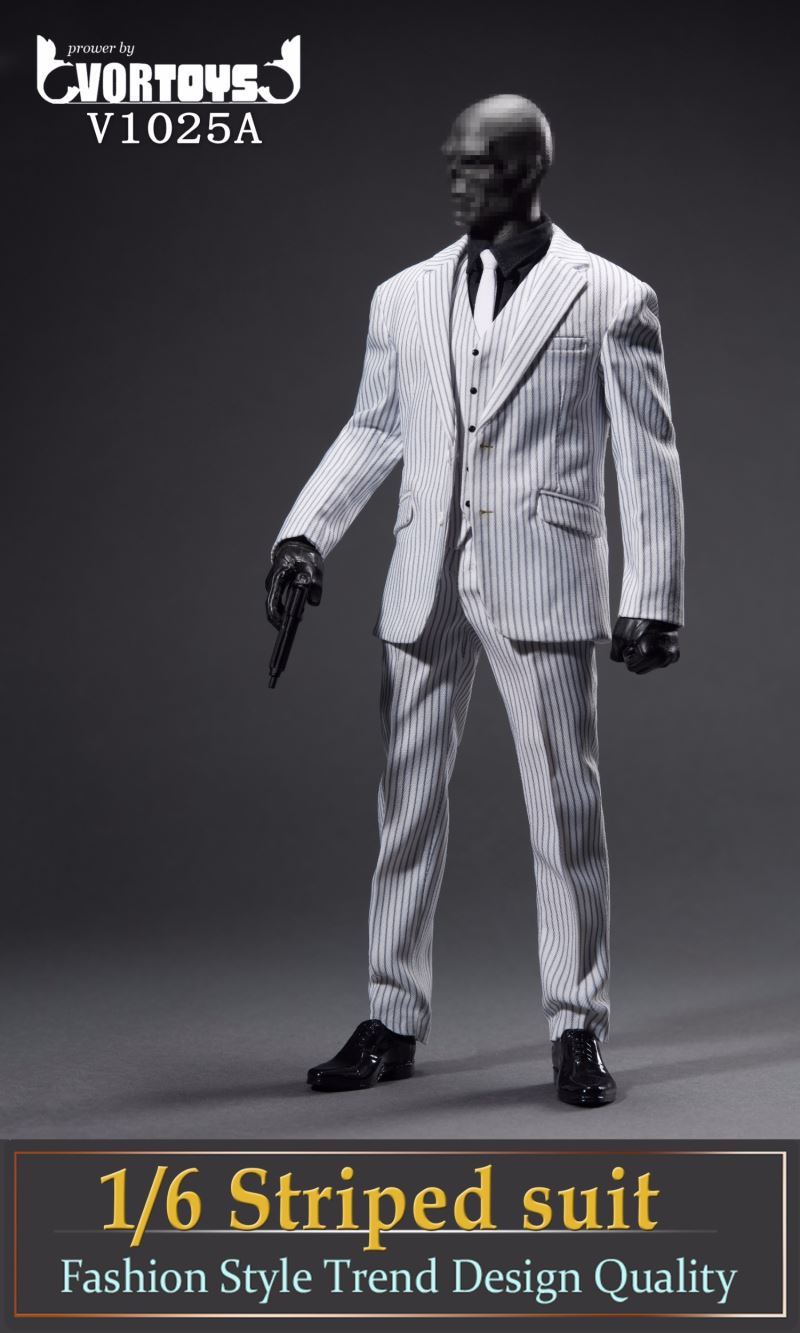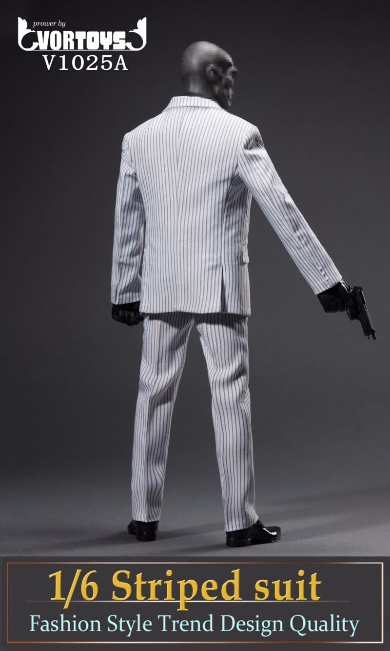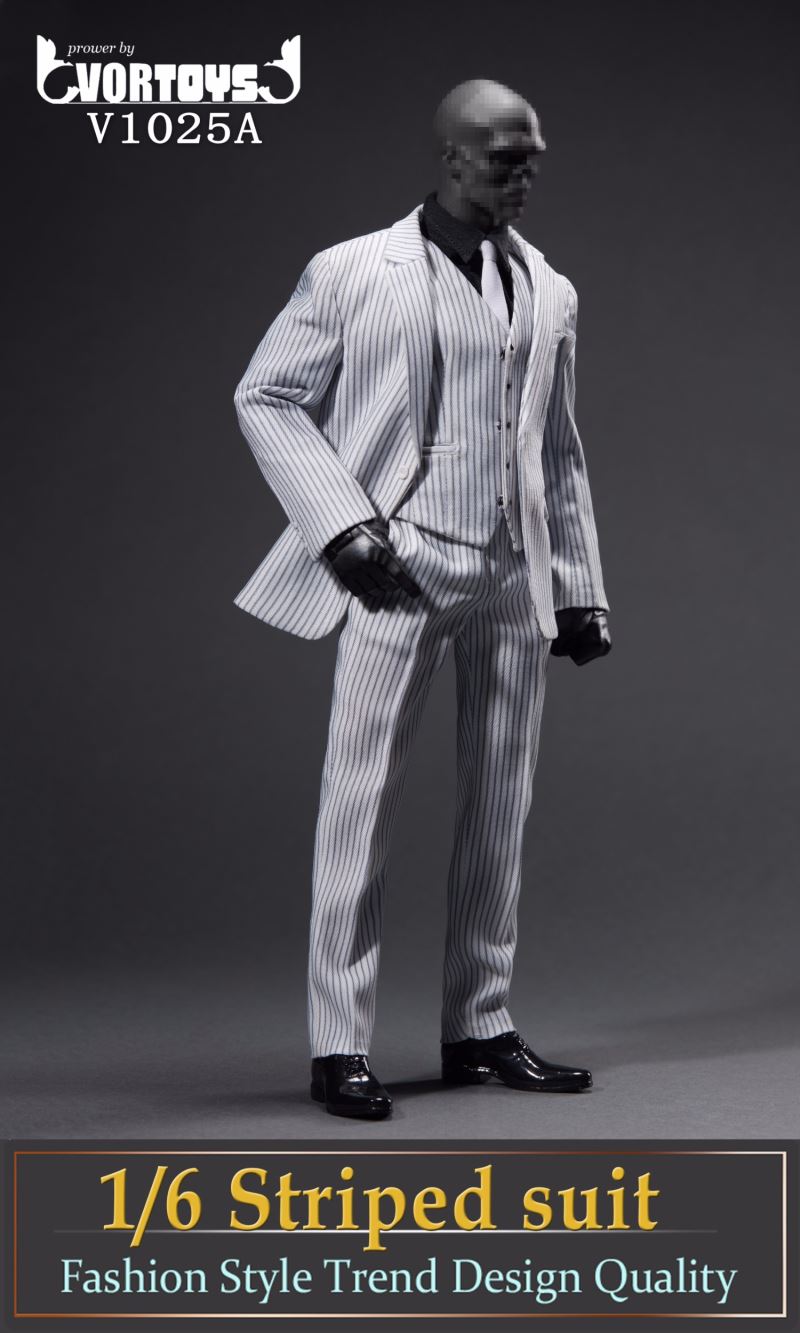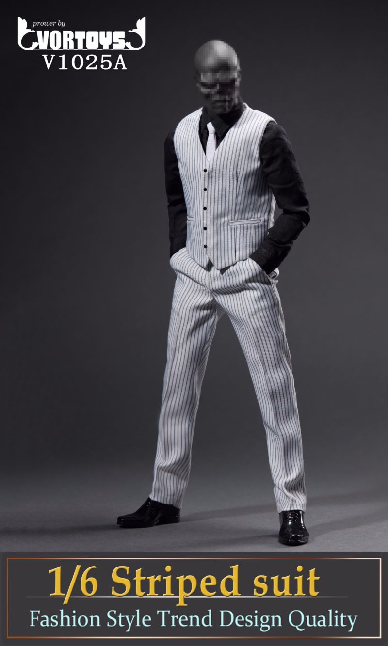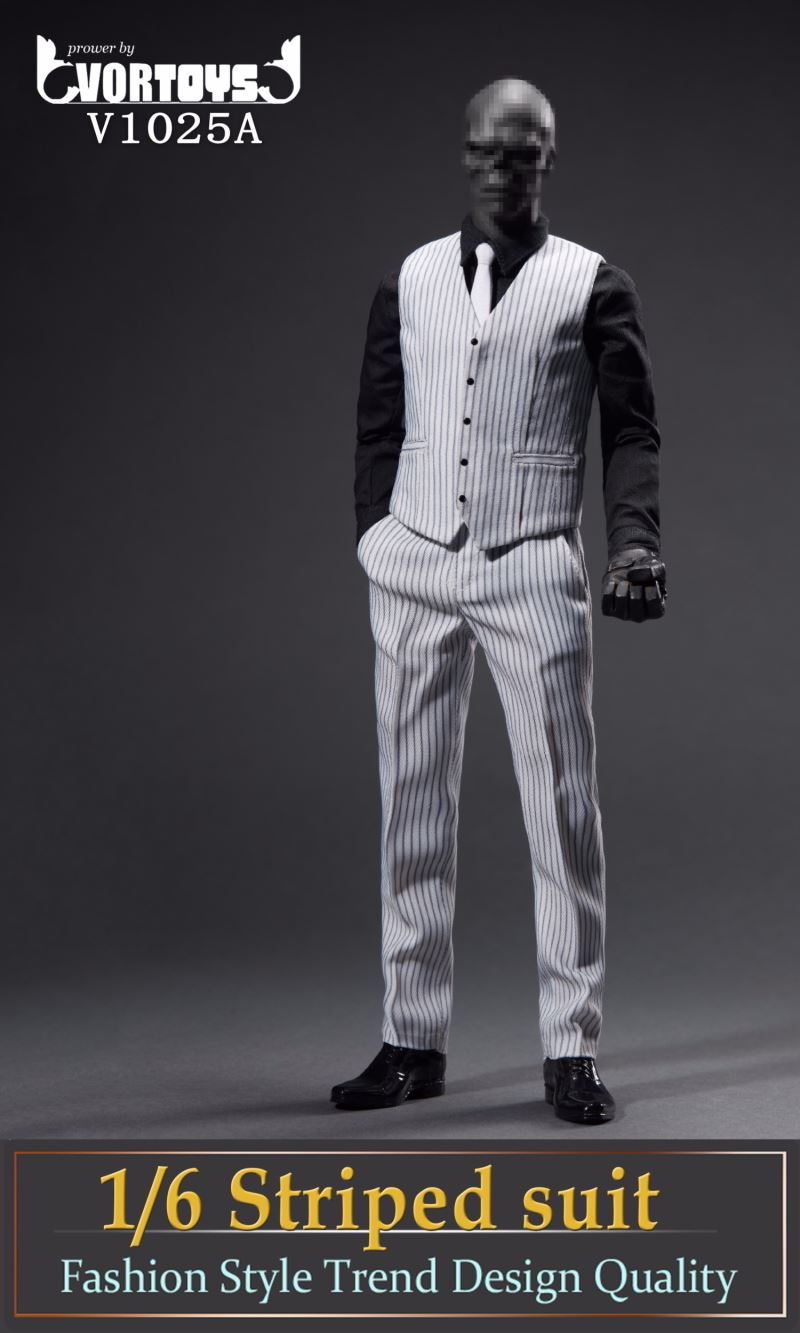 Brand: VORTOYSName: Men's Striped Suit SuitsNumber: V1025A V1025BList:Suit Jacket (A striped white and B striped black)shirt,waistcoat,trousers,tie,belt,leather shoesDescription: The narrow-shoulder body with COOMODEL has the best effect (pictured) The template is COOMODEL BD001 body).