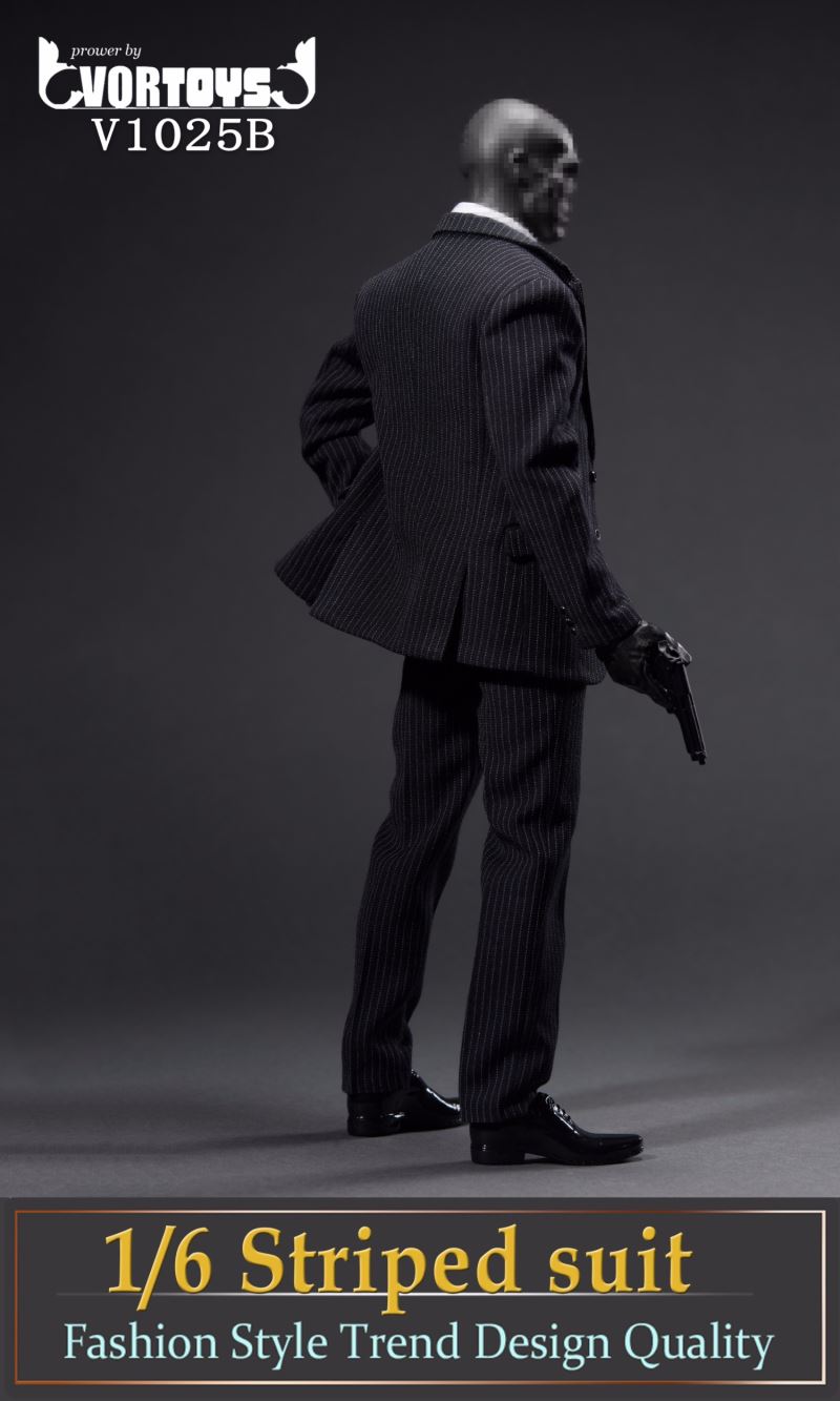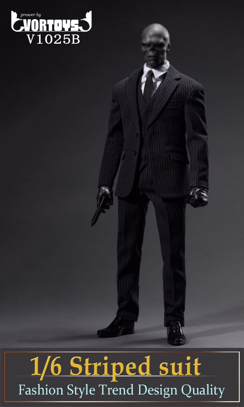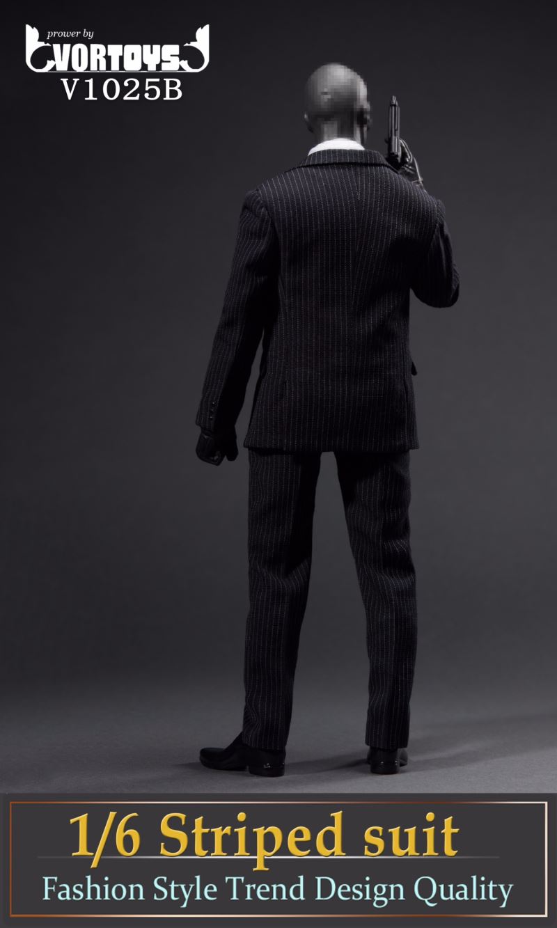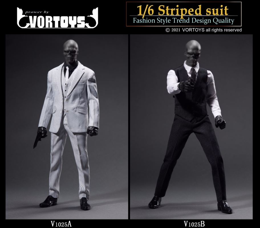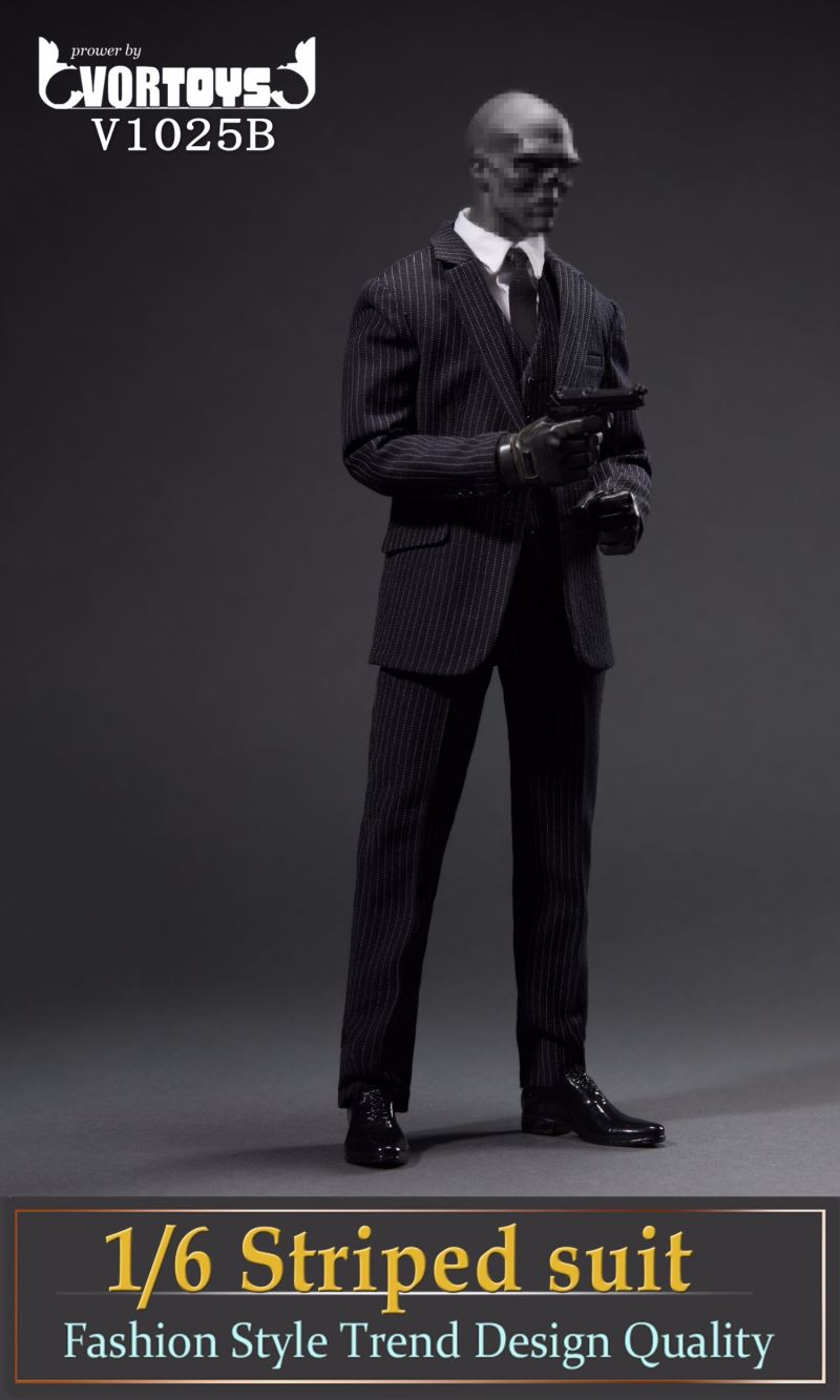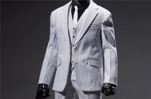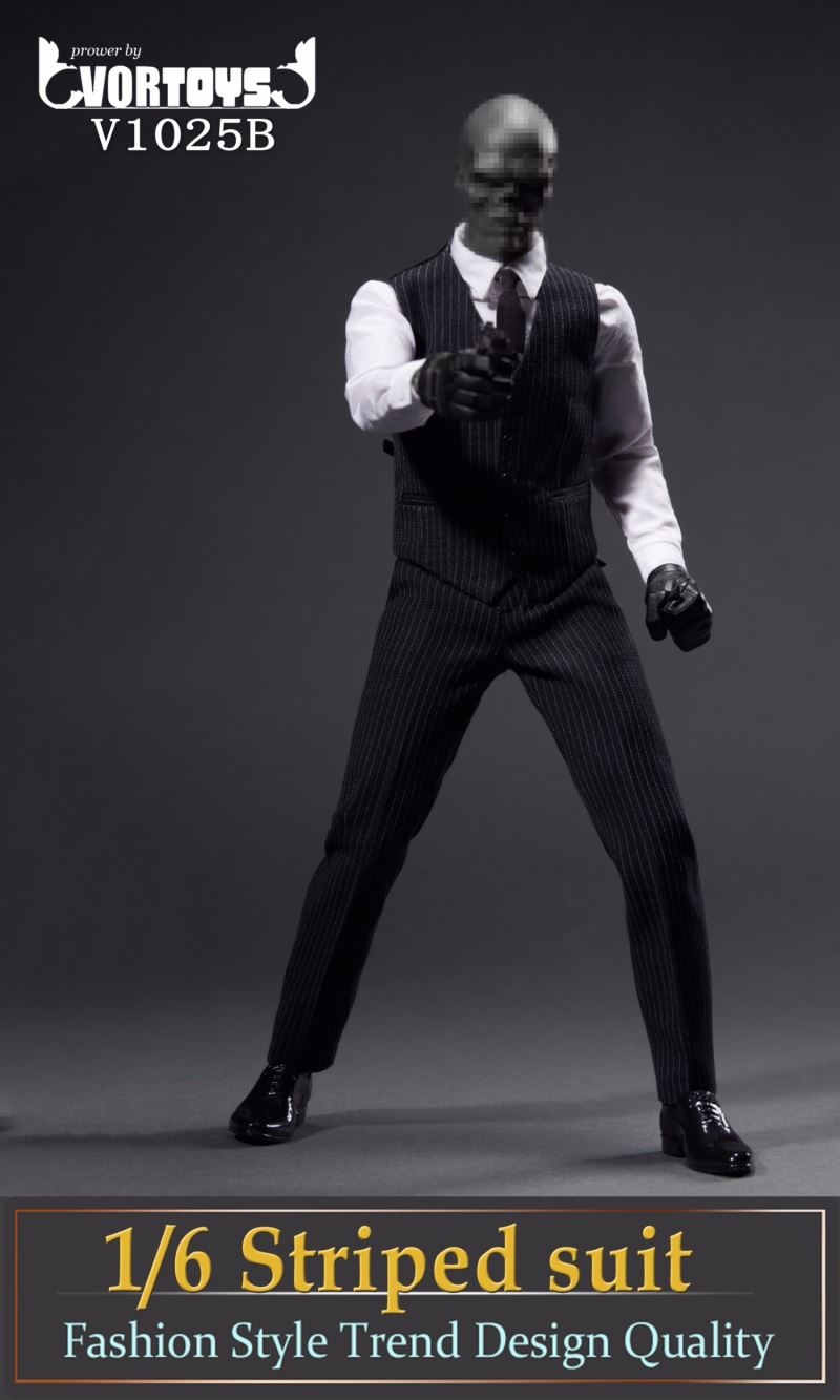 Brand: VORTOYSName: Men's Striped Suit SuitsNumber: V1025A V1025BList:Suit Jacket (A striped white and B striped black)shirt,waistcoat,trousers,tie,belt,leather shoesDescription: The narrow-shoulder body with COOMODEL has the best effect (pictured) The template is COOMODEL BD001 body).