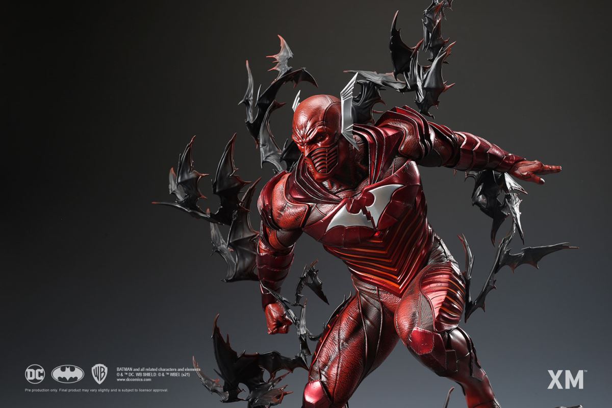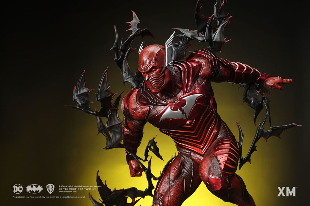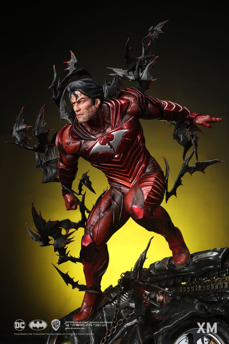 รูปปั้นศิลปะมรณะแดงที่สะสมได้ทำให้การกำเนิดอันน่าหวาดหวั่นและเป็นสัญลักษณ์ของความตายสีแดงในคืนที่มืดมิด: ซีรีส์เมทัลเป็นอมตะ แบทแมนจาก Earth -12 ซึ่งถูกผลักดันไปสู่ความสุดขั้วด้วยความวิกลจริตและความเศร้าโศกของเขาในขณะที่เขาล้มเหลวในการกอบกู้โลกของเขา ล่าม The Flash ไว้กับหมวกของ Batmobile ของเขา (ดัดแปลงเพื่อใช้พลังของลู่วิ่งจักรวาล) และขับเคลื่อนตัวเองและ The Flash เข้าสู่หน่วยความเร็ว ที่เปลี่ยนทั้งสองให้เป็นหนึ่งเดียว เดอะแฟลชนั่งเบาะหลังซึ่งติดอยู่ในจิตสำนึกและร่างกายของบรูซ ขณะที่บรูซใช้ความสามารถของเดอะแฟลช ด้วยเหตุนี้ Red Death จึงถือกำเนิดขึ้น