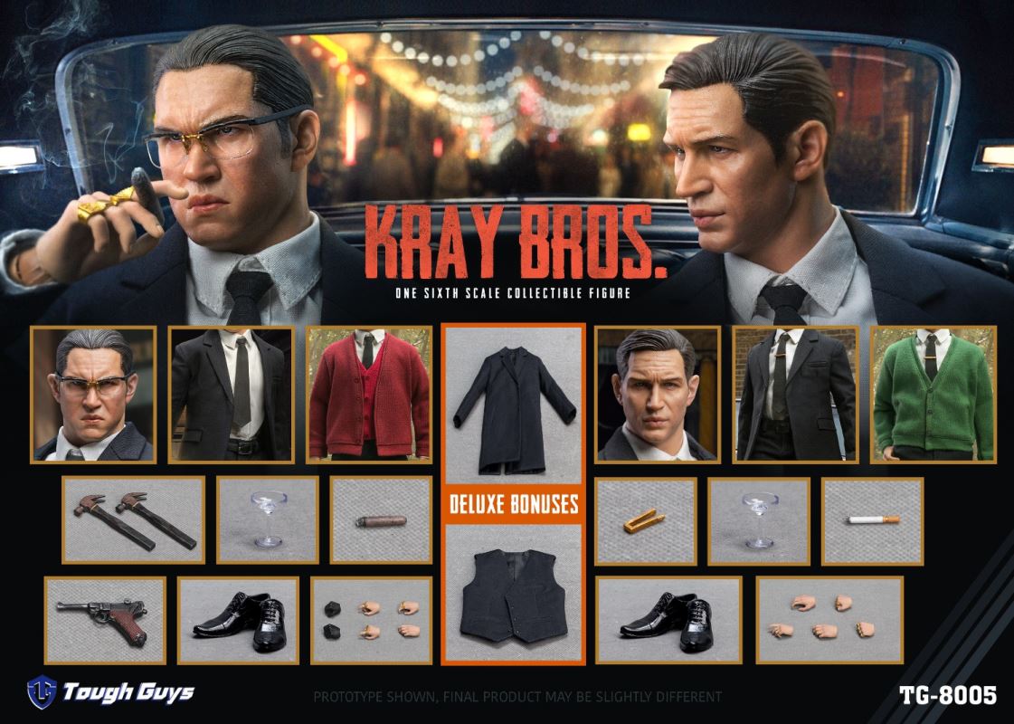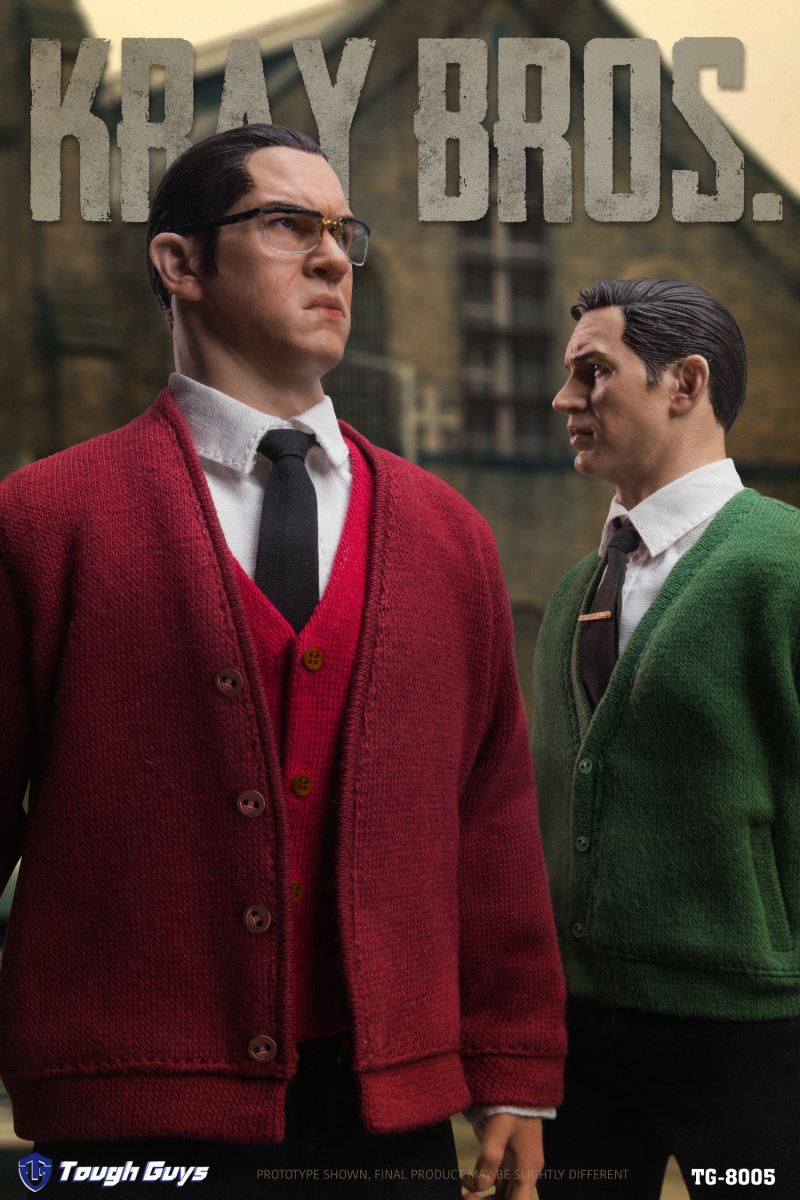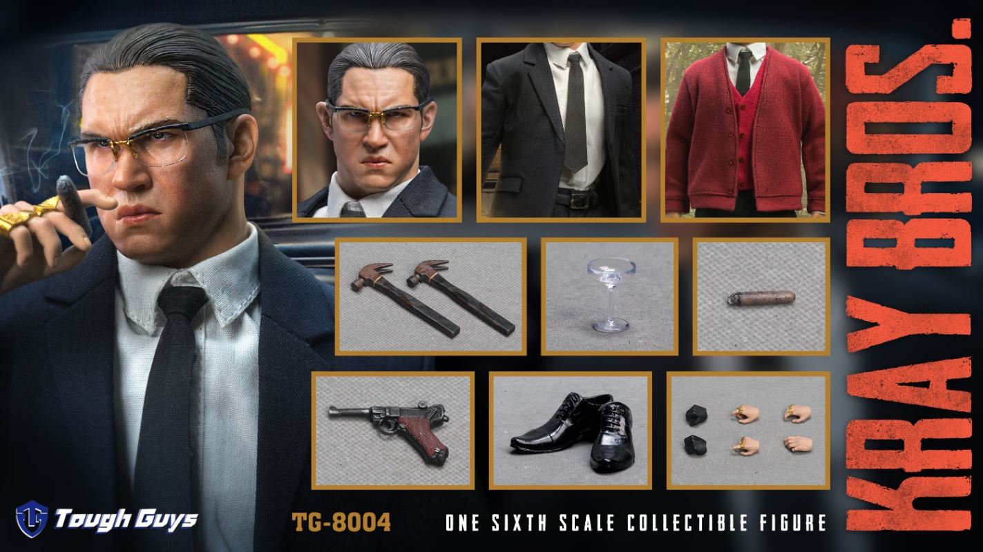 Tough Guys 1/6 kraybros A TG-8003-Head sculpt×1-Movable body×1-Suit top×1-Suit pants×1-White shirt×1-Tie×1-Belt×1-Tie clip×1-Leather shoes×1 pair-Green sweater×1-Wine glass×1-Cigarette×1-Special hand type×5=================Tough Guys 1/6 kraybros B TG-8004-Head sculpt×1-Movable body×1-Suit top×1-Suit pants×1-White shirt×1-Tie×1-Belt×1-Leather boots×1 pair-Red sweater×1-Red vest×1-Wine glass×1-Cigar×1-Hammer×2-Pistol×1-Special hand type×6=================Tough Guys 1/6 kraybros A+B TG-8005Shipment date: Second quarter of 2022Purchase AB at the same time, you can get the following gifts based on the original accessories:-Coat×1-Vest × 1