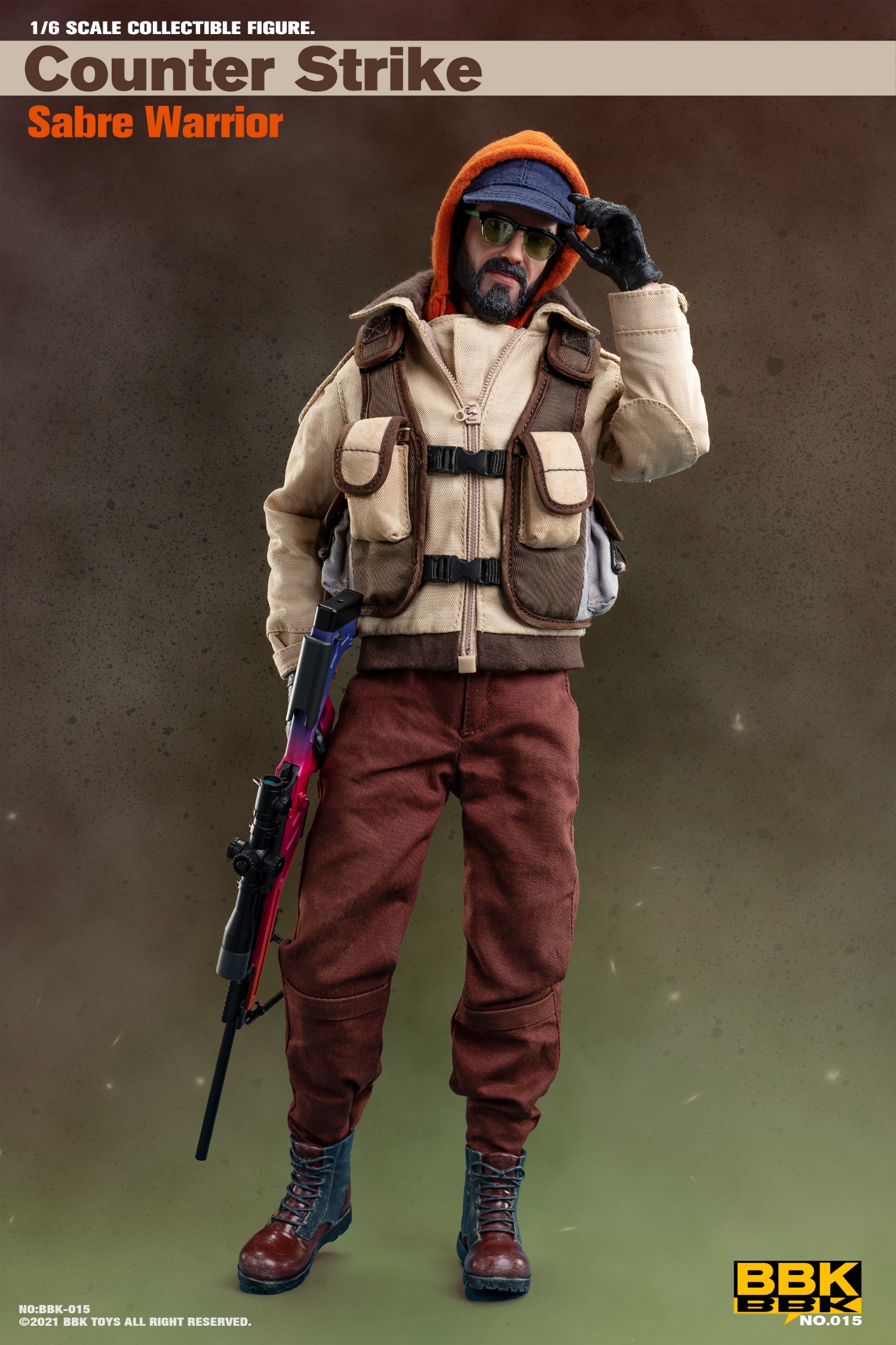 New BBK products: 1/6 #BBK015 Counter Strike Saber Warrior doll model1. Head sculpture2. Body3. Glasses4. Saber5. Pistol6. Pistol magazine*17. Sniper rifle8. Sniper bullet Clip*19. Peaked cap10. Glove hand*111. Hand type* 2 pairs12. Bulletproof vest13. Sight14. Sweater15. Coat16. Pants17. Shoes18. Diagonal bag * 2 19. Waist pack